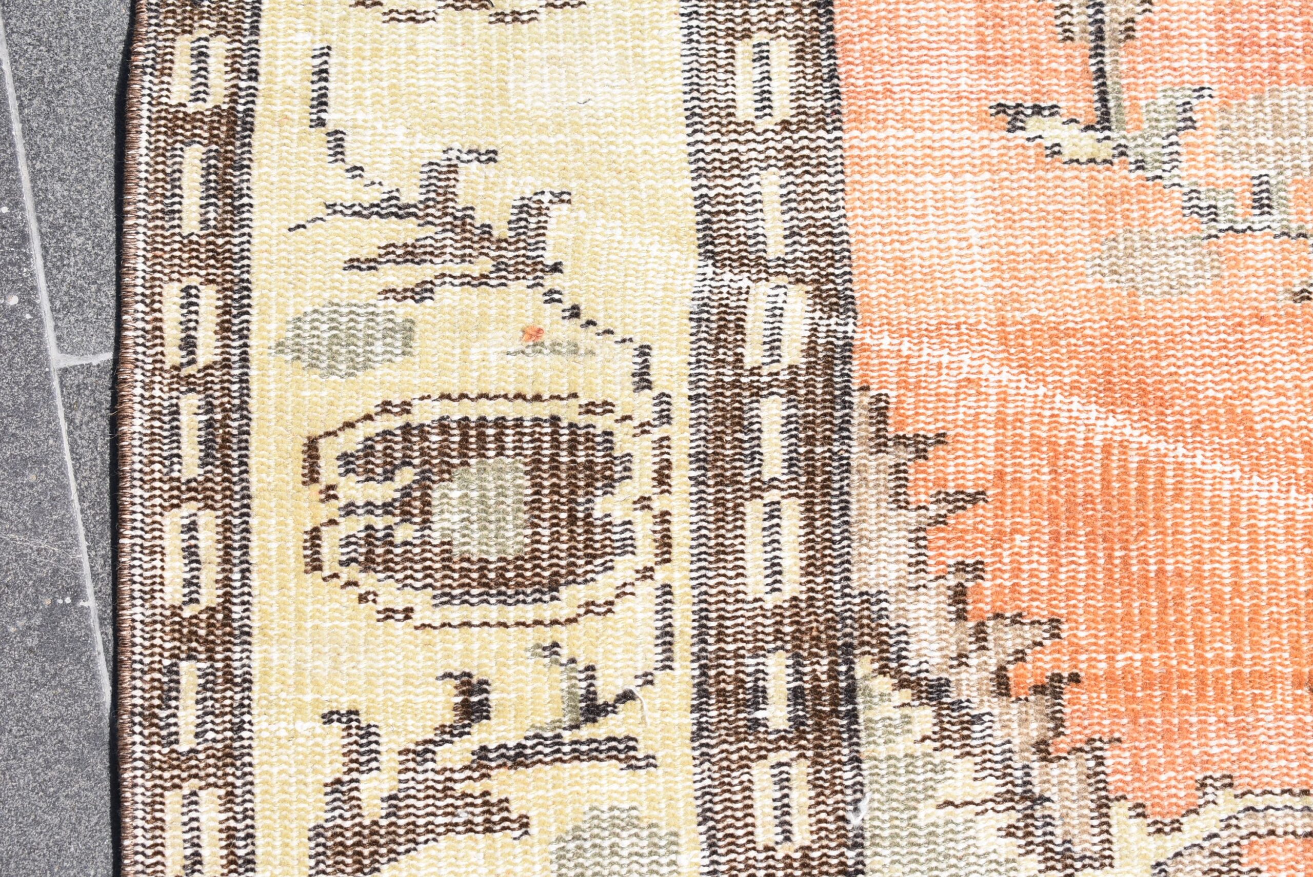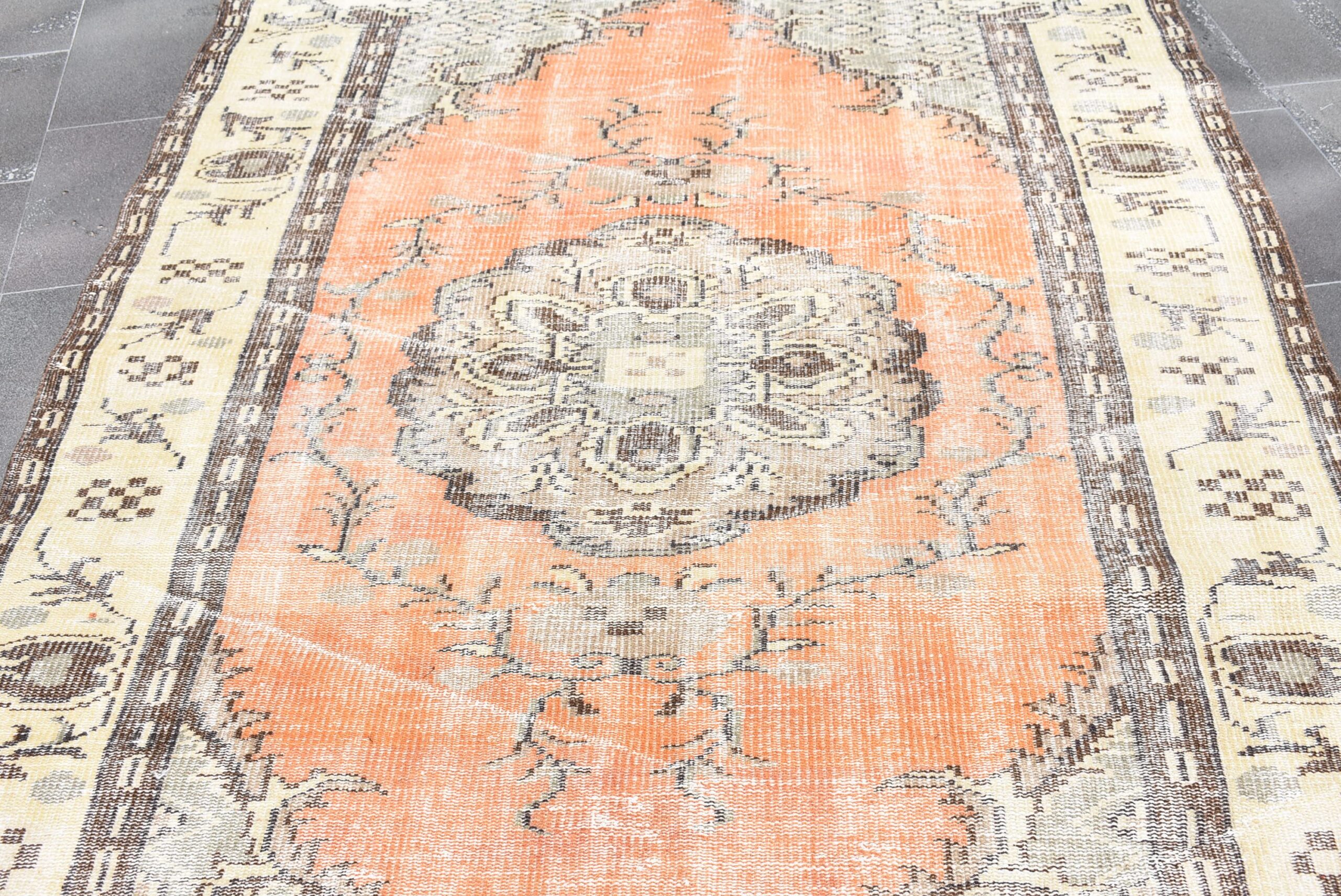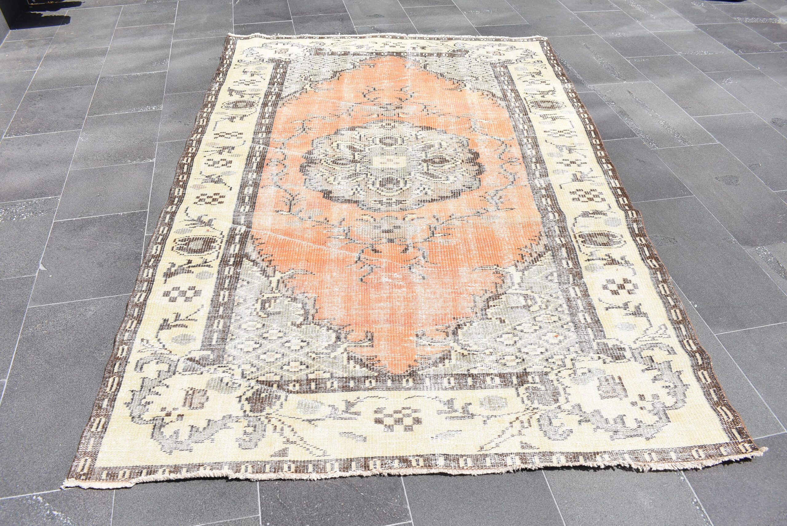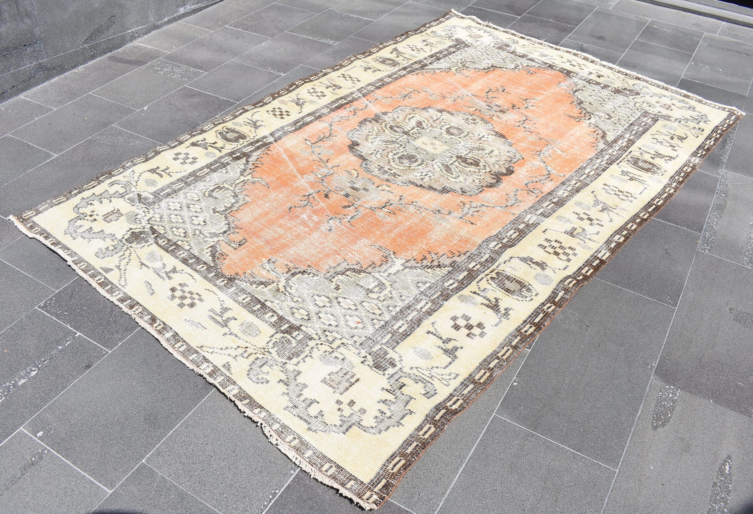 This is a vintage Turkish rug hand-knotted in a small village in Turkey by skilled Anatolian women during around the 1970s. It is made from natural wool (sheep) and dyed using all-natural (vegetable) dyes. Natural materials are more durable than synthetic materials guaranteeing a rug that can last for years while natural dyes provide colors that gets more beautiful as years pass by especially when in direct sunlight.