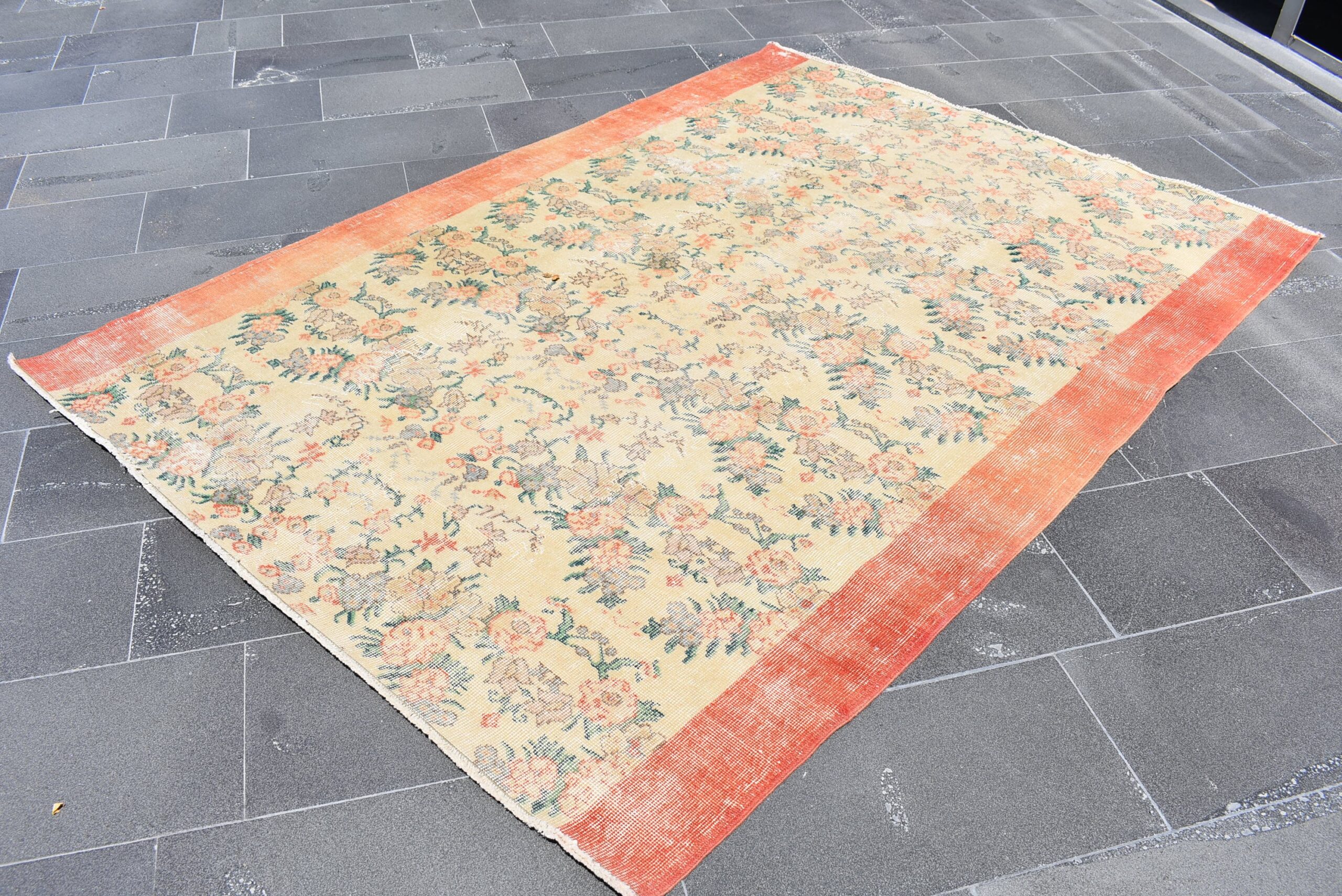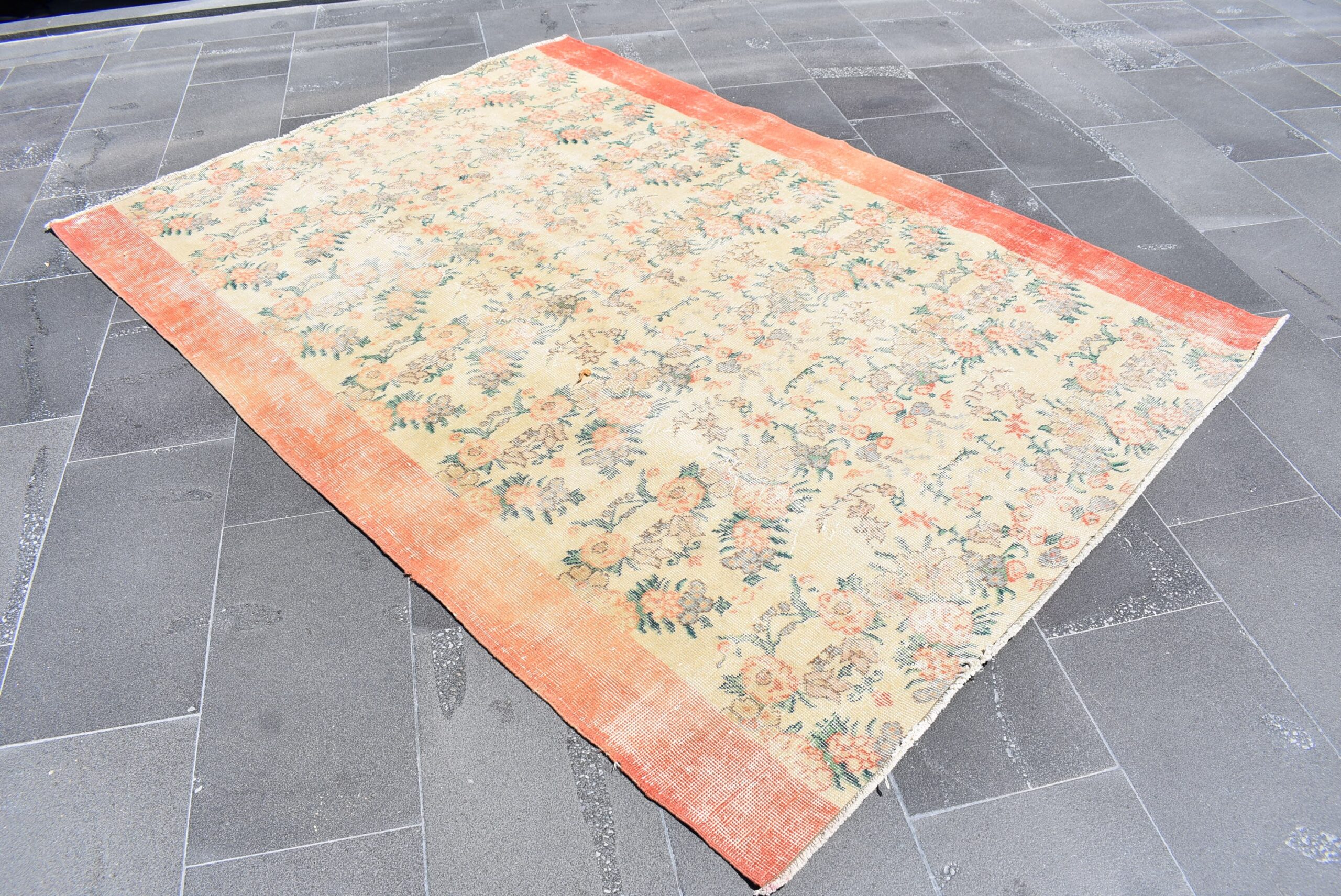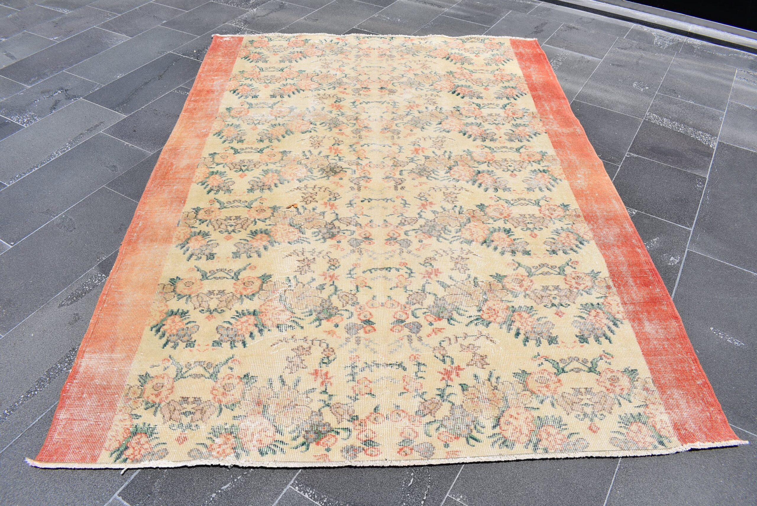 This is a vintage Turkish rug hand-knotted in a small village in Turkey by skilled Anatolian women during around the 1980s. It is made from natural wool (sheep) and dyed using all-natural (vegetable) dyes. Natural materials are more durable than synthetic materials guaranteeing a rug that can last for years while natural dyes provide colors that gets more beautiful as years pass by especially when in direct sunlight.