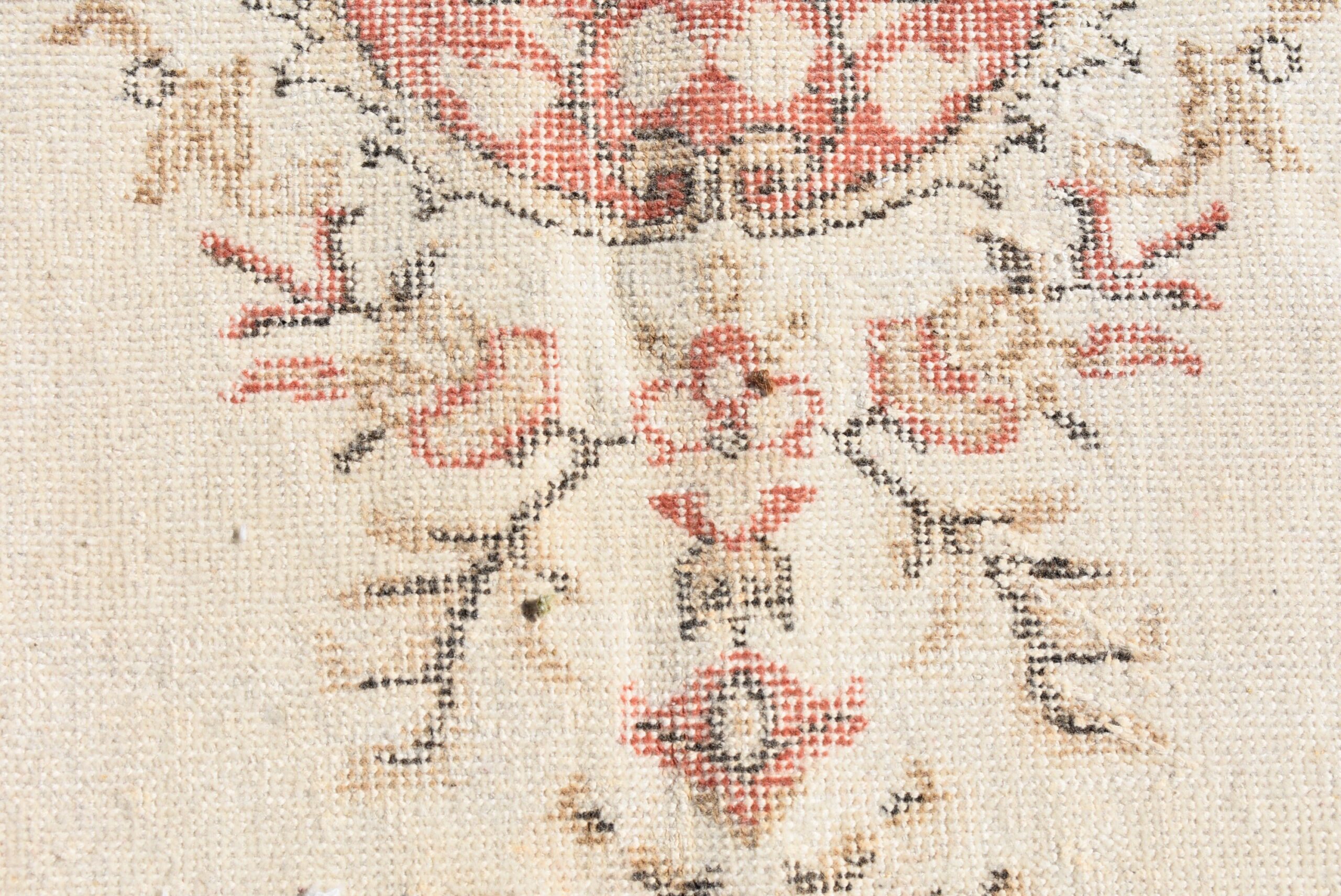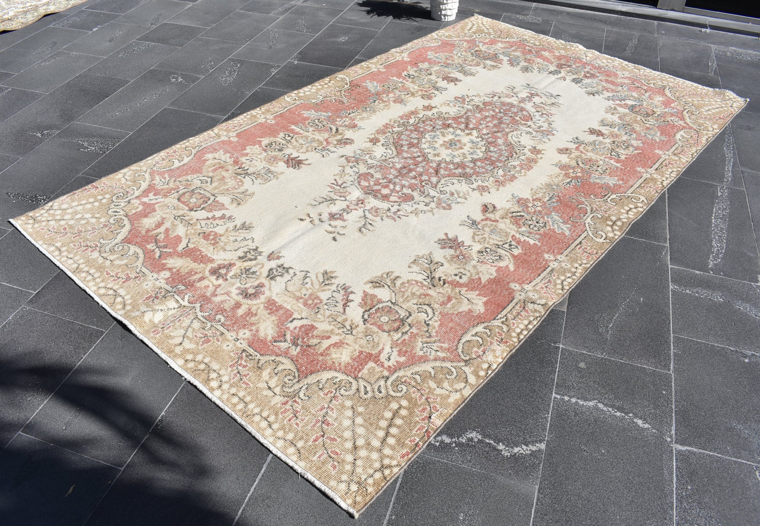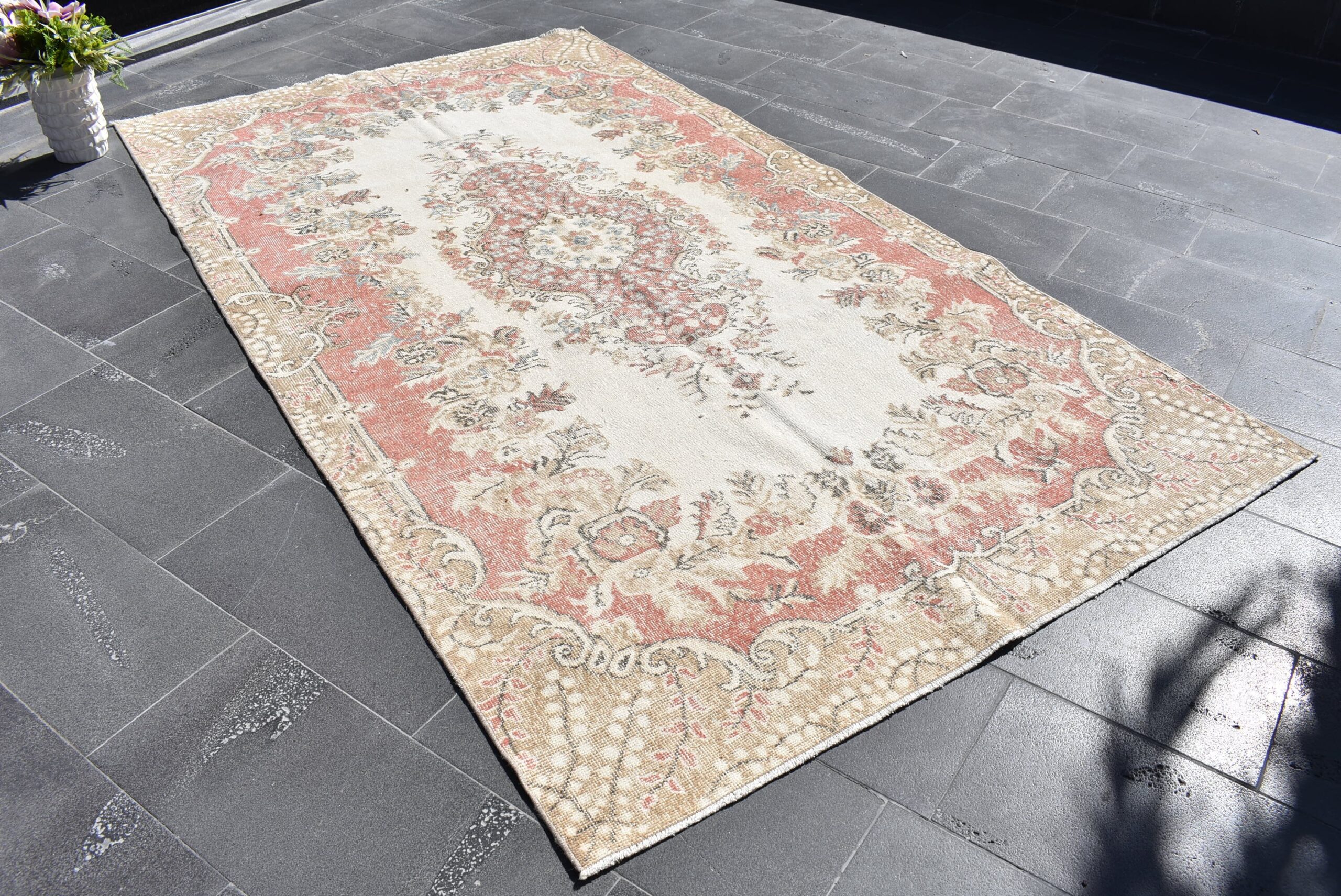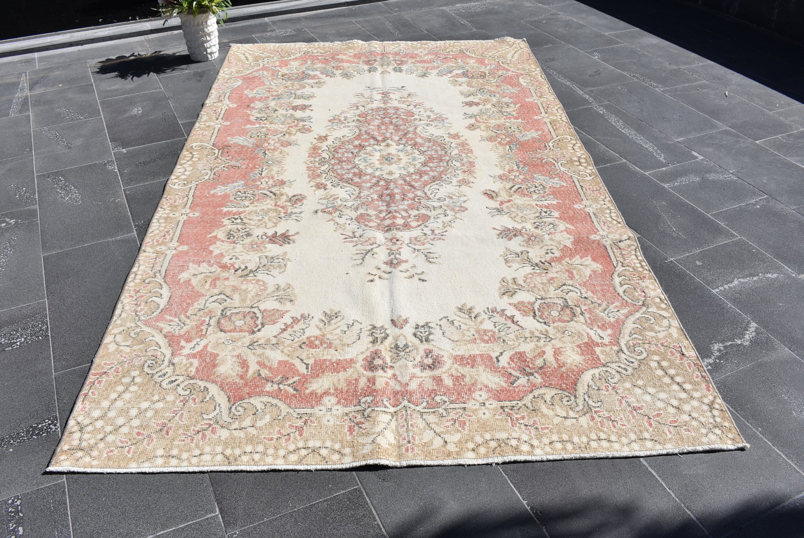 This is a vintage Turkish rug hand-knotted in a small village in Turkey by skilled Anatolian women during around the 1990s. It is made from natural wool (sheep) and dyed using all-natural (vegetable) dyes. Natural materials are more durable than synthetic materials guaranteeing a rug that can last for years while natural dyes provide colors that gets more beautiful as years pass by especially when in direct sunlight.