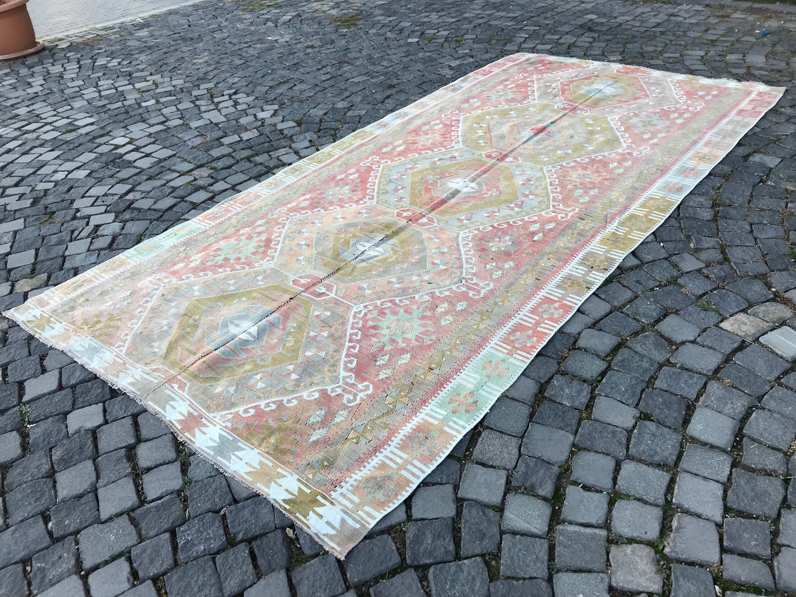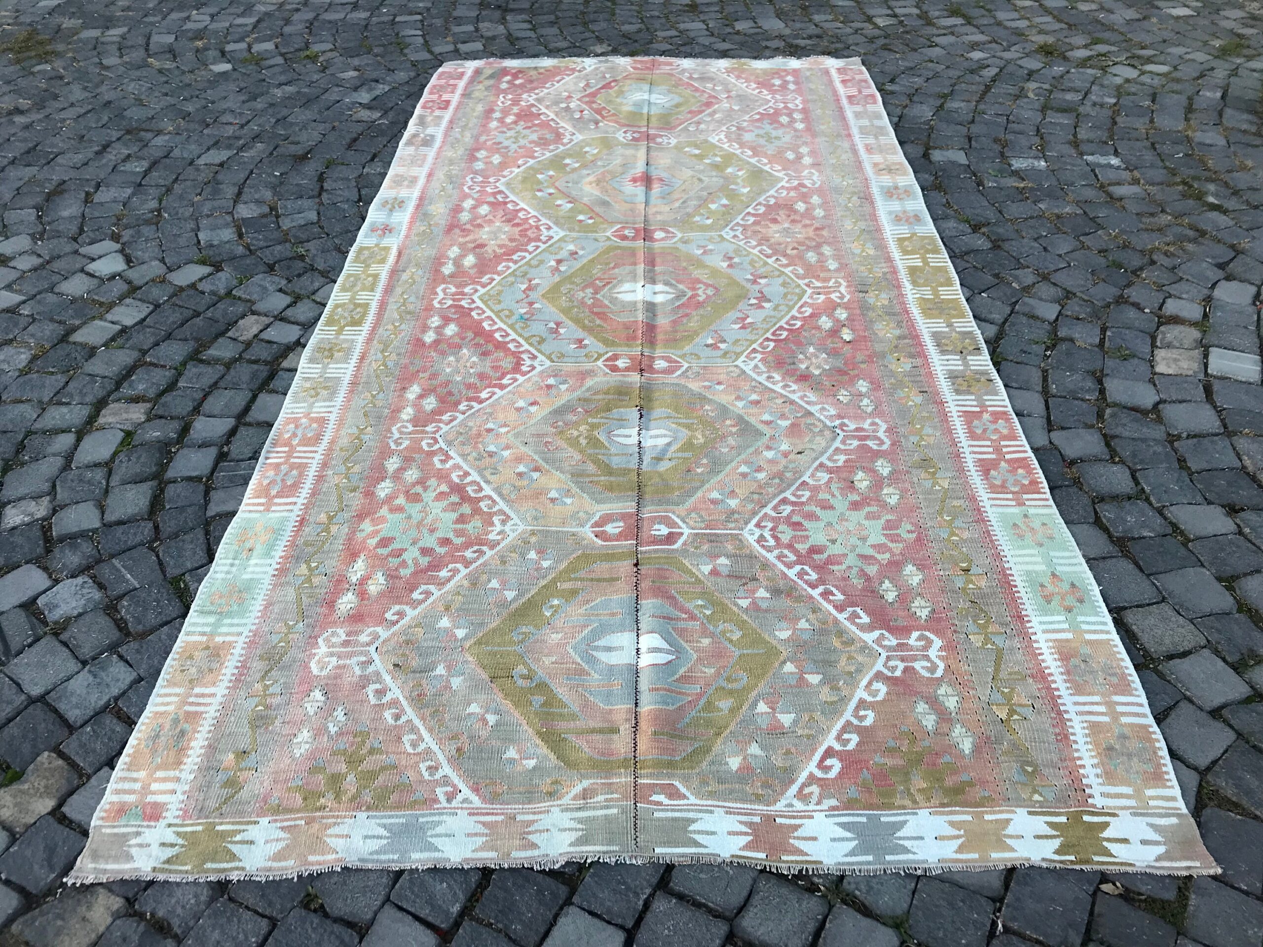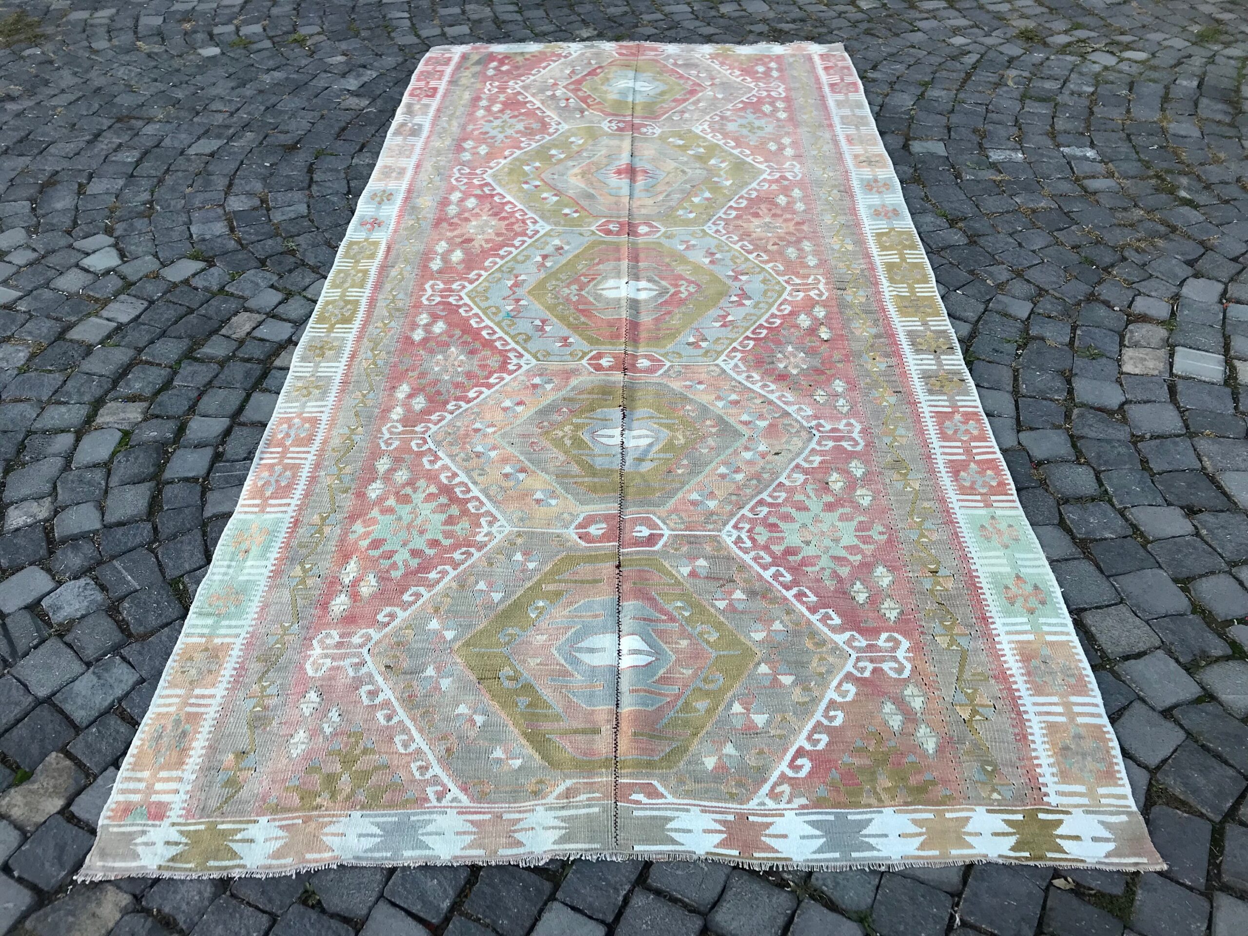 Pretty and one-of-a-kind 5.4 ft. x 11.1 ft. (166 cm x 339 cm) vintage kilim rug hand-woven in Turkey from organic wool. This is an authentic vintage kilim rug from the 1970s that has worn splendidly to perfection.