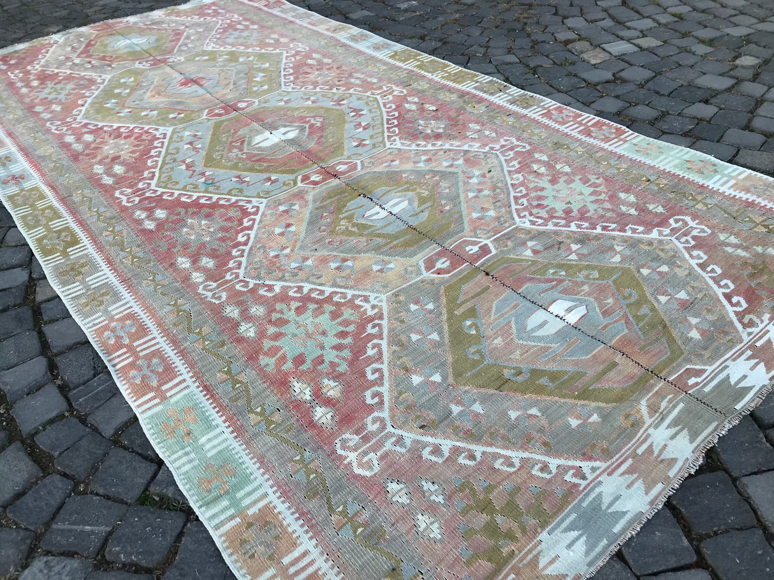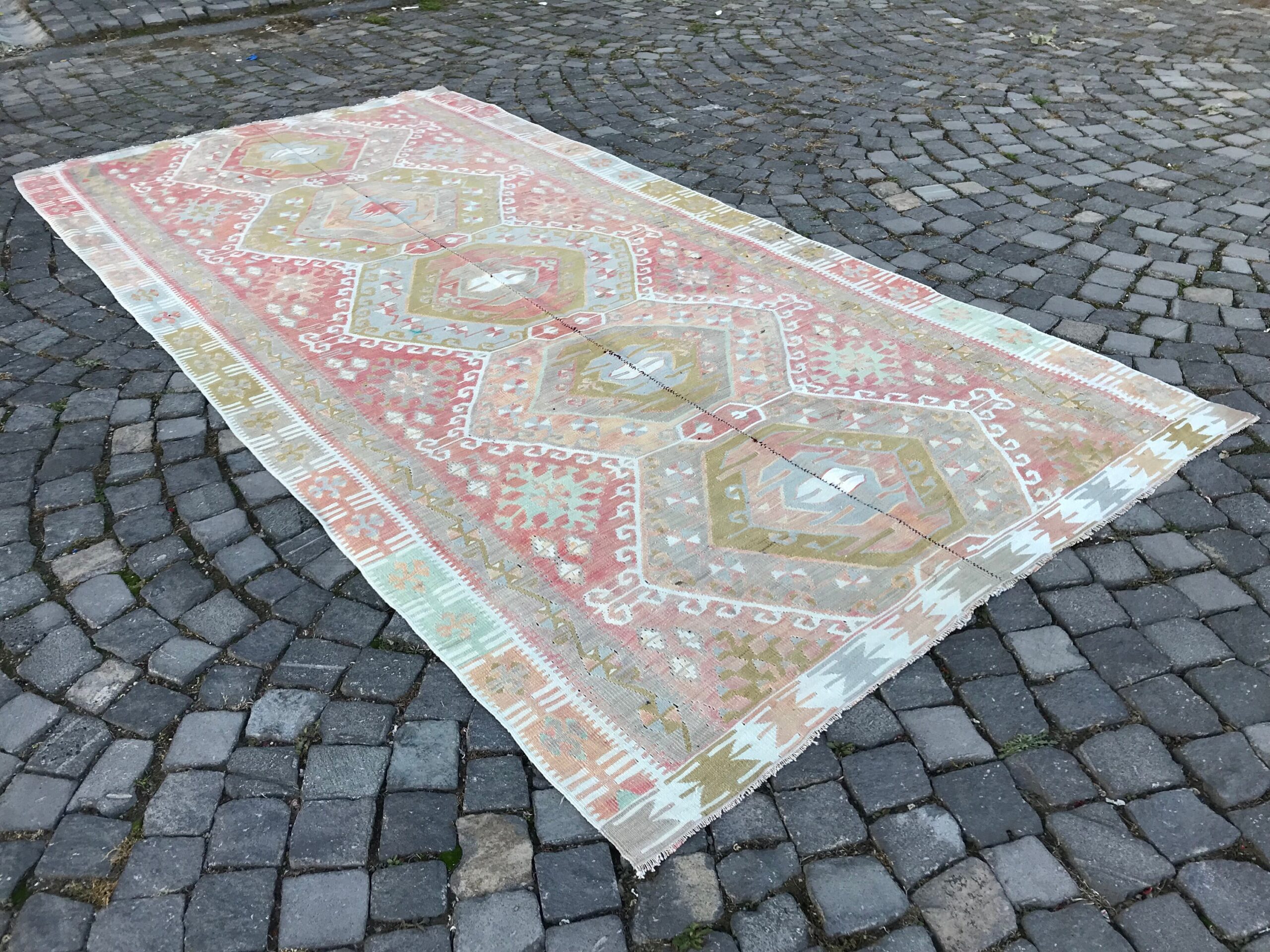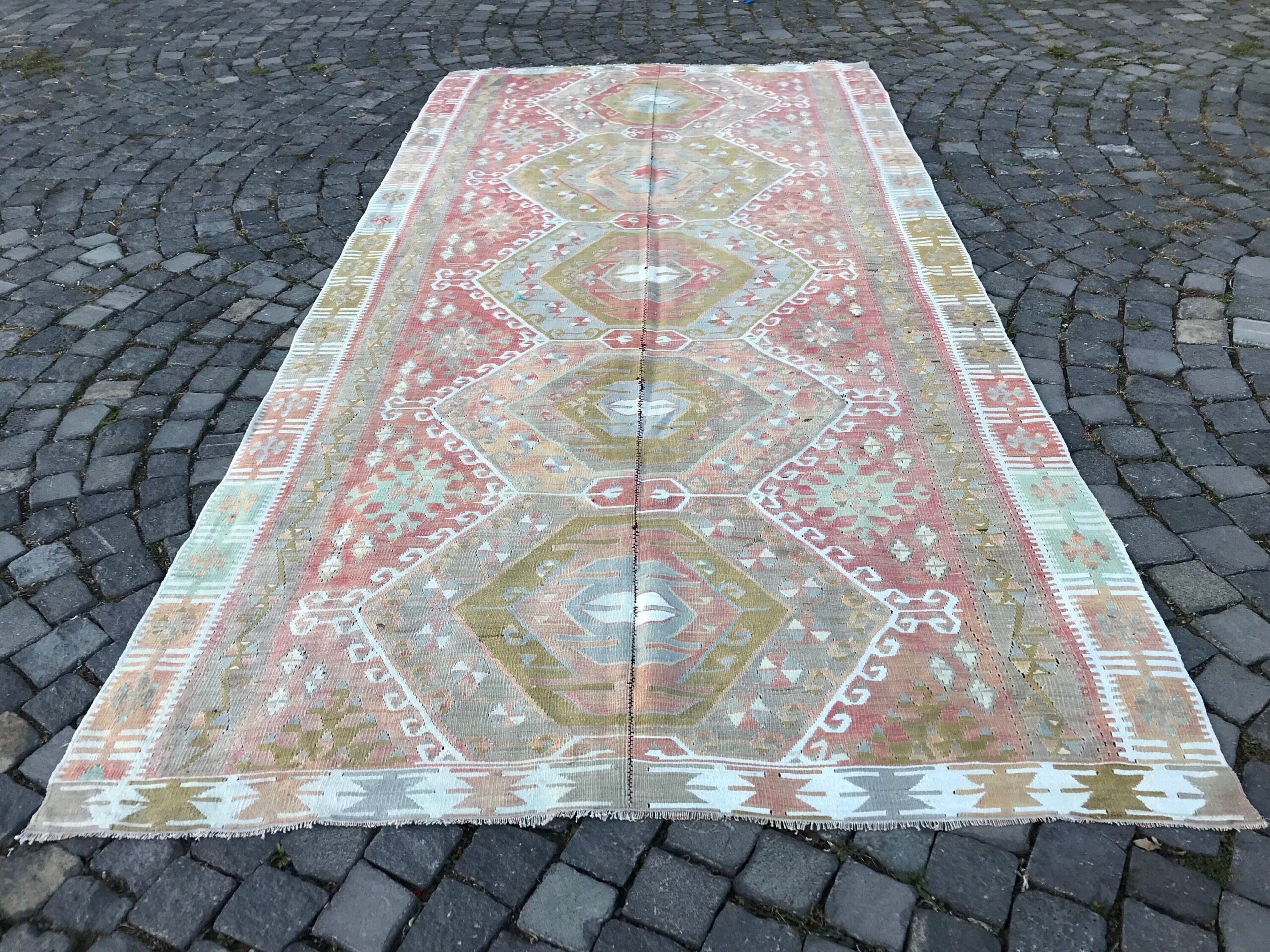 Pretty and one-of-a-kind 5.4 ft. x 11.1 ft. (166 cm x 339 cm) vintage kilim rug hand-woven in Turkey from organic wool. This is an authentic vintage kilim rug from the 1970s that has worn splendidly to perfection.