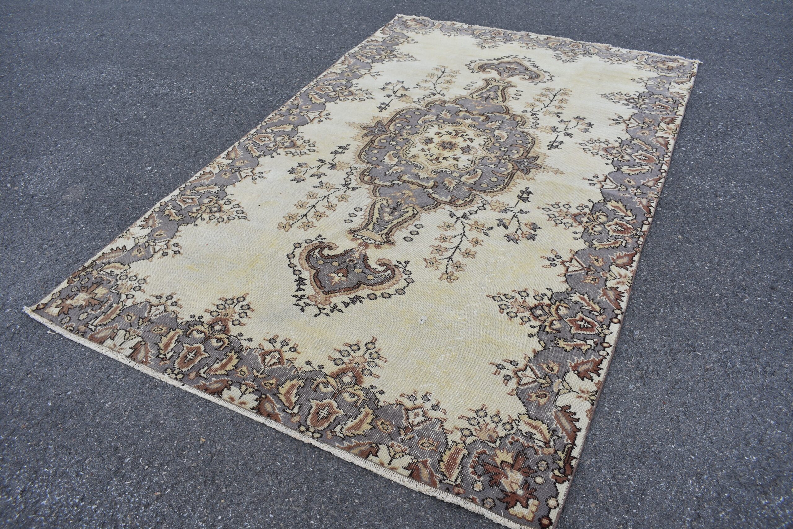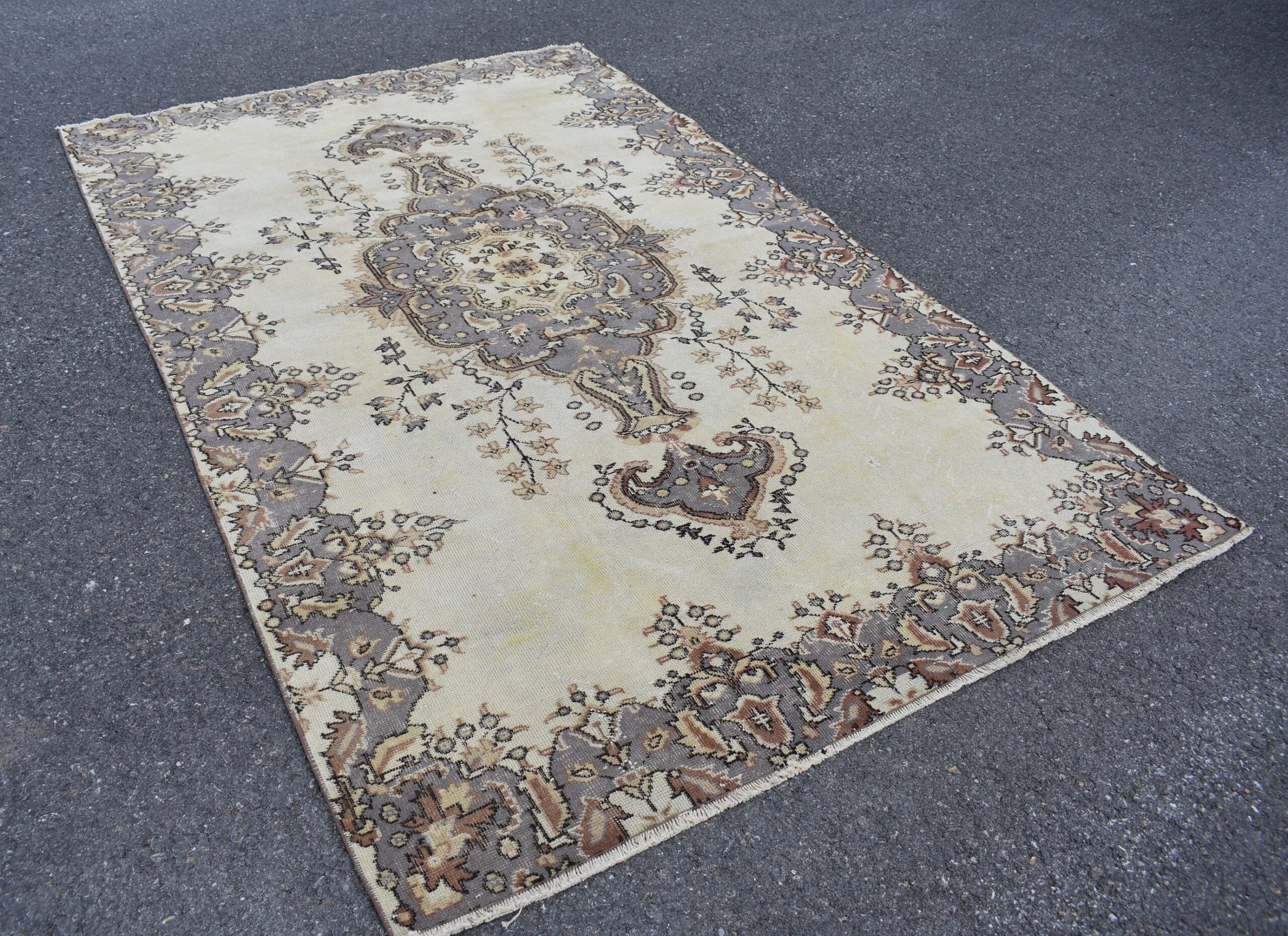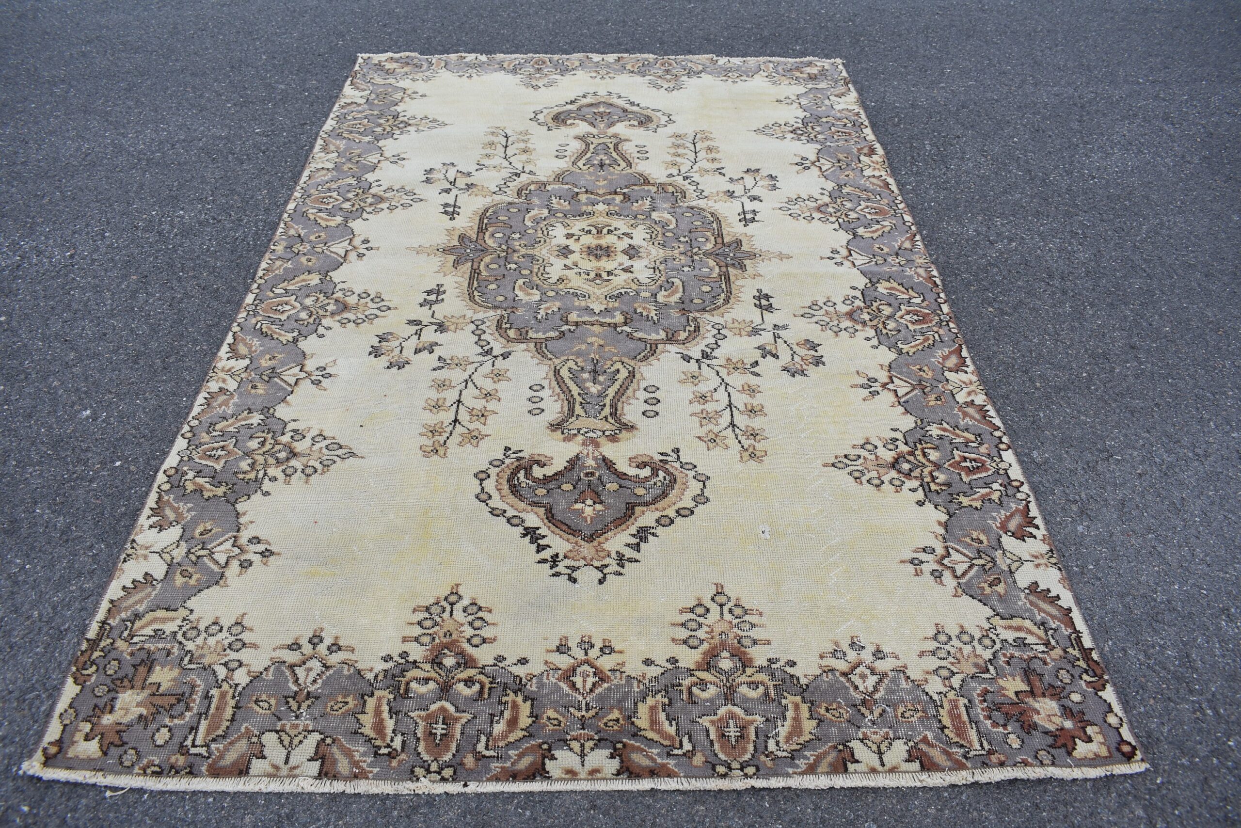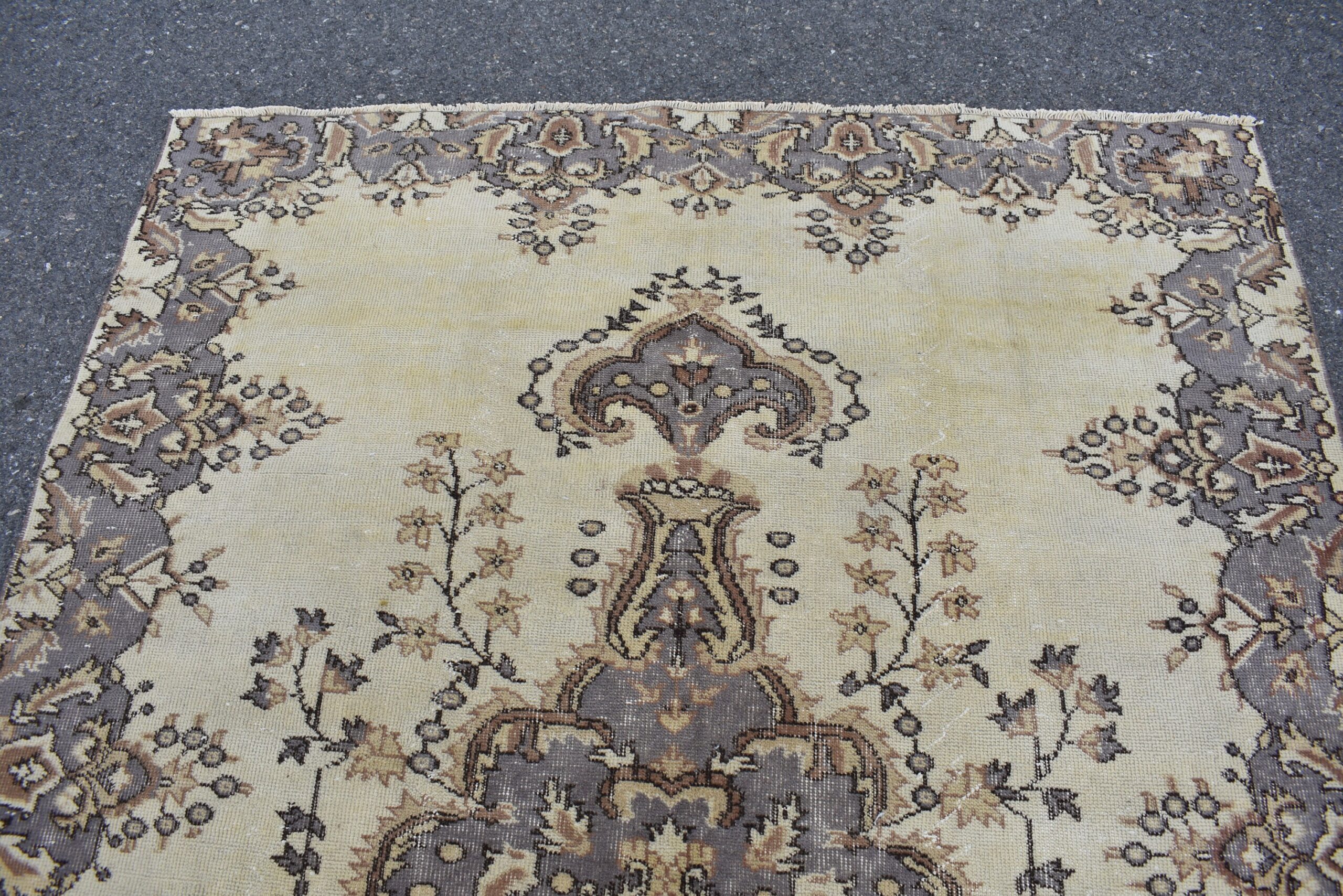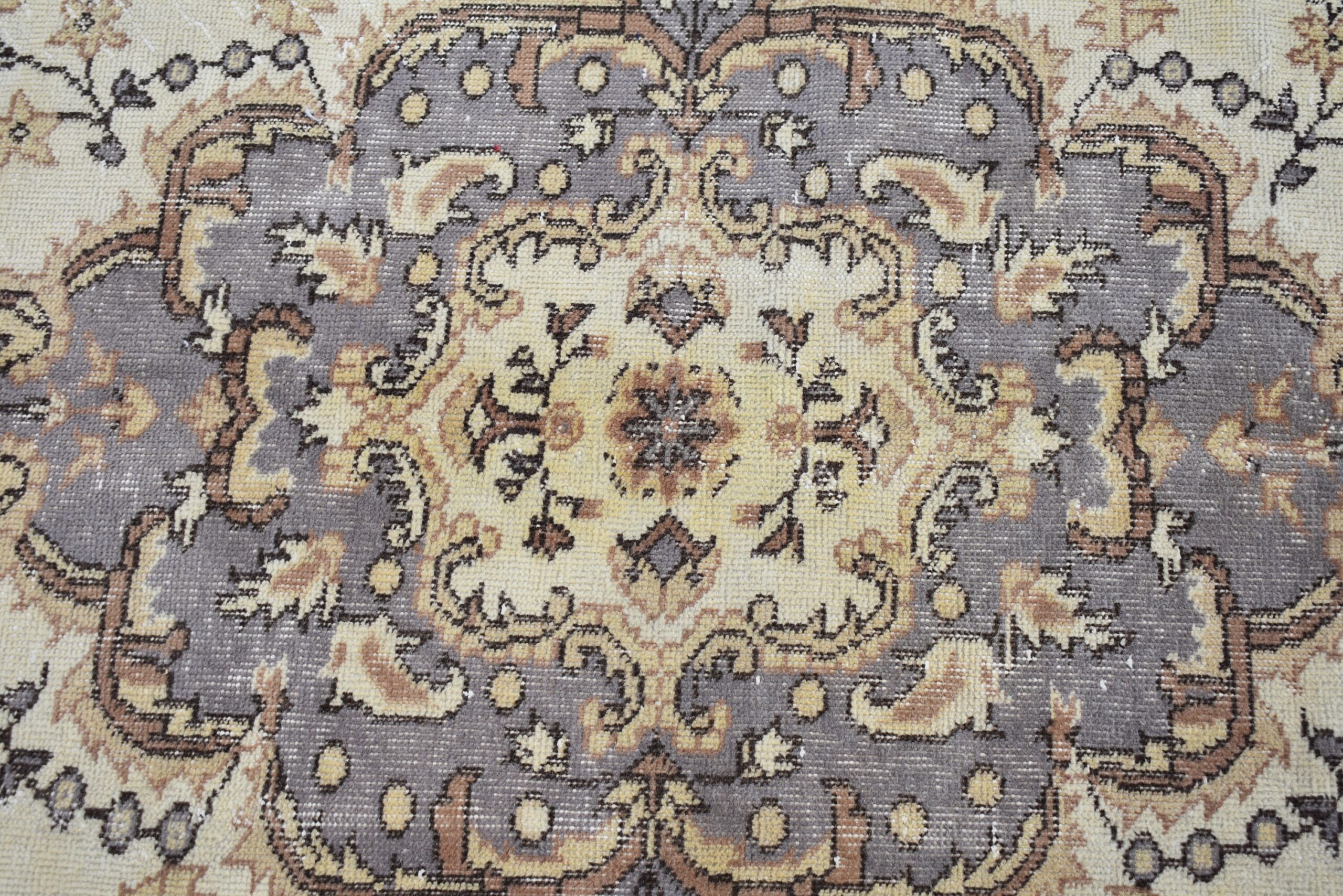 This is a vintage Turkish rug hand-knotted in a small village in Turkey by skilled Anatolian women during around the 1980s. It is made from natural wool (sheep) and dyed using all-natural (vegetable) dyes. Natural materials are more durable than synthetic materials guaranteeing a rug that can last for years while natural dyes provide colors that gets more beautiful as years pass by especially when in direct sunlight.