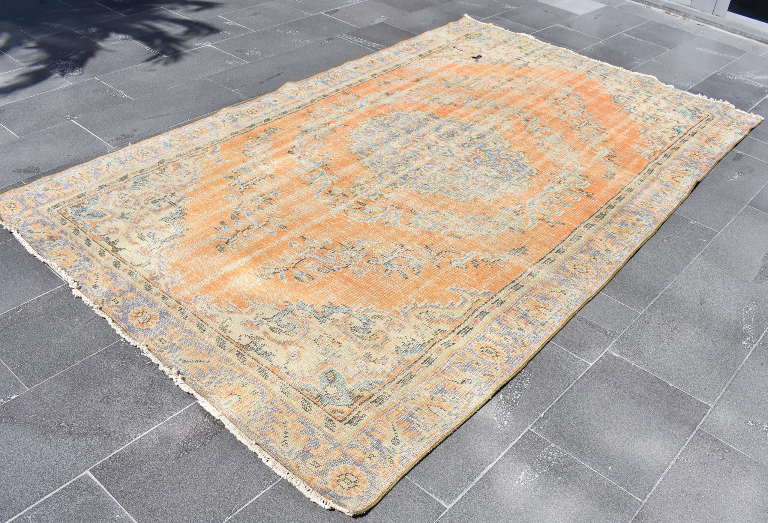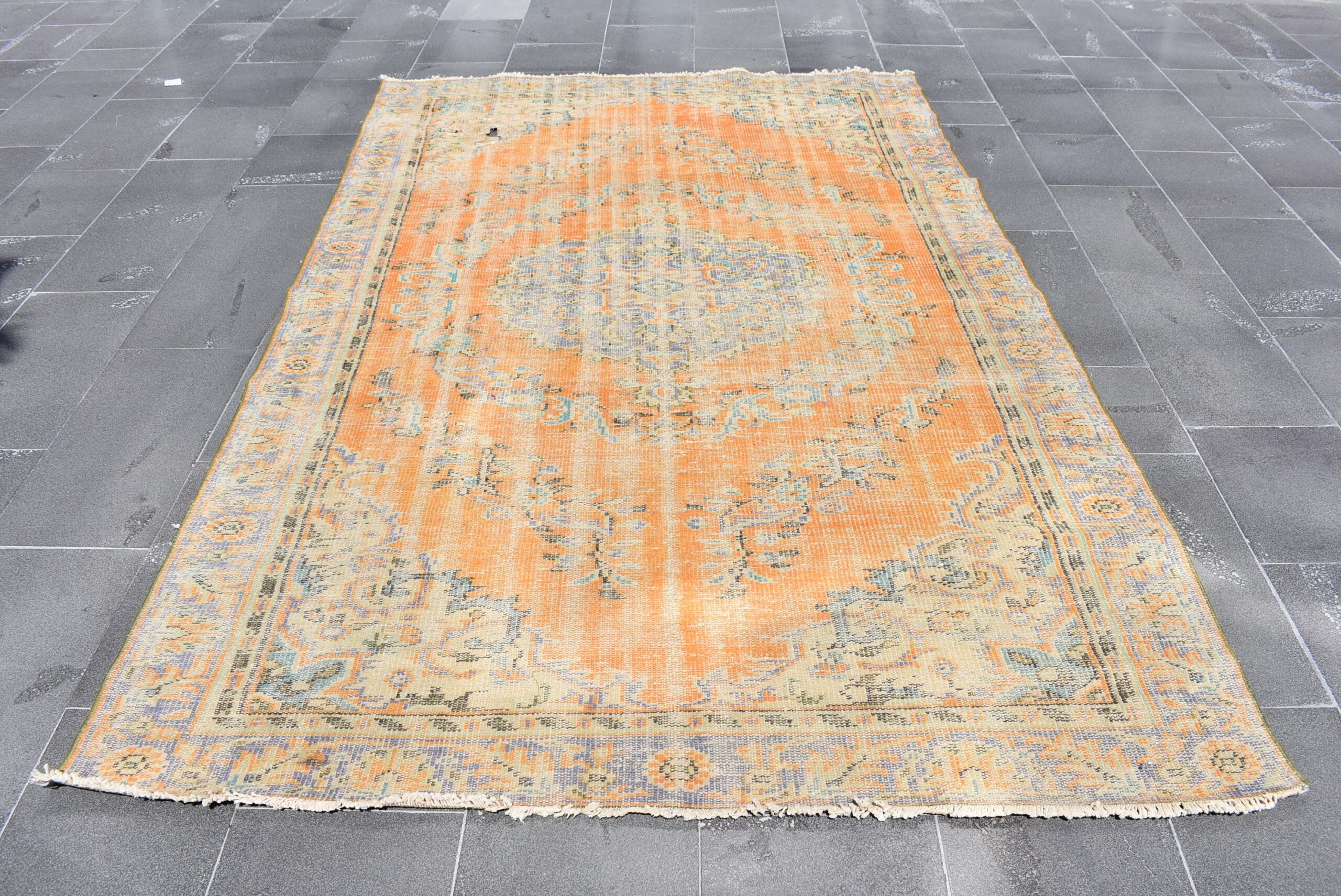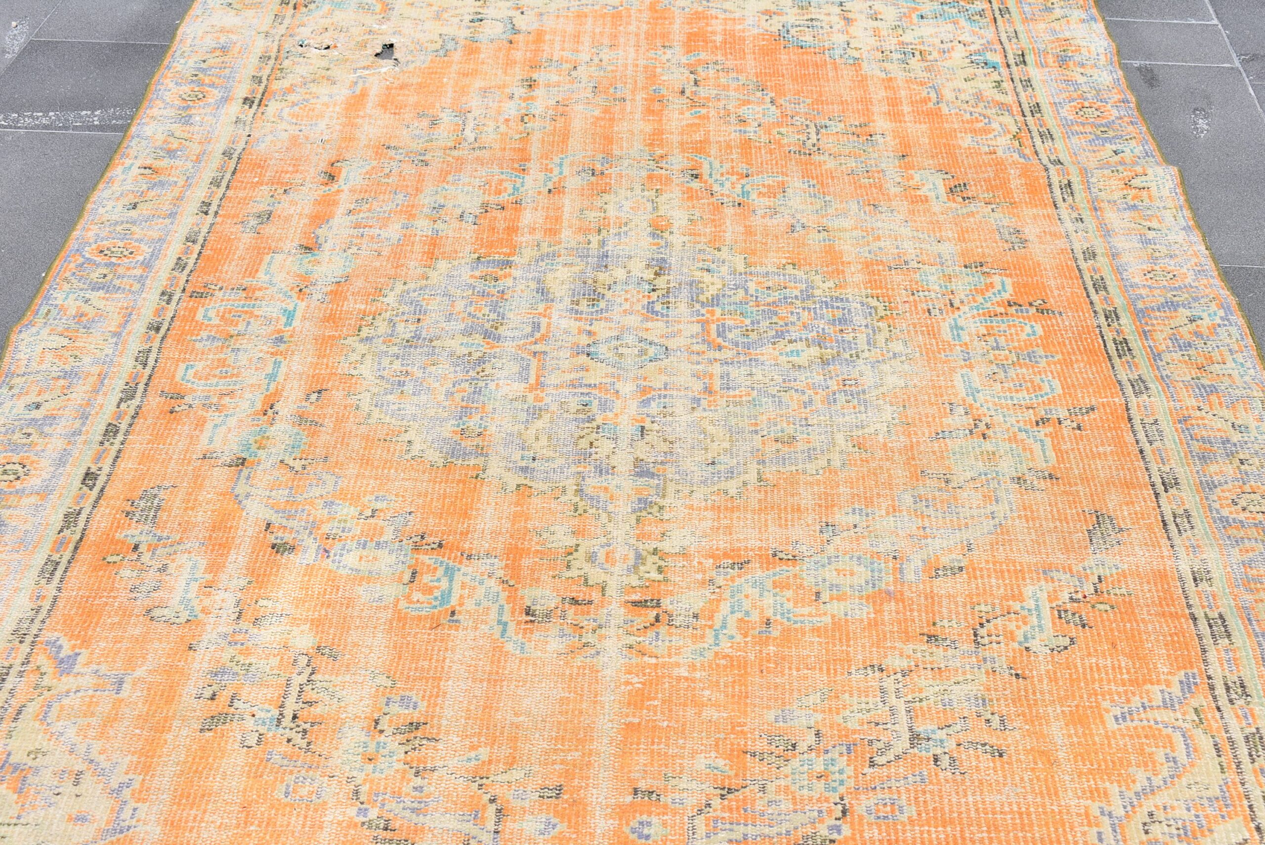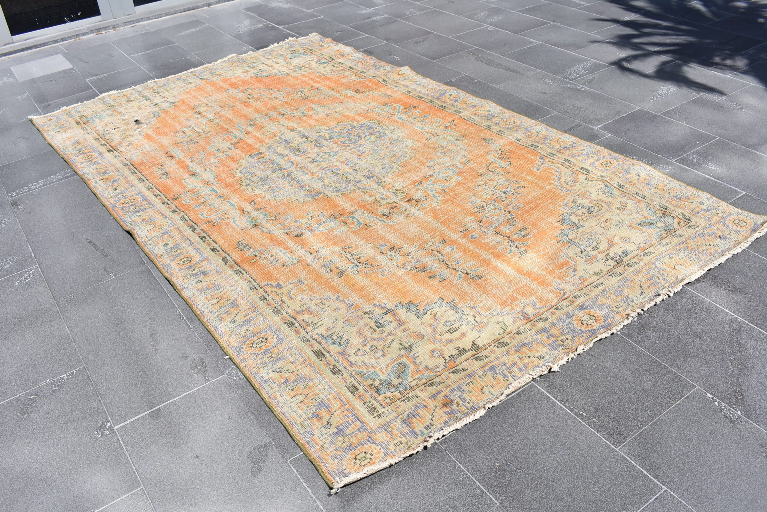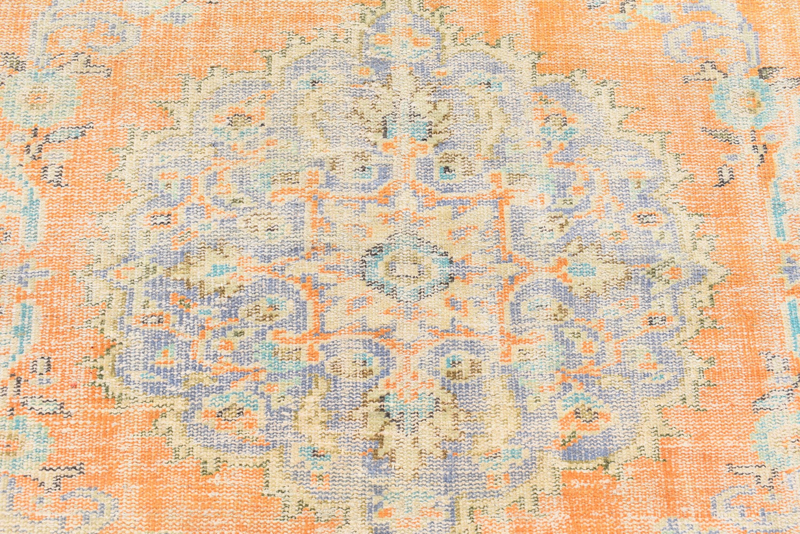 This is a vintage Turkish rug hand-knotted in a small village in Turkey by skilled Anatolian women during around the 1970s. It is made from natural wool (sheep) and dyed using all-natural (vegetable) dyes. Natural materials are more durable than synthetic materials guaranteeing a rug that can last for years while natural dyes provide colors that gets more beautiful as years pass by especially when in direct sunlight.