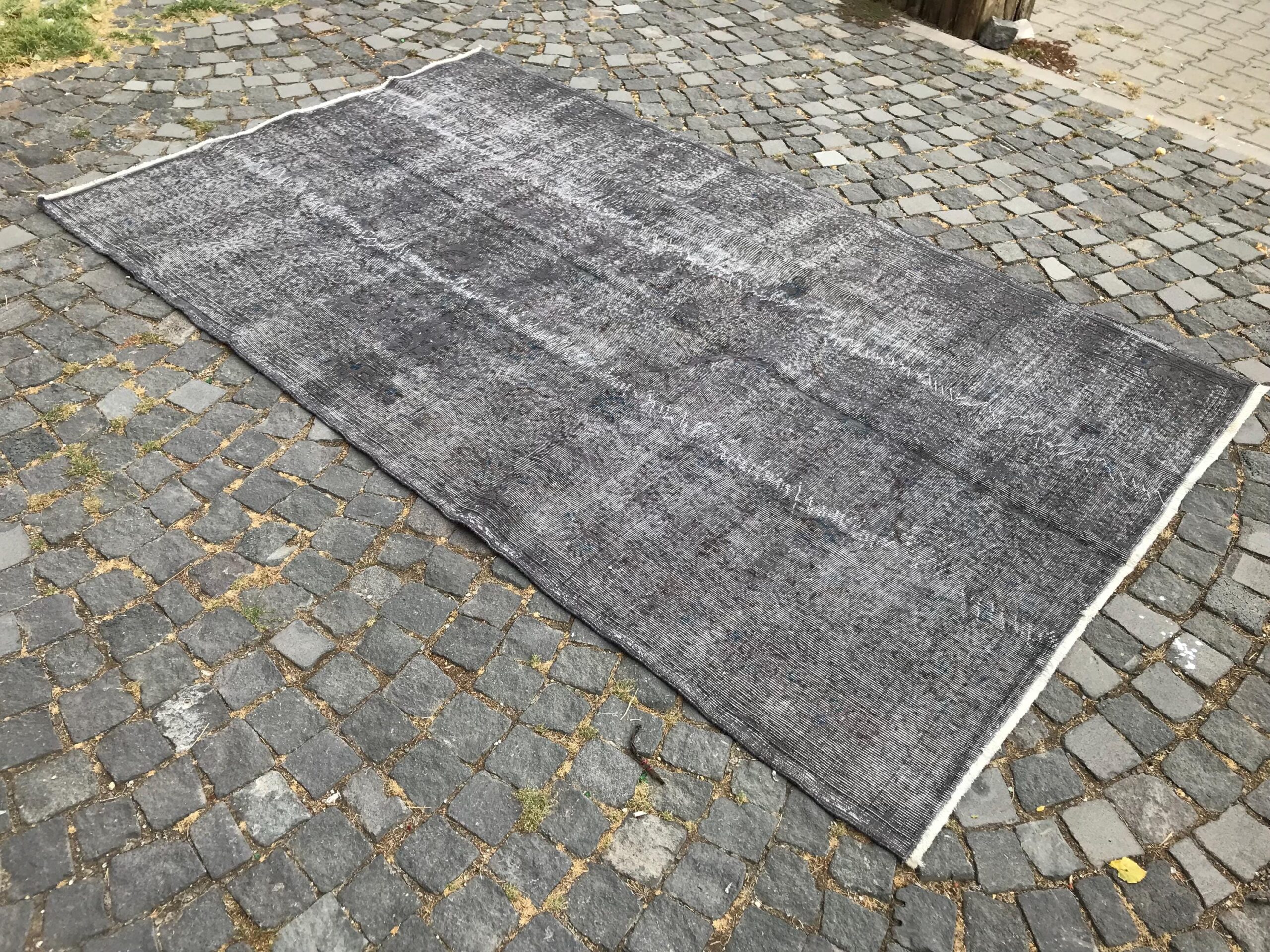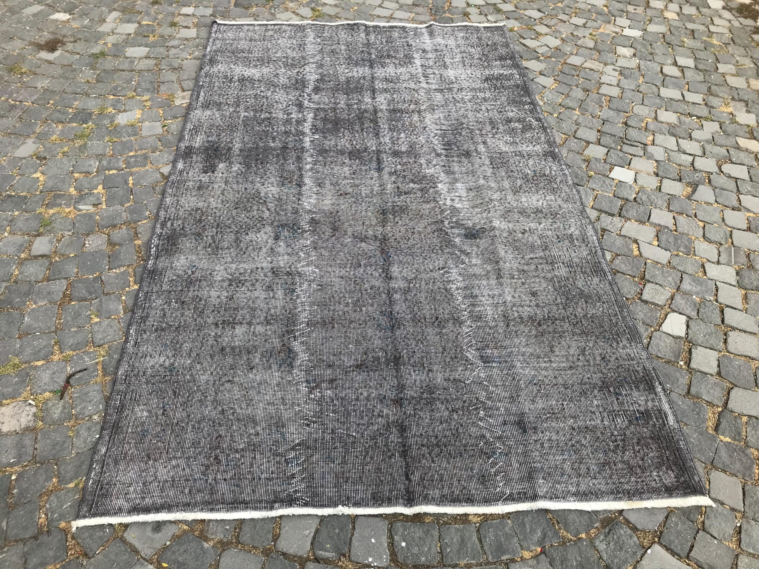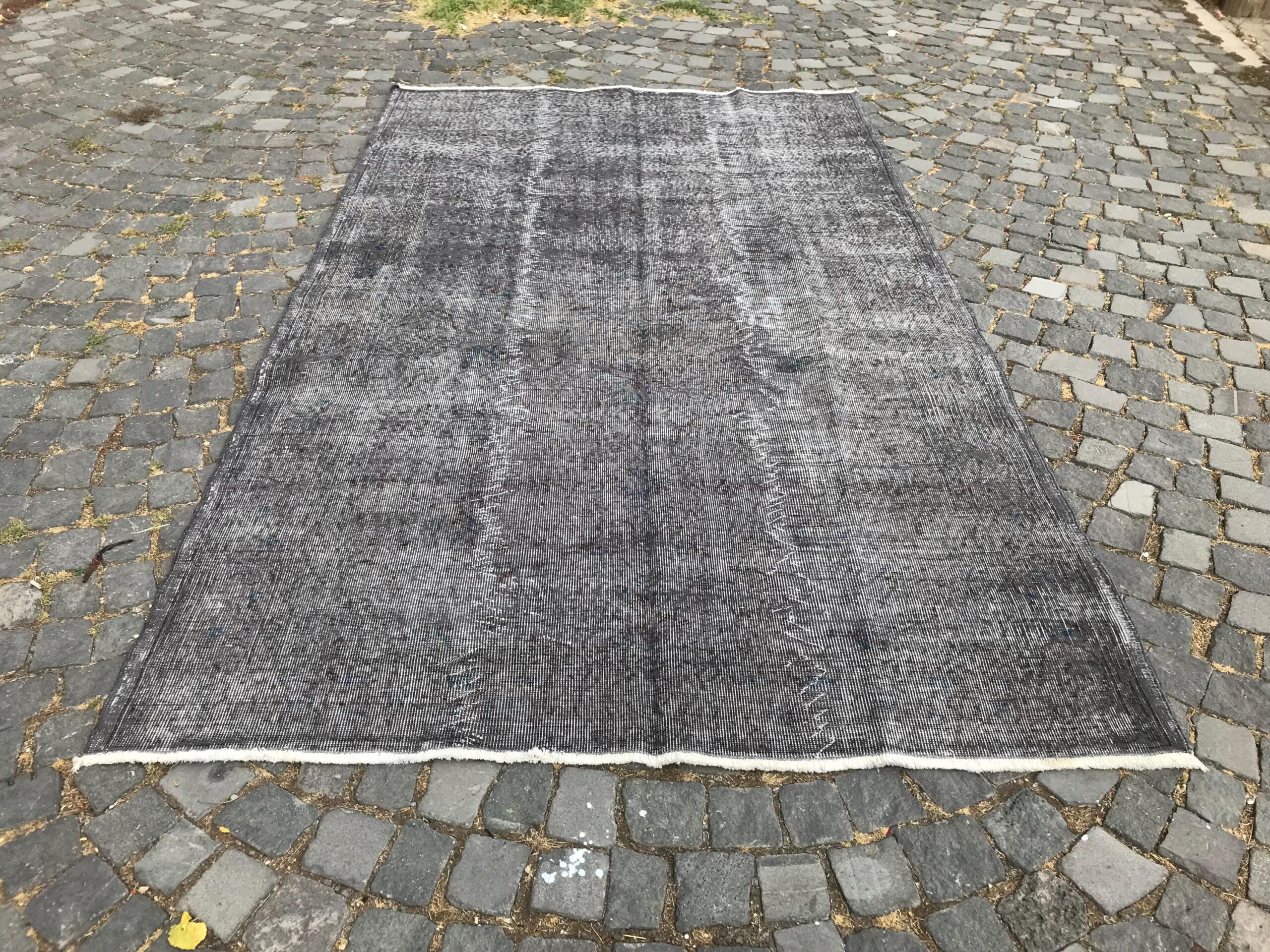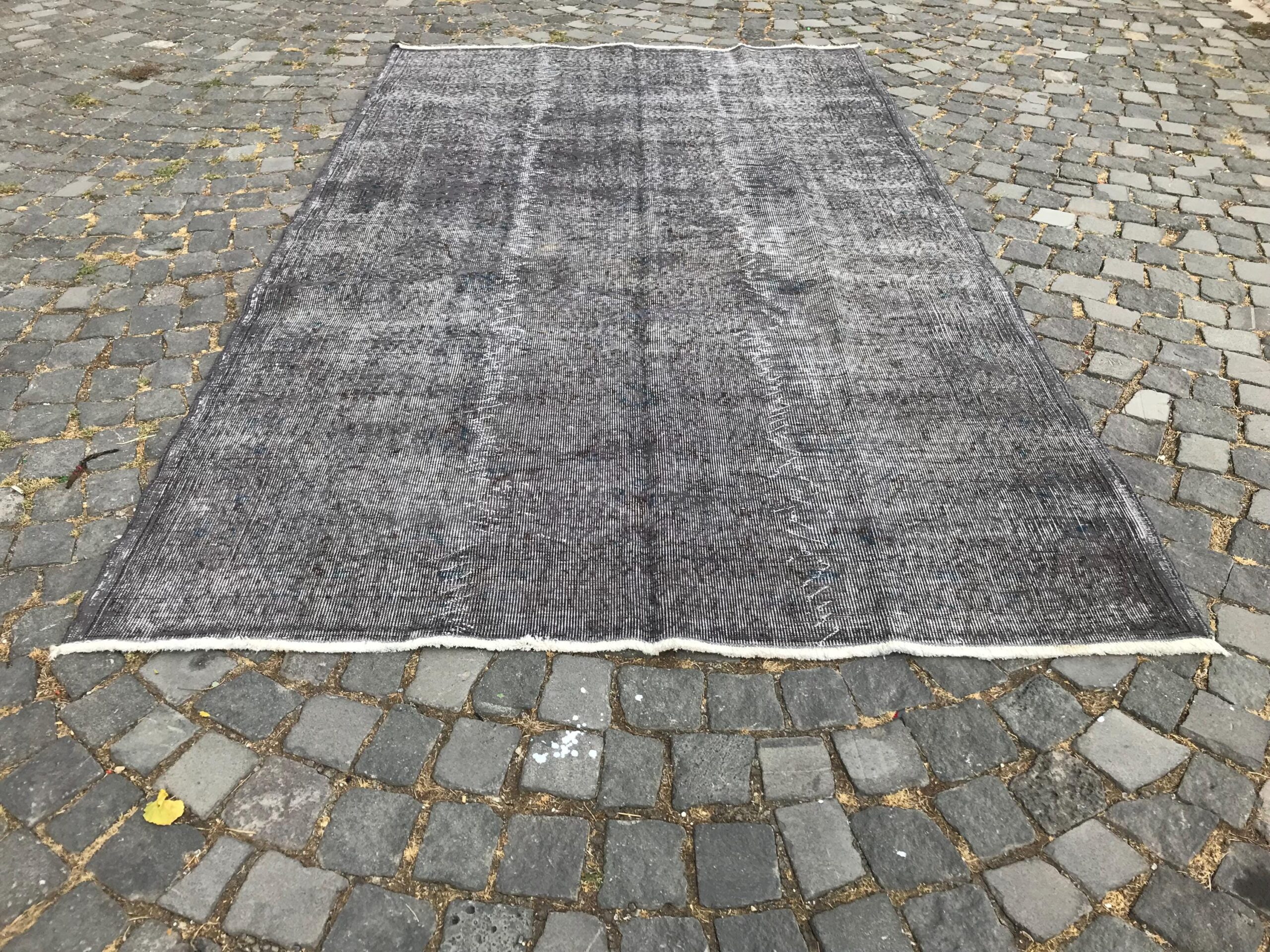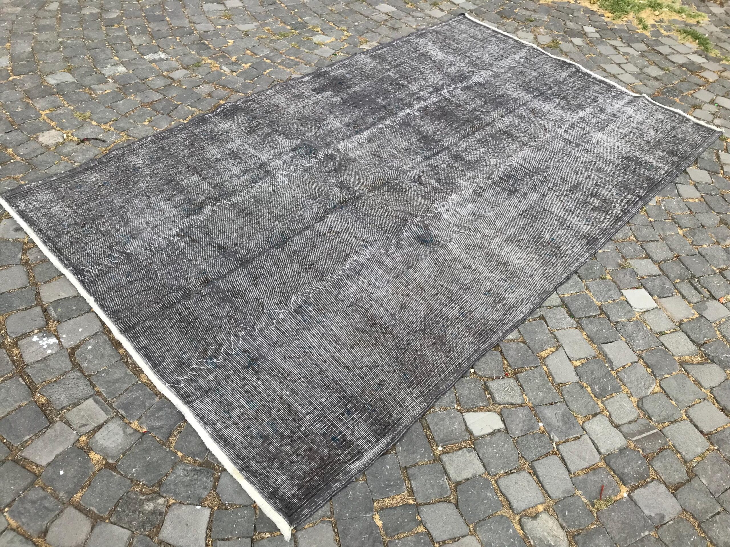 Pretty and one-of-a-kind 5.5 ft. x 9.2 ft. (168 cm x 279 cm) vintage overdyed rug hand-knotted in Turkey from organic wool. This is an authentic vintage rug from the 1980s that has worn splendidly to perfection.
