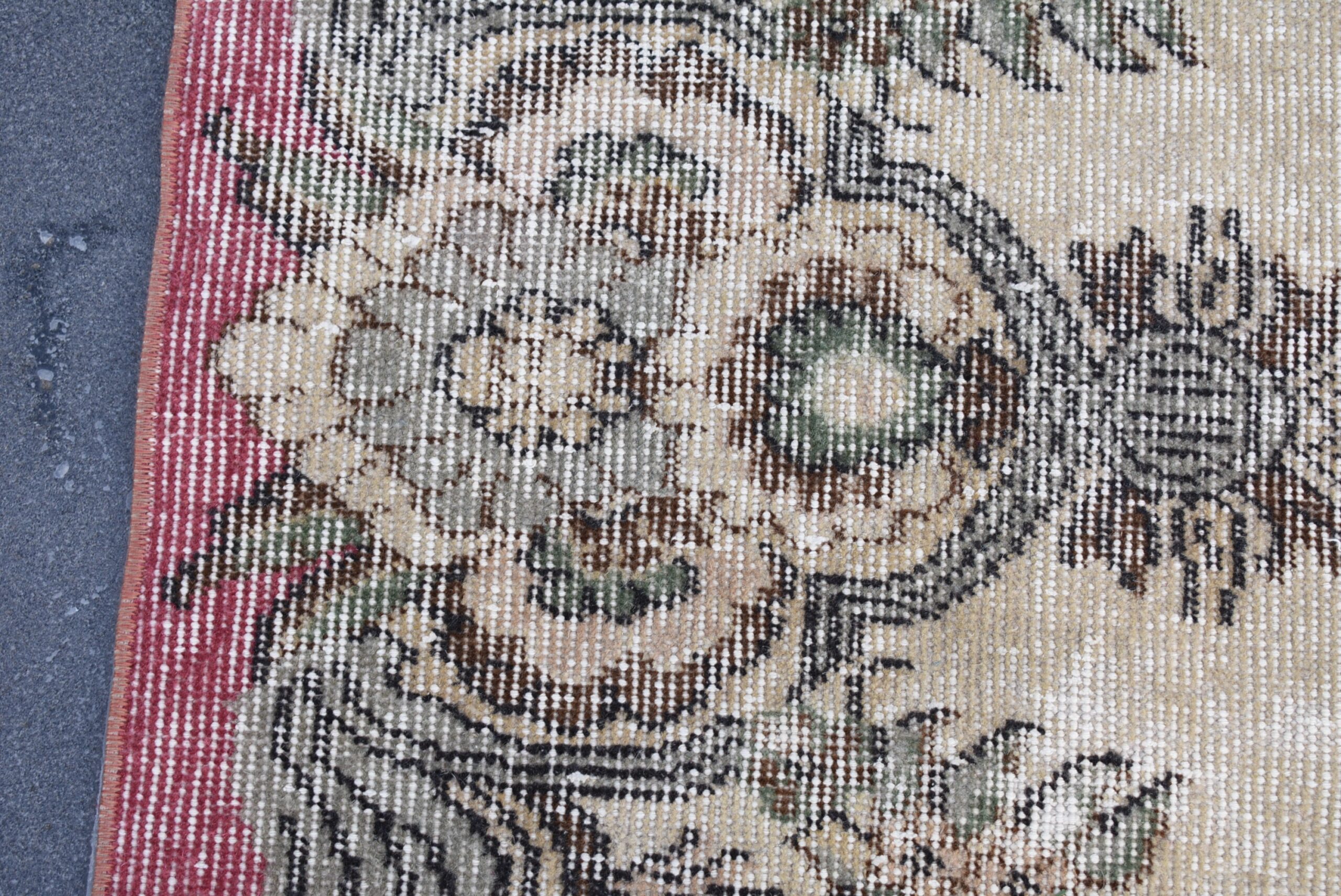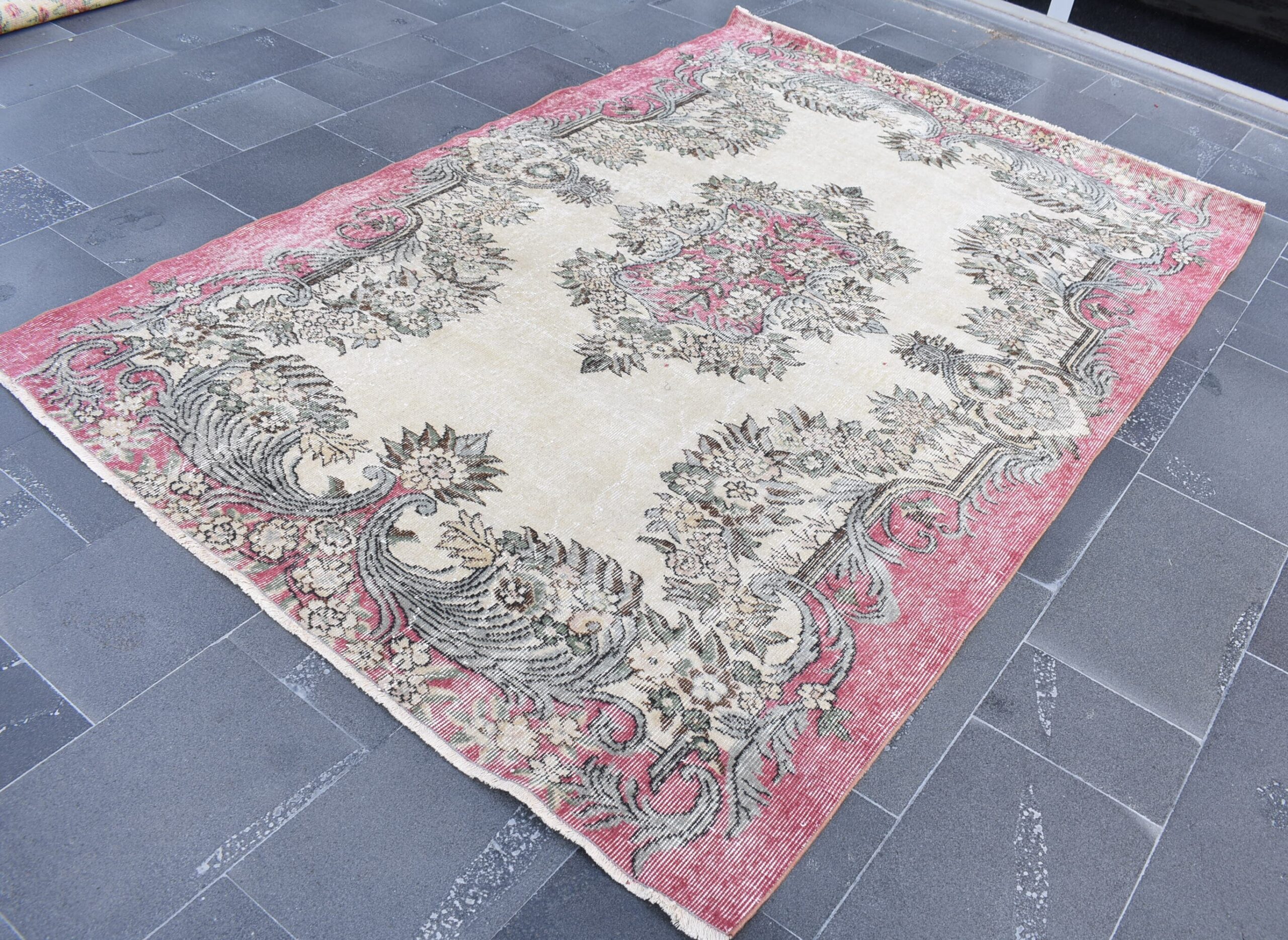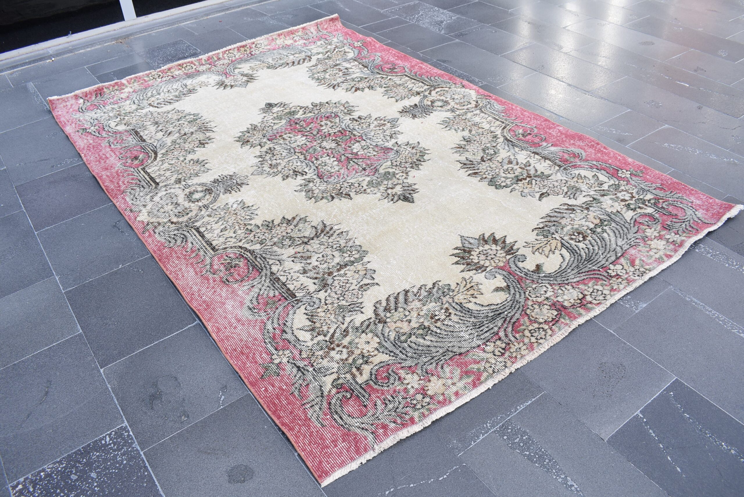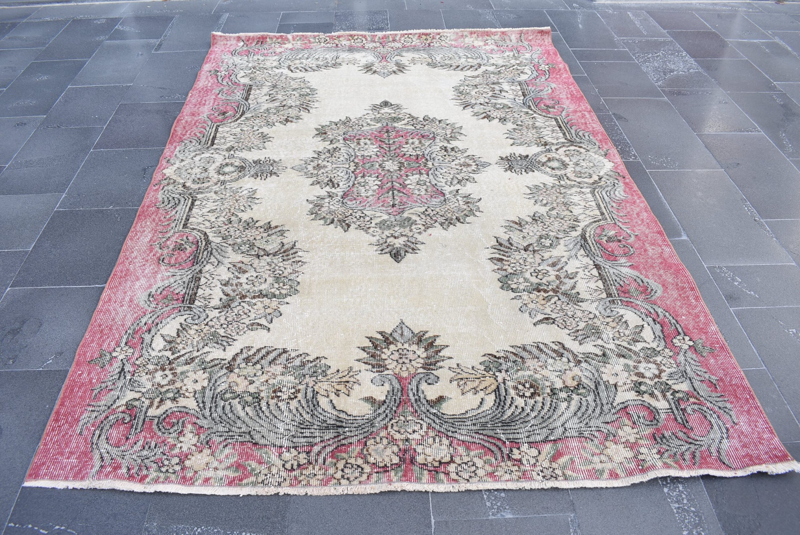 This is a vintage Turkish rug hand-knotted in a small village in Turkey by skilled Anatolian women during around the 1990s. It is made from natural wool (sheep) and dyed using all-natural (vegetable) dyes. Natural materials are more durable than synthetic materials guaranteeing a rug that can last for years while natural dyes provide colors that gets more beautiful as years pass by especially when in direct sunlight.