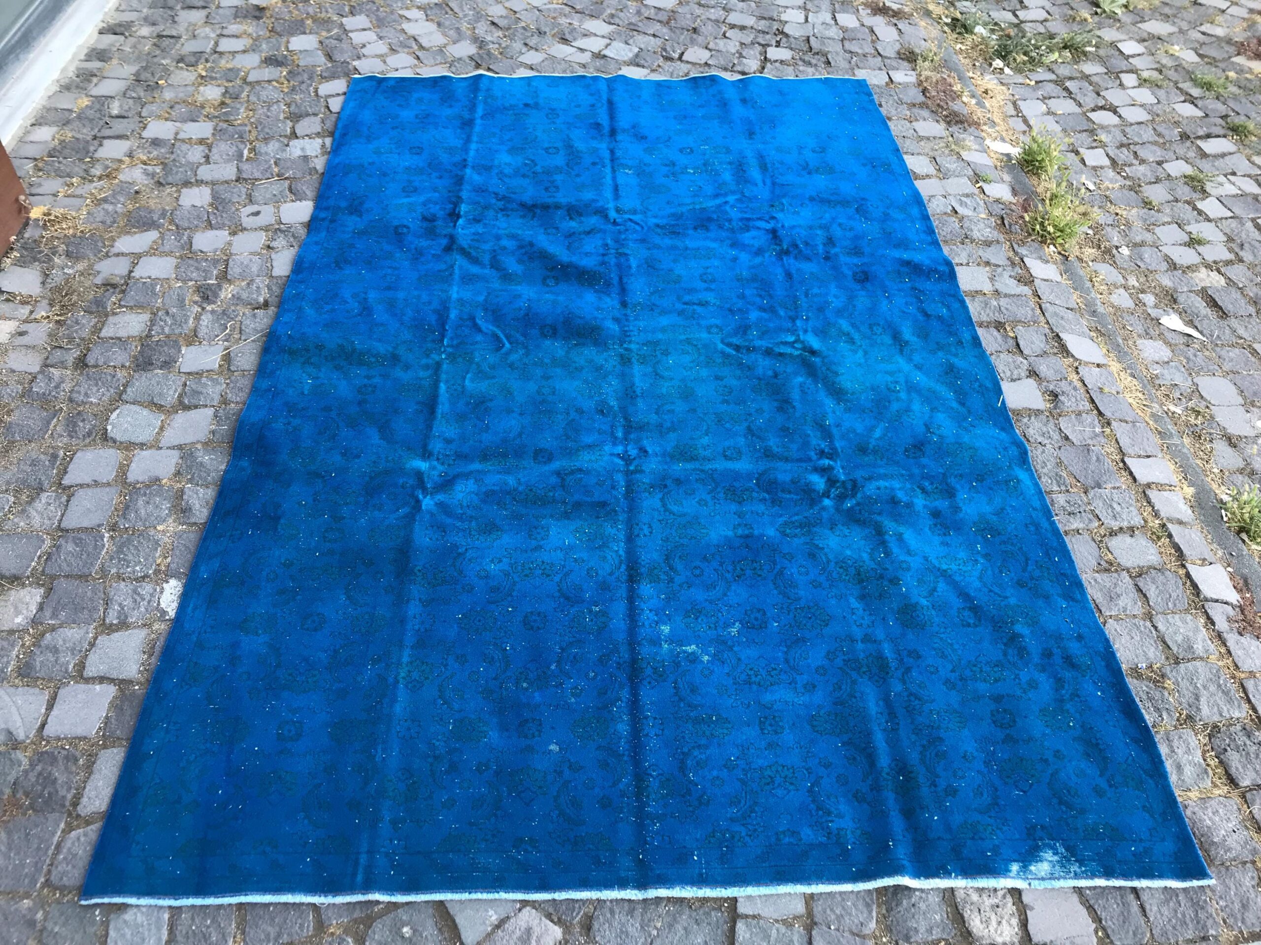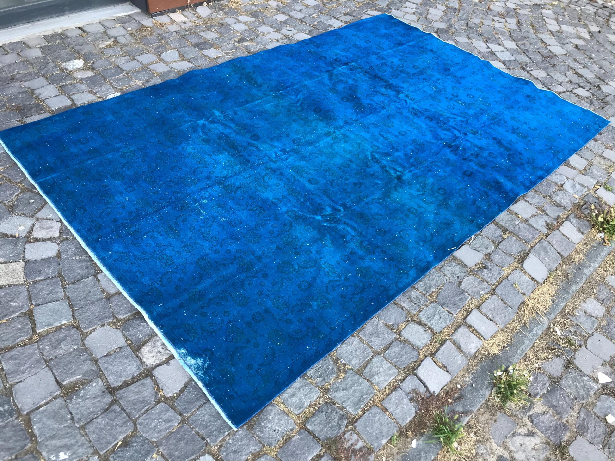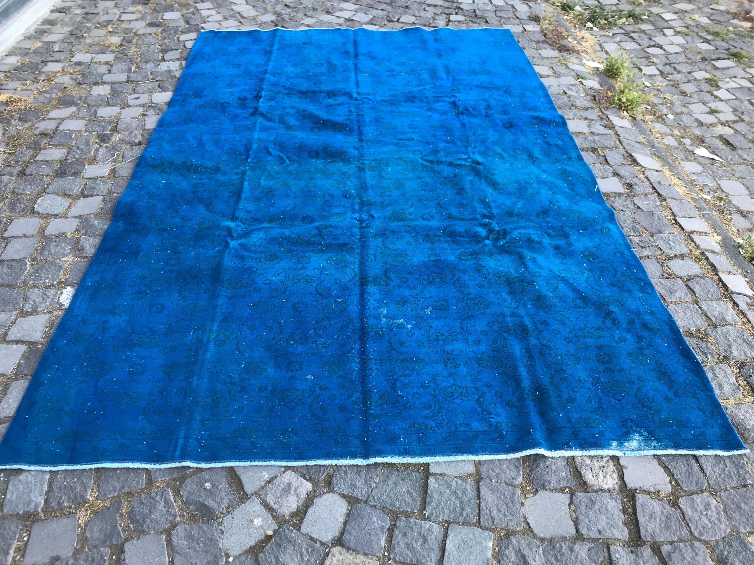 This is a vintage overdyed rug made through over-dyeing an authentic vintage Turkish rug using natural (vegetable) dyes. This rug originated in a small village in Turkey where it was hand-knotted from natural wool (sheep) by skilled Anatolian women during around the 1990s. Natural materials are more durable than synthetic materials guaranteeing a rug that can last for years while natural dyes provide colors that gets more beautiful as years pass by especially when in direct sunlight.