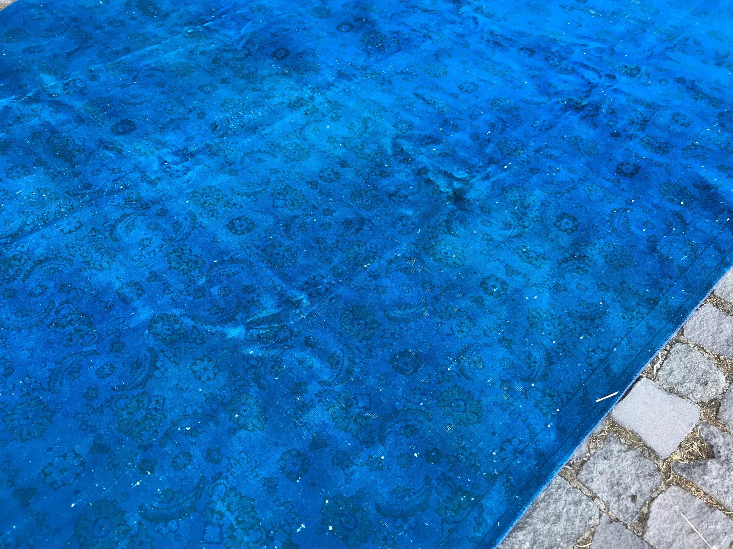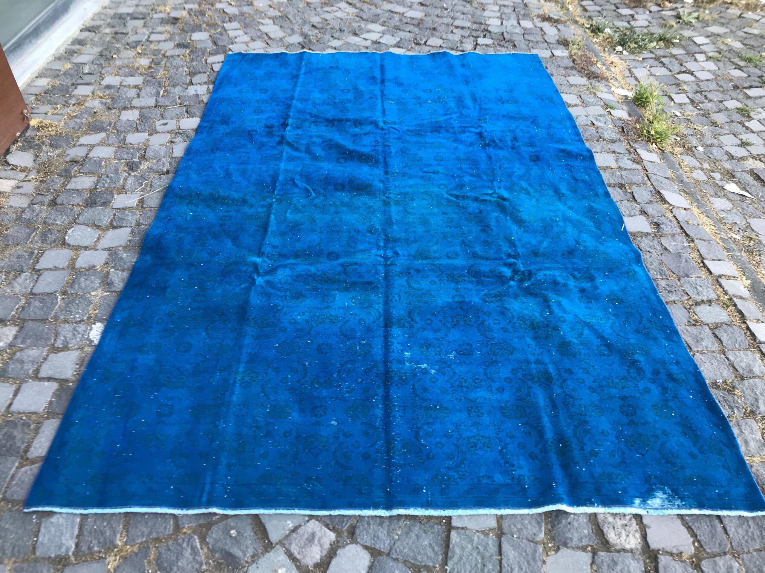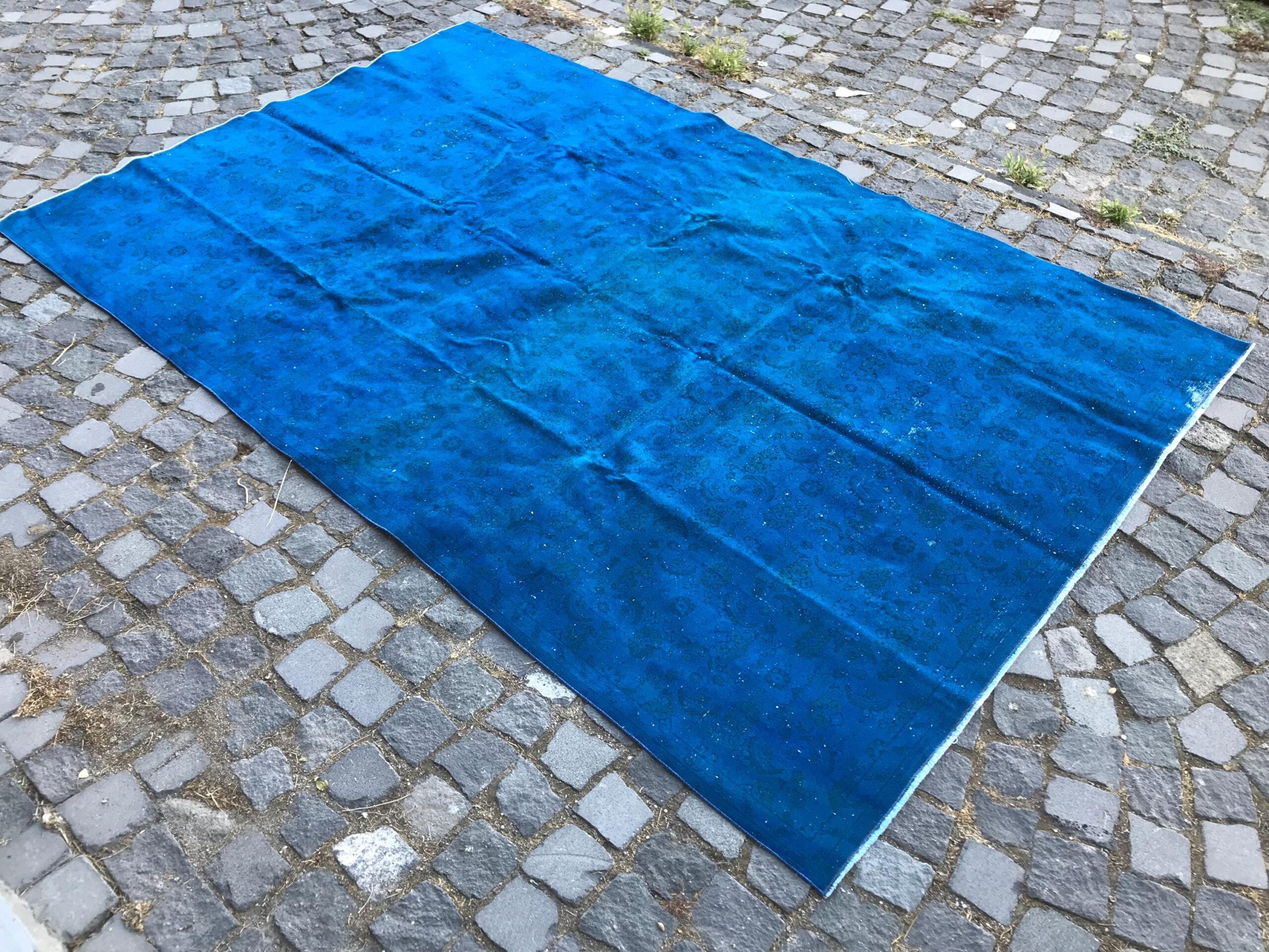 This is a vintage overdyed rug made through over-dyeing an authentic vintage Turkish rug using natural (vegetable) dyes. This rug originated in a small village in Turkey where it was hand-knotted from natural wool (sheep) by skilled Anatolian women during around the 1990s. Natural materials are more durable than synthetic materials guaranteeing a rug that can last for years while natural dyes provide colors that gets more beautiful as years pass by especially when in direct sunlight.
