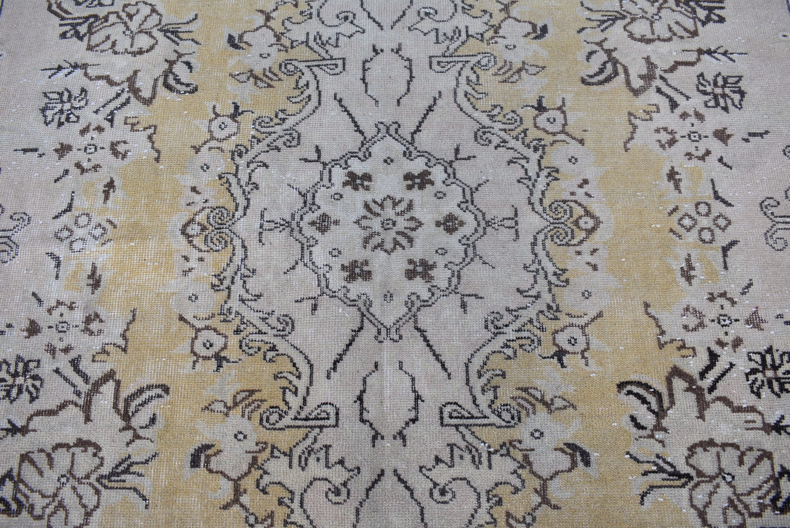 Lovely and unique 5.8 ft. x 9.9 ft. (177 cm x 302 cm) vintage Turkish rug hand-knotted in Turkey from organic wool. This is an authentic vintage Turkish rug from the 1980s that has worn beautifully to perfection.