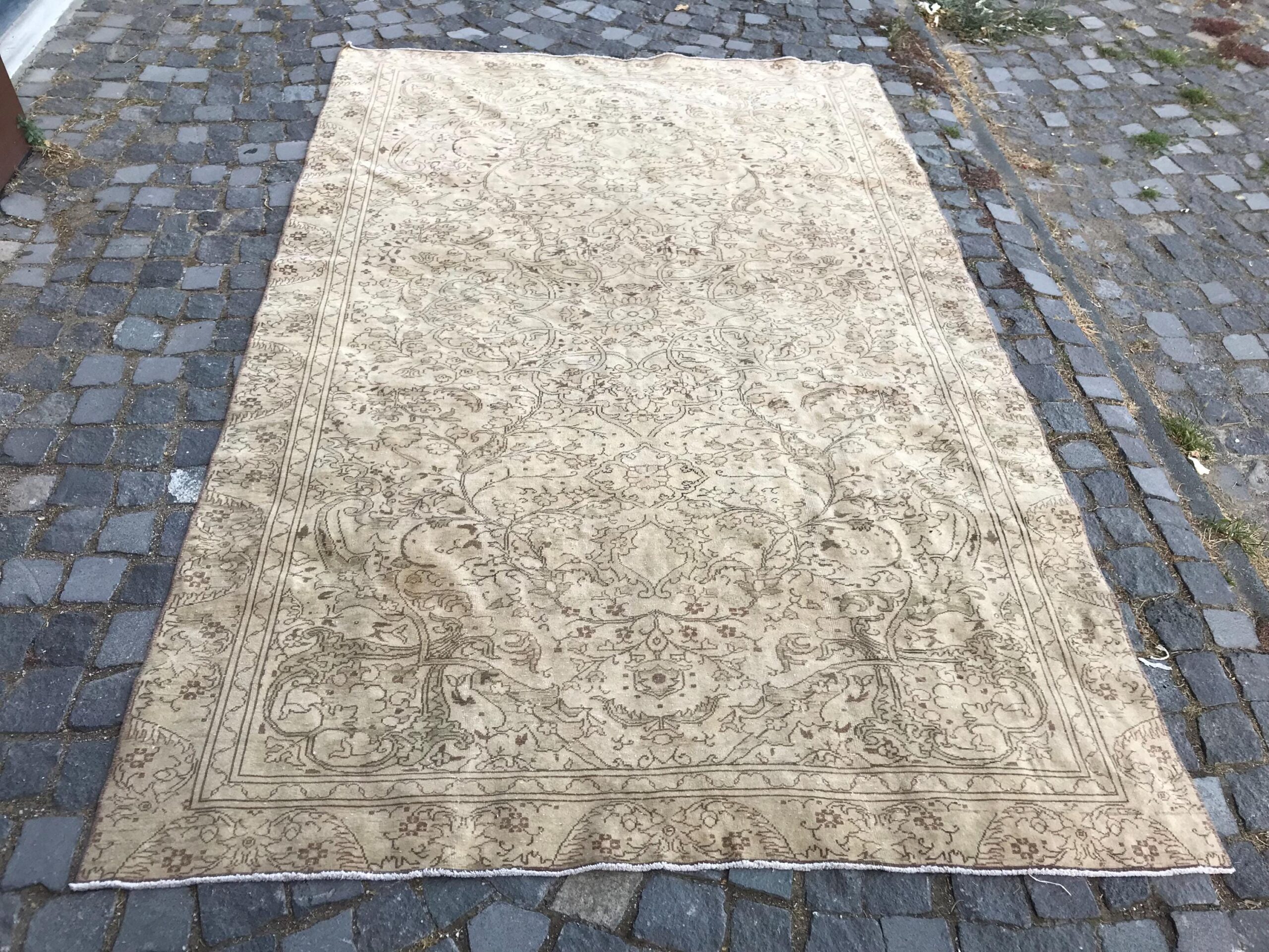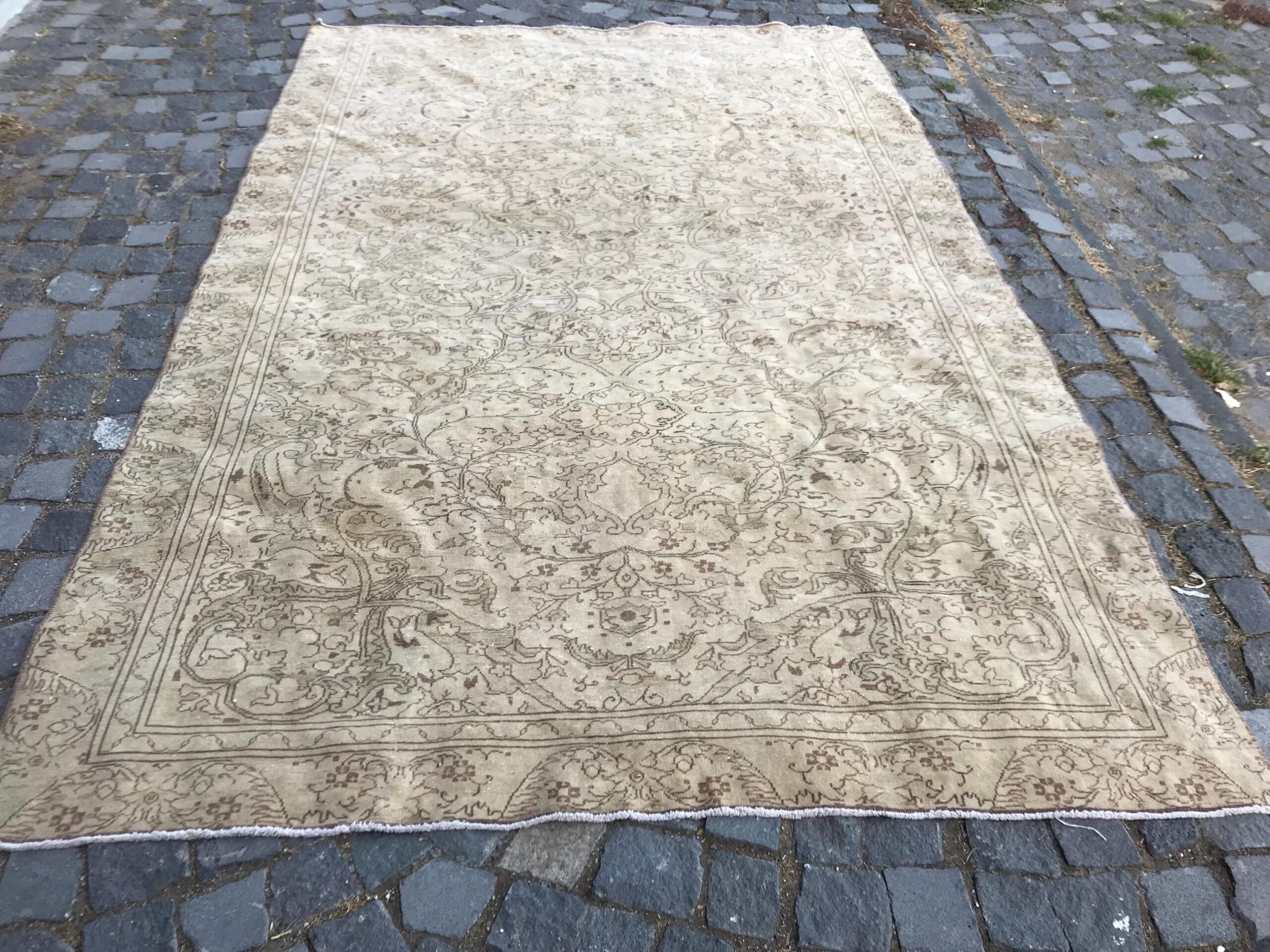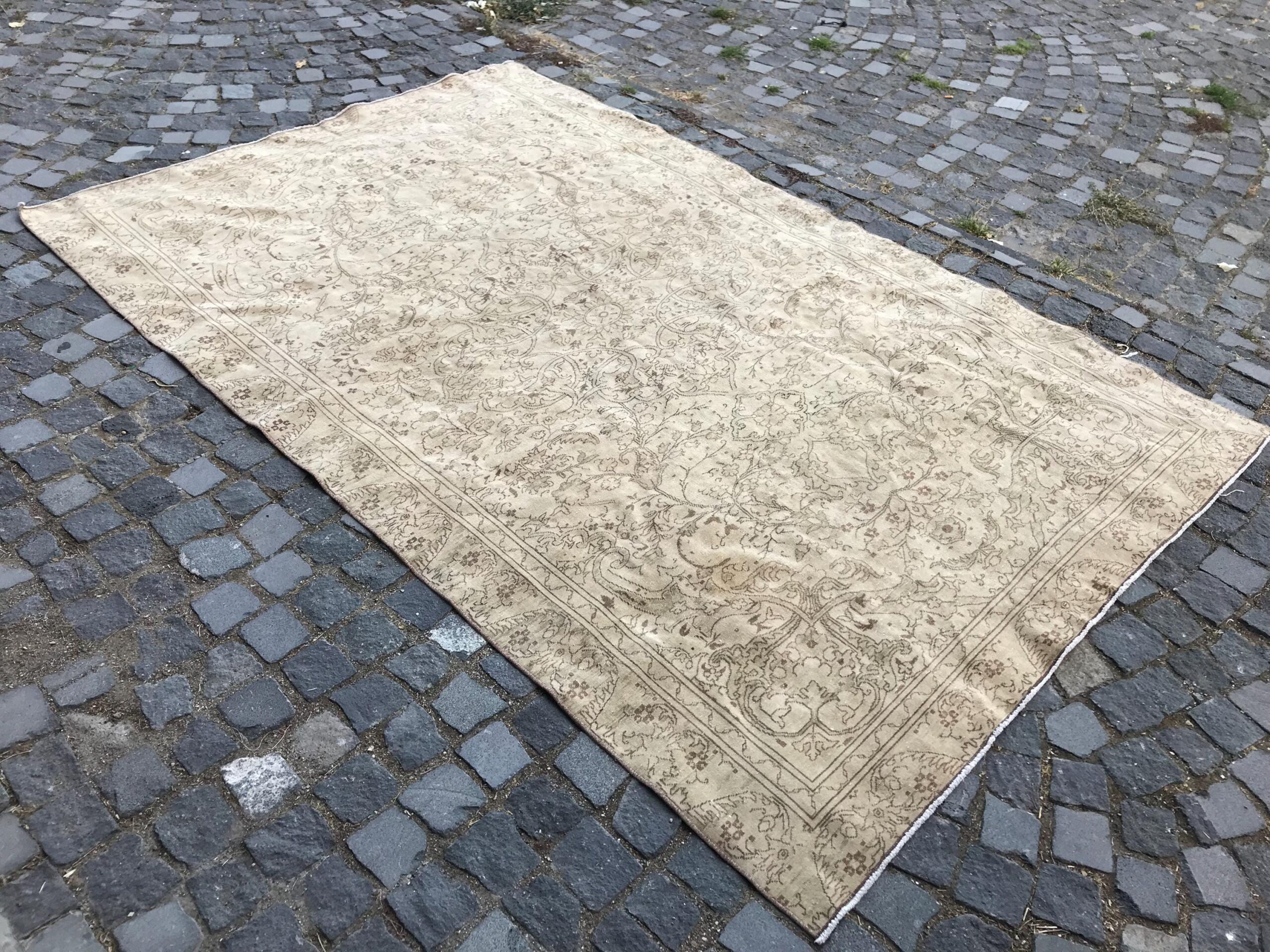 Beautiful and one-of-a-kind 5.9 ft. x 9.2 ft. (180 cm x 280 cm) vintage Turkish rug hand-knotted in Turkey from organic wool. This is an authentic vintage Turkish rug from the 1990s that has worn admirably to perfection.