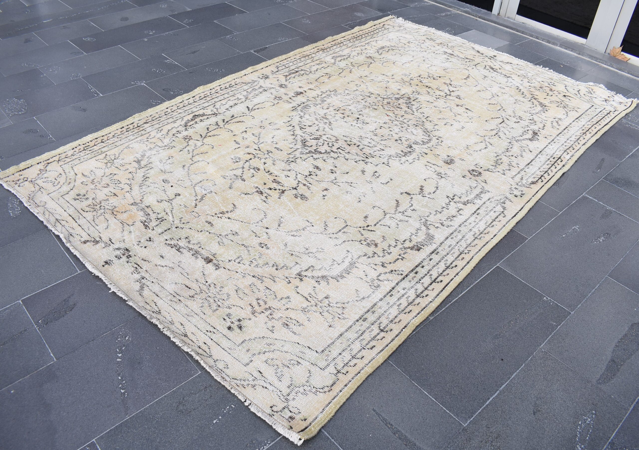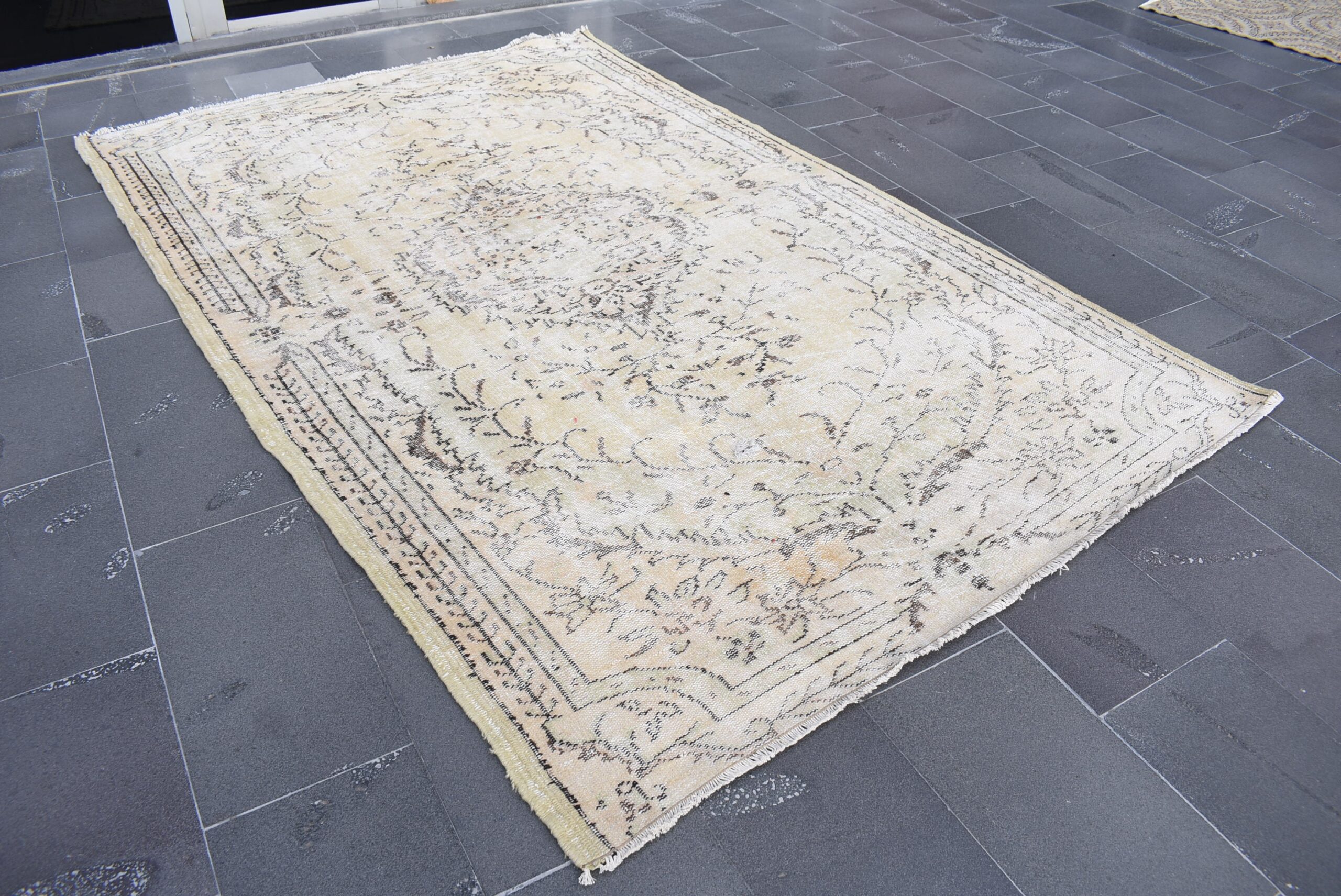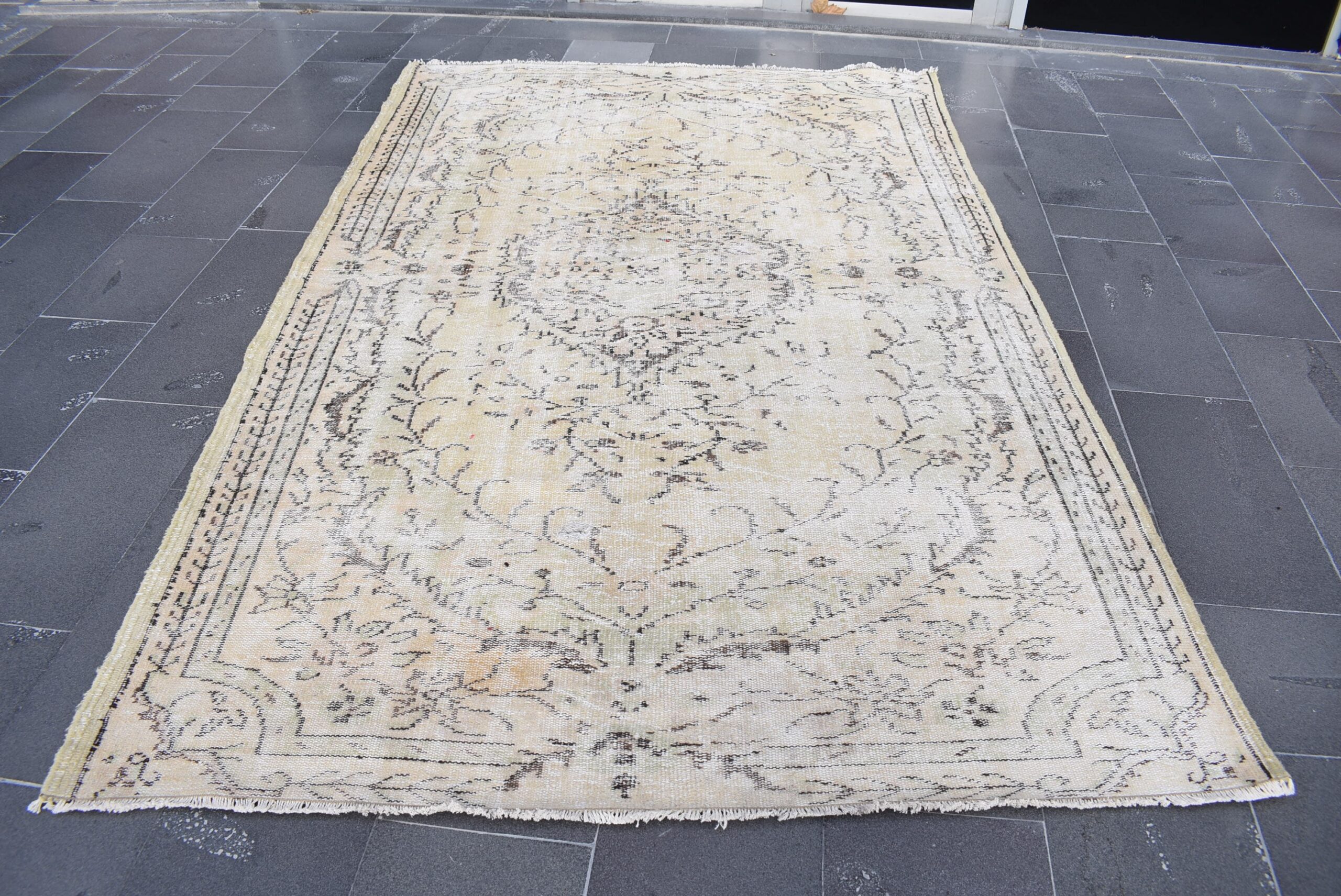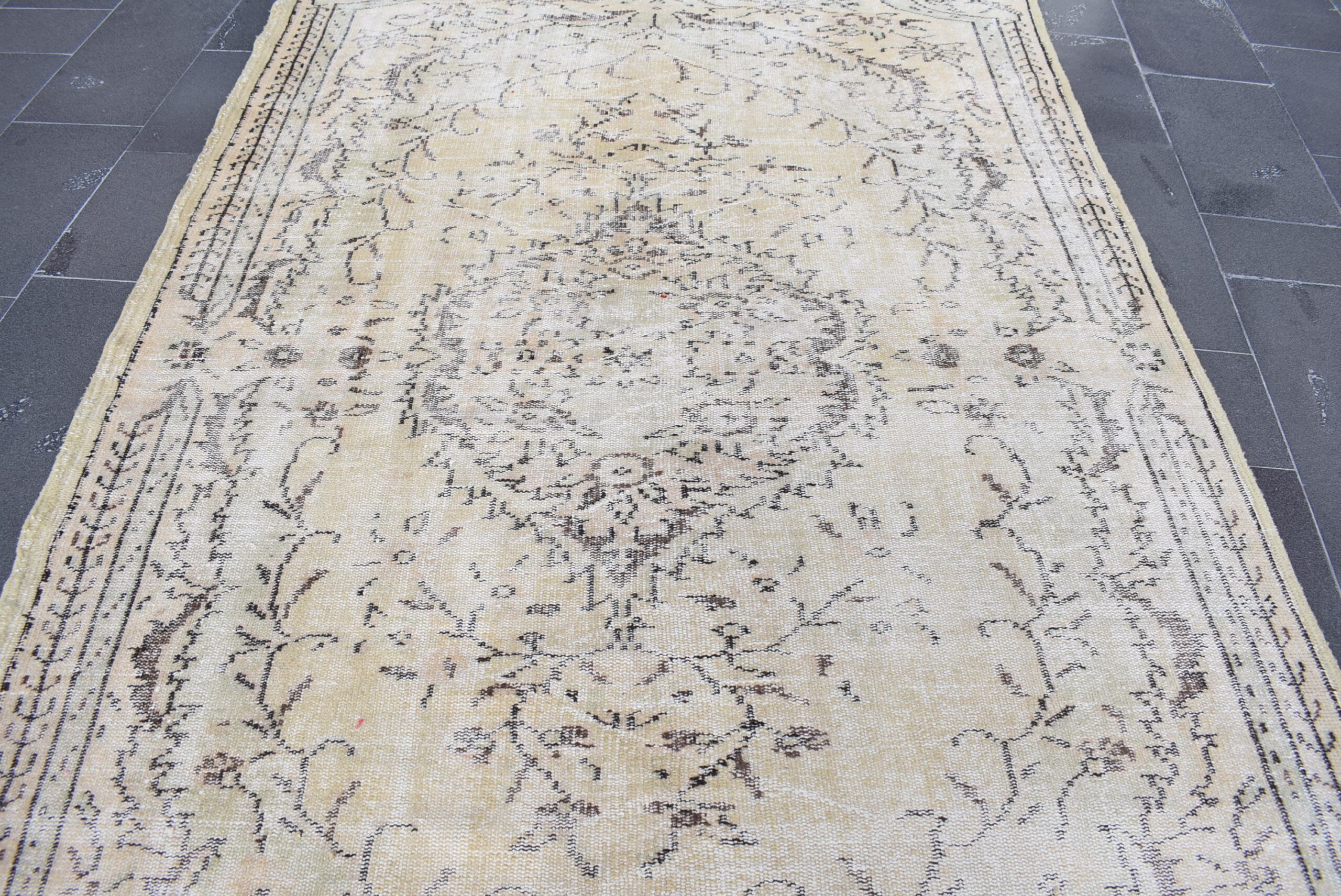 This is a vintage Turkish rug hand-knotted in a small village in Turkey by skilled Anatolian women during around the 1980s. It is made from natural wool (sheep) and dyed using all-natural (vegetable) dyes. Natural materials are more durable than synthetic materials guaranteeing a rug that can last for years while natural dyes provide colors that gets more beautiful as years pass by especially when in direct sunlight.