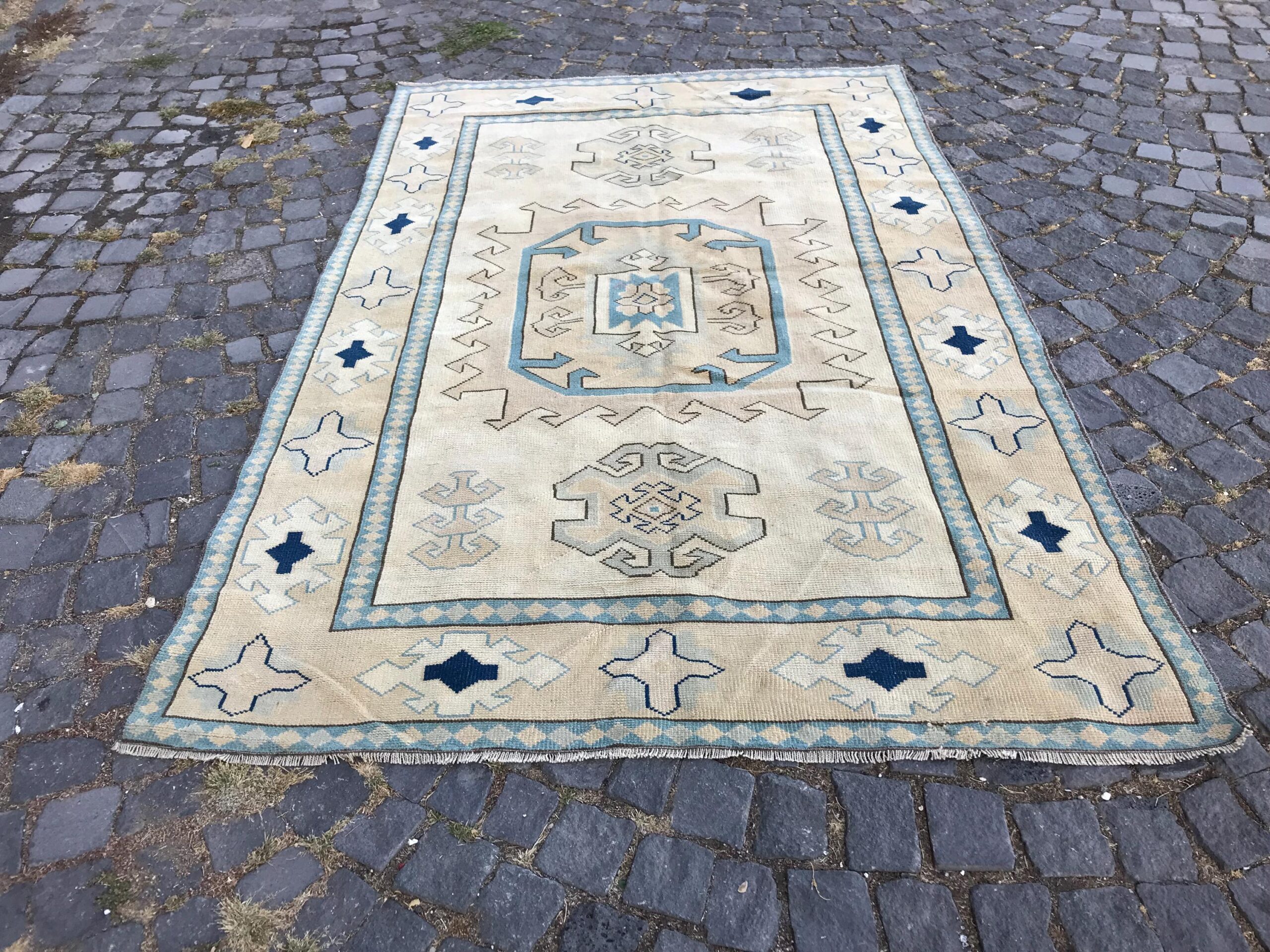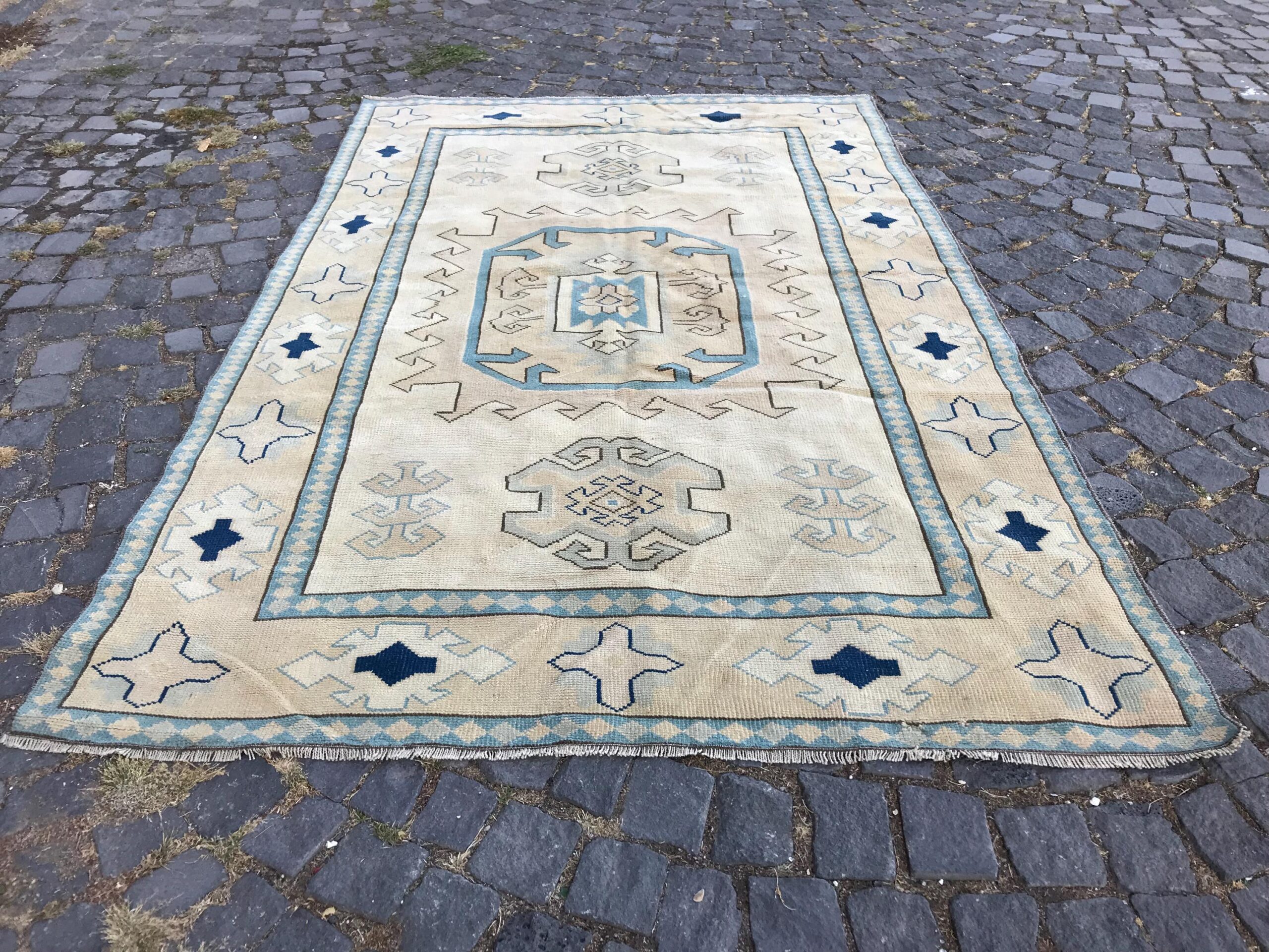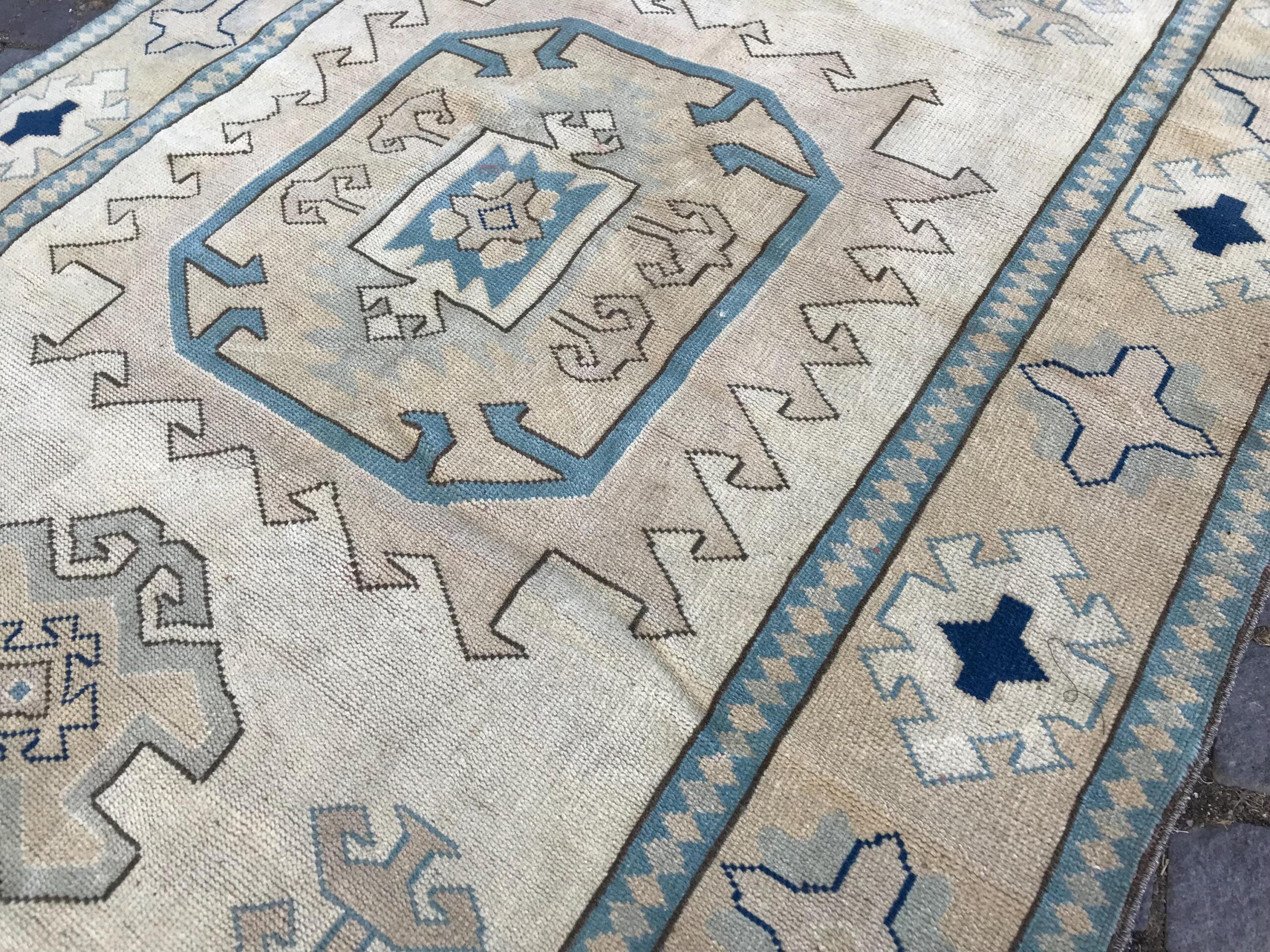 This is a vintage Turkish rug hand-knotted in a small village in Turkey by skilled Anatolian women during around the 1980s. It is made from natural wool (sheep) and dyed using all-natural (vegetable) dyes. Natural materials are more durable than synthetic materials guaranteeing a rug that can last for years while natural dyes provide colors that gets more beautiful as years pass by especially when in direct sunlight.