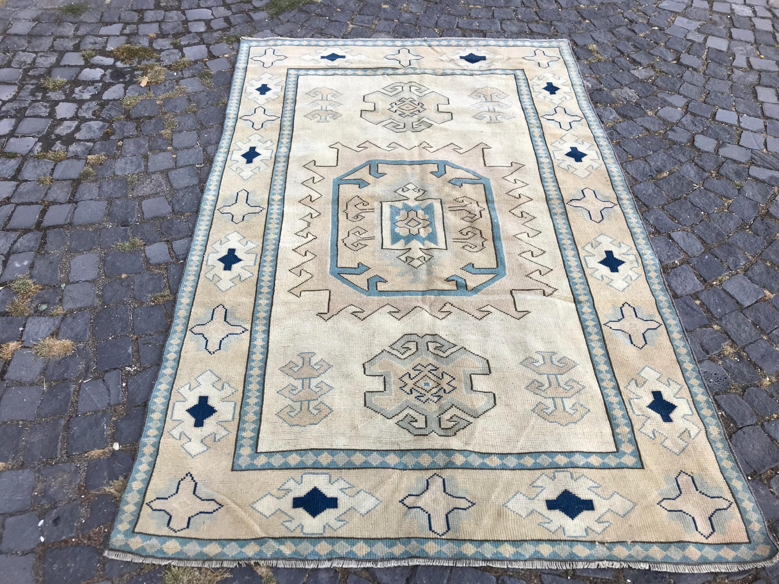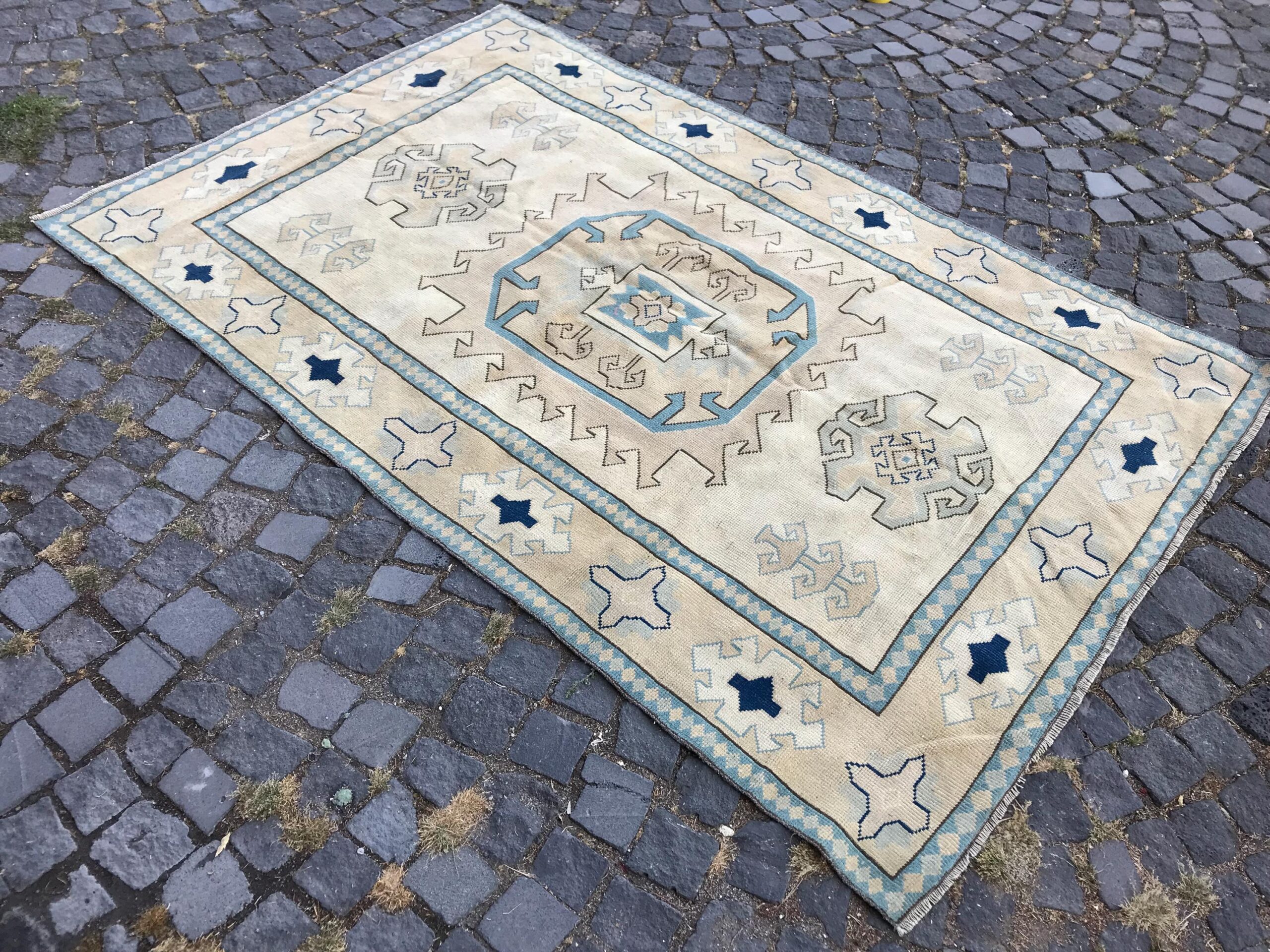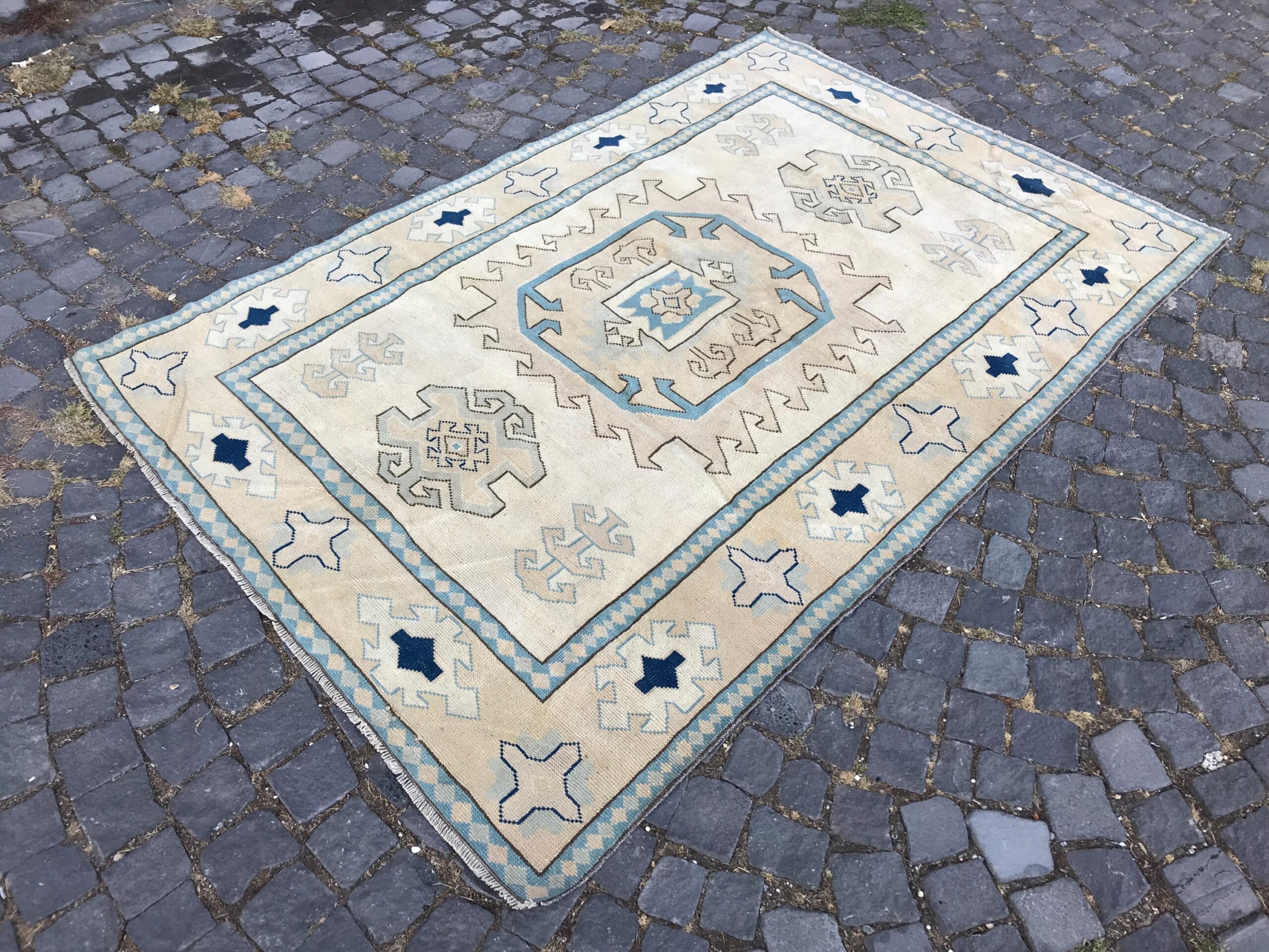 This is a vintage Turkish rug hand-knotted in a small village in Turkey by skilled Anatolian women during around the 1980s. It is made from natural wool (sheep) and dyed using all-natural (vegetable) dyes. Natural materials are more durable than synthetic materials guaranteeing a rug that can last for years while natural dyes provide colors that gets more beautiful as years pass by especially when in direct sunlight.