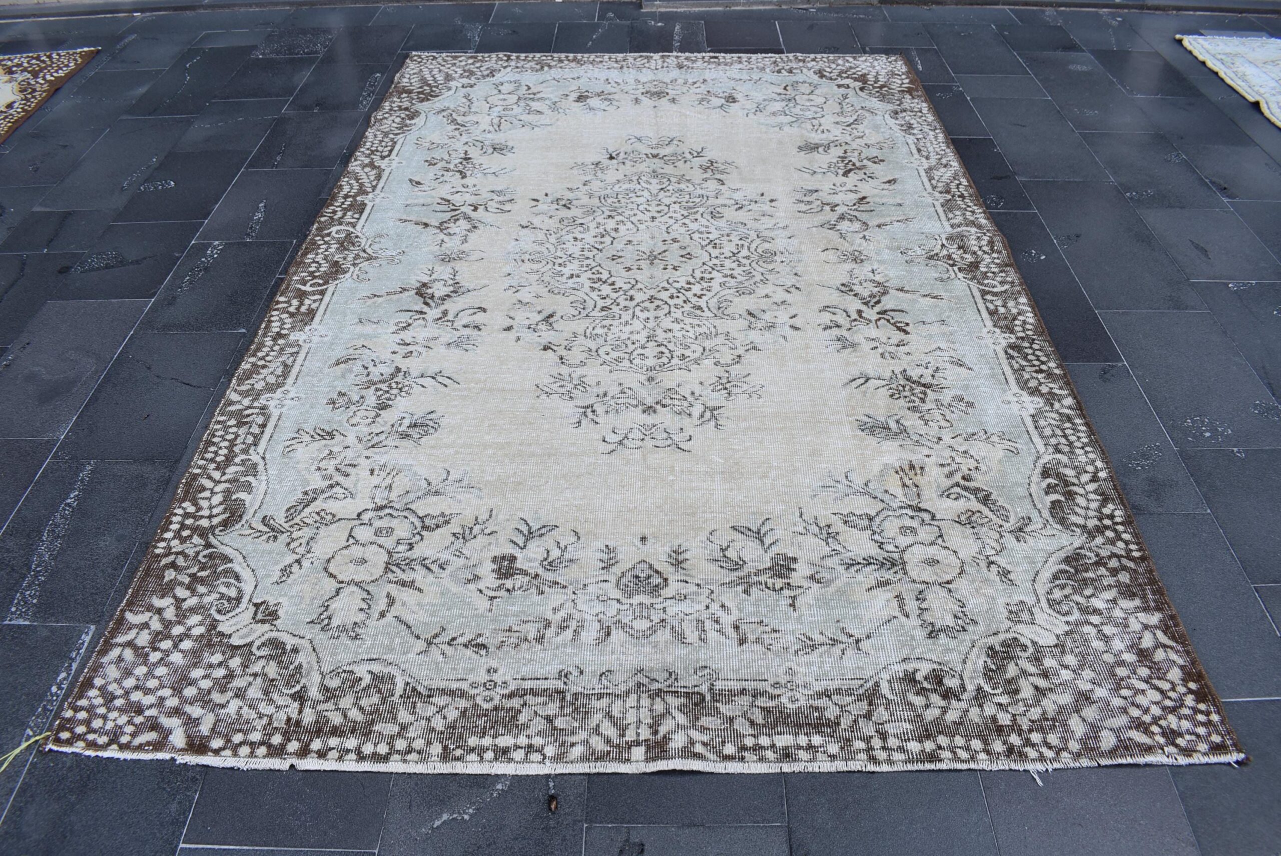 This is a vintage Turkish rug hand-knotted in a small village in Turkey by skilled Anatolian women during around the 1990s. It is made from natural wool (sheep) and dyed using all-natural (vegetable) dyes. Natural materials are more durable than synthetic materials guaranteeing a rug that can last for years while natural dyes provide colors that gets more beautiful as years pass by especially when in direct sunlight.