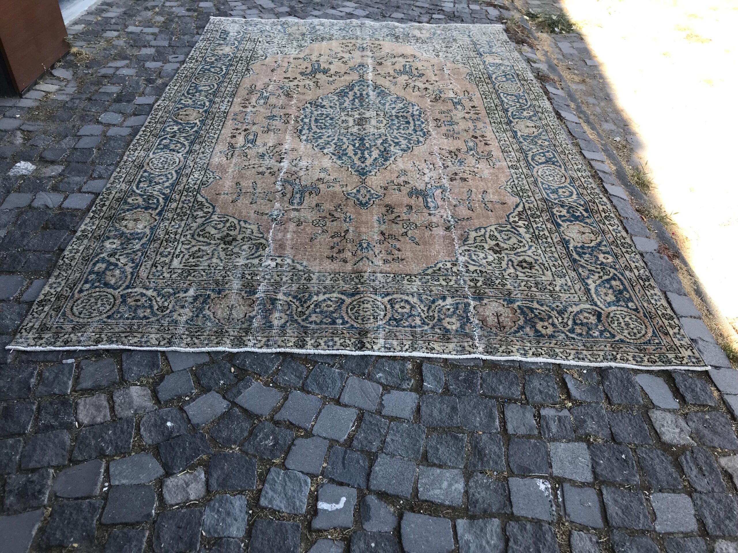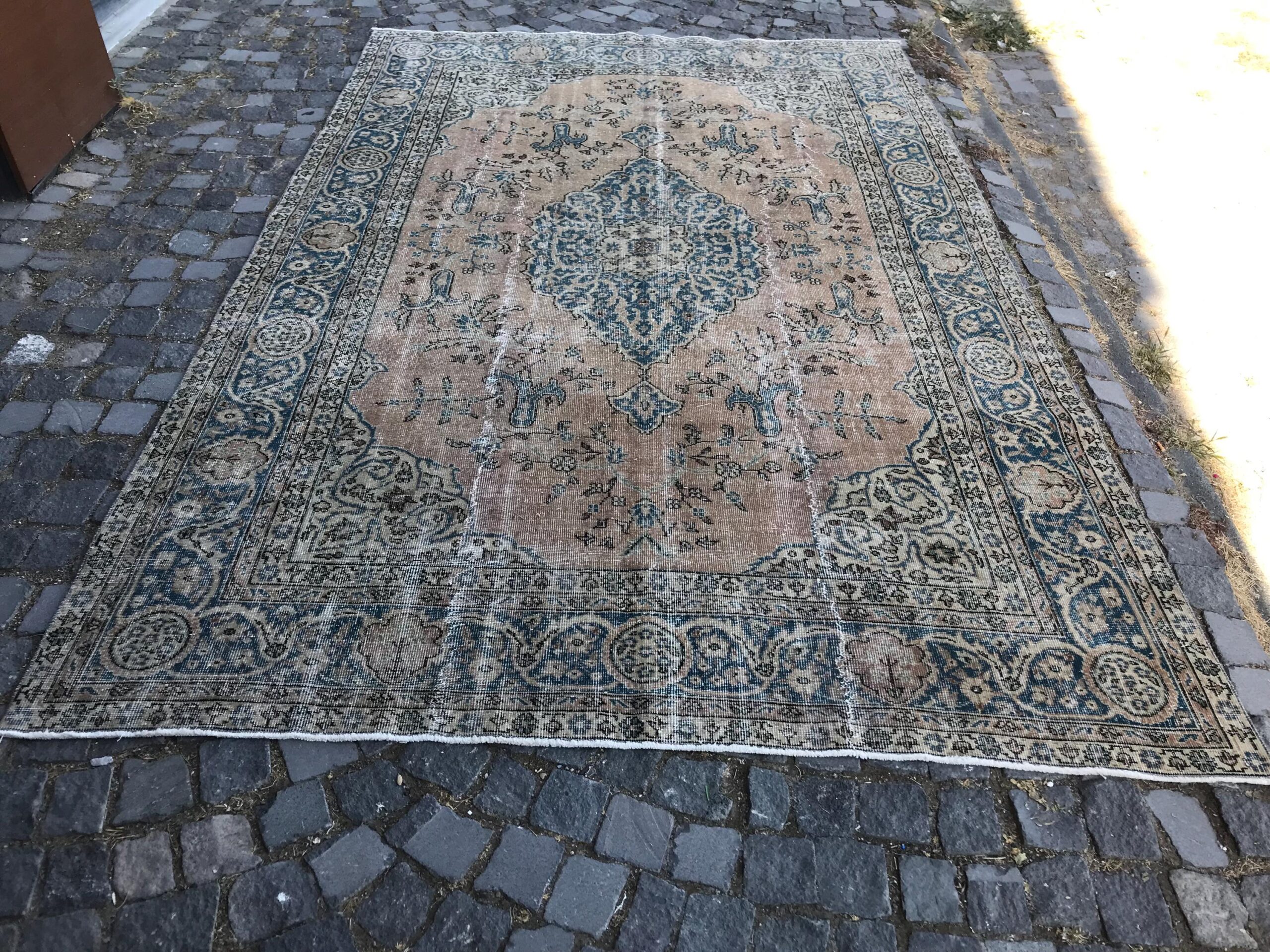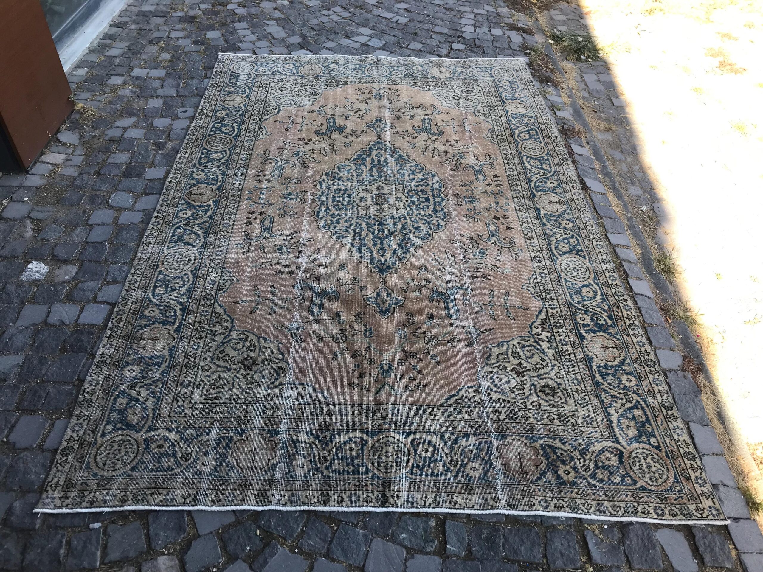 Beautiful and one-of-a-kind 6.5 ft. x 10.1 ft. (199 cm x 308 cm) vintage Turkish rug hand-knotted in Turkey from organic wool. This is an authentic vintage Turkish rug from the 1980s that has worn admirably to perfection.