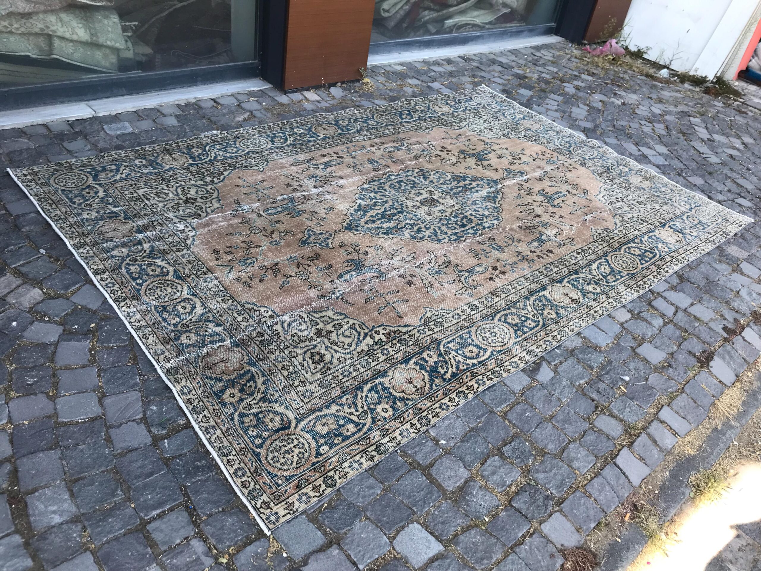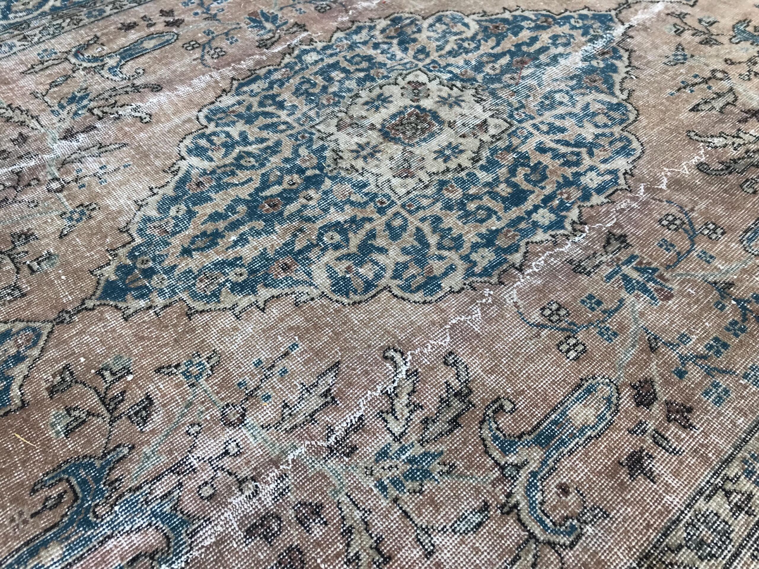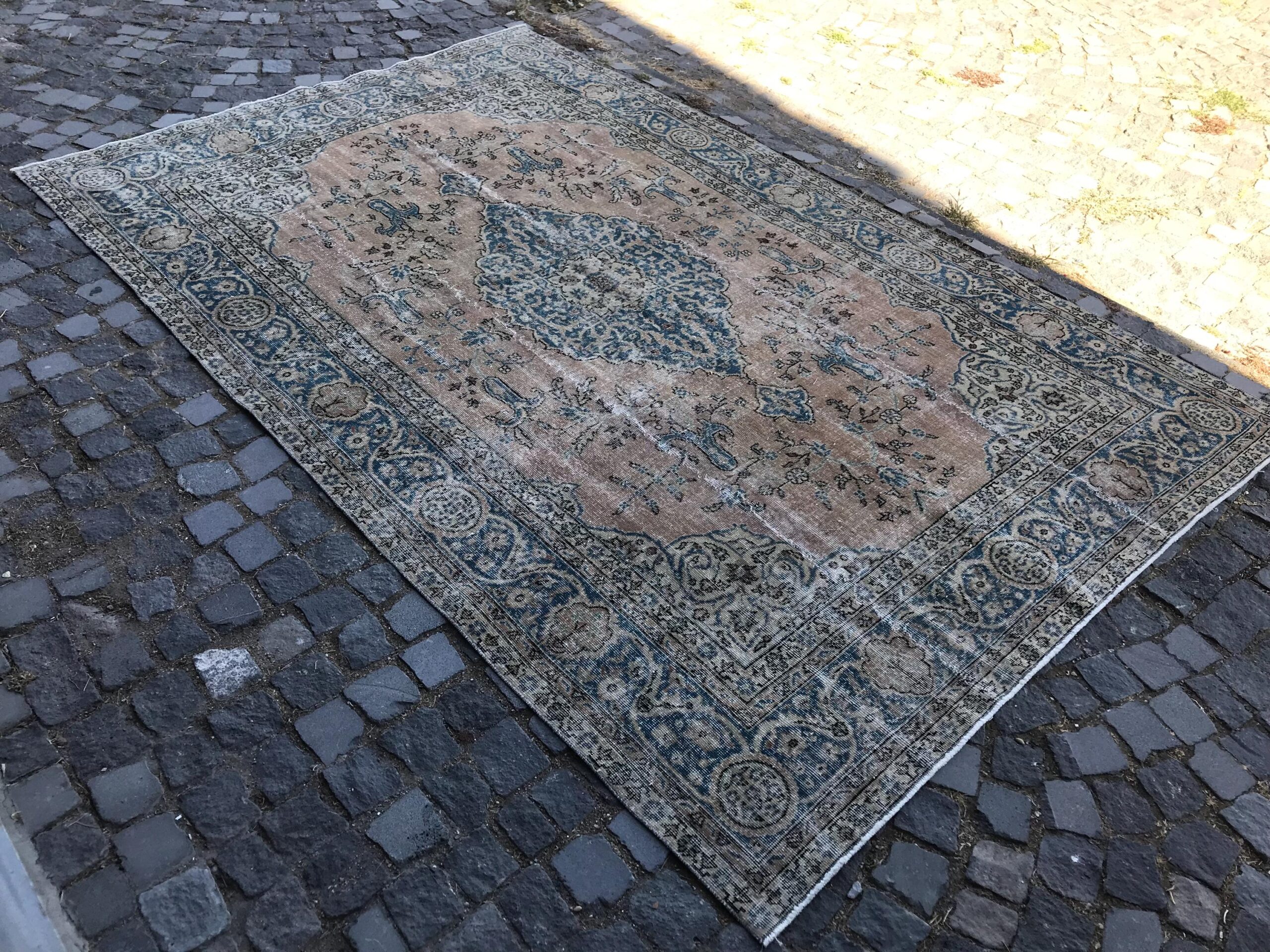 Beautiful and one-of-a-kind 6.5 ft. x 10.1 ft. (199 cm x 308 cm) vintage Turkish rug hand-knotted in Turkey from organic wool. This is an authentic vintage Turkish rug from the 1980s that has worn admirably to perfection.