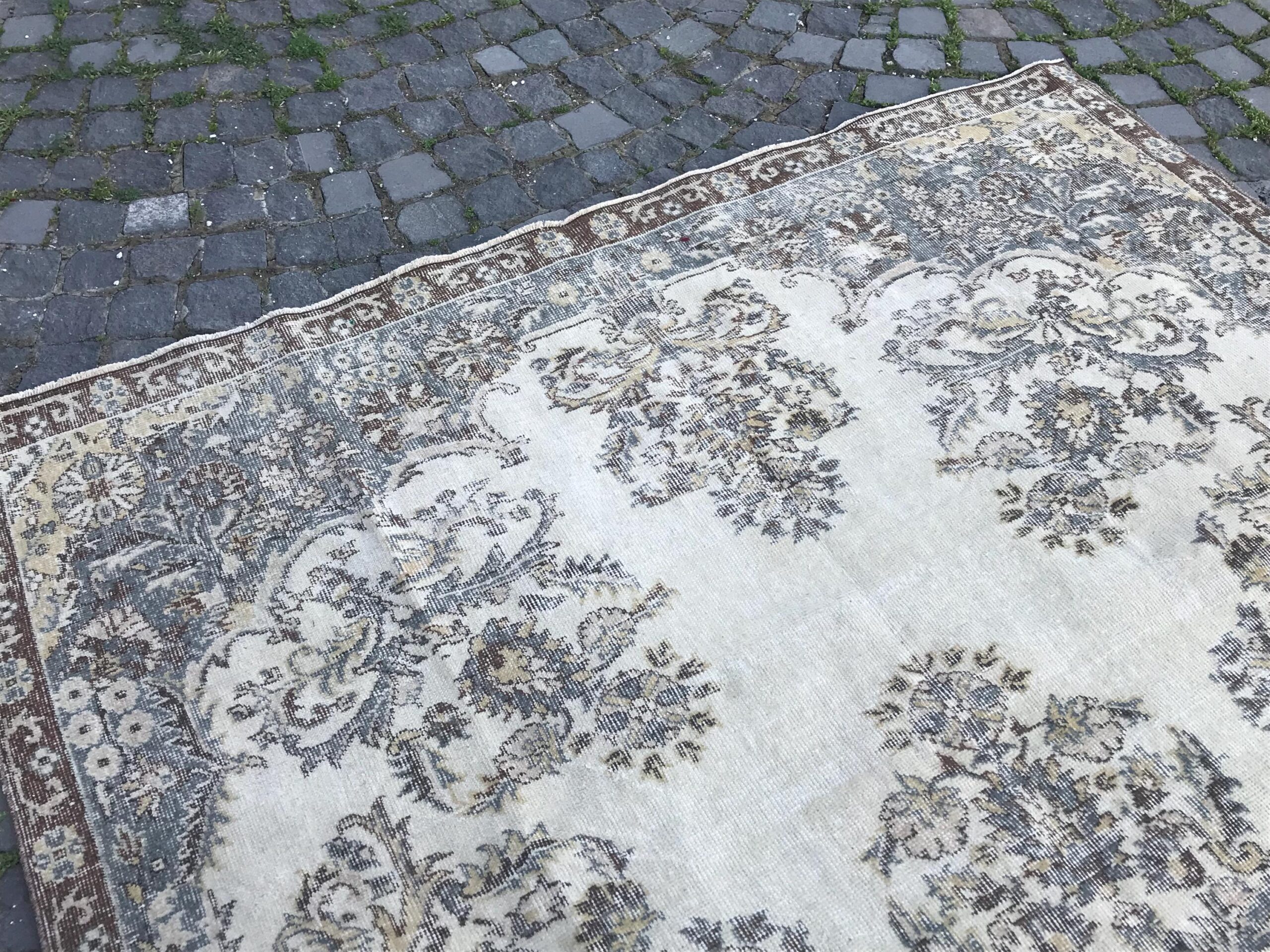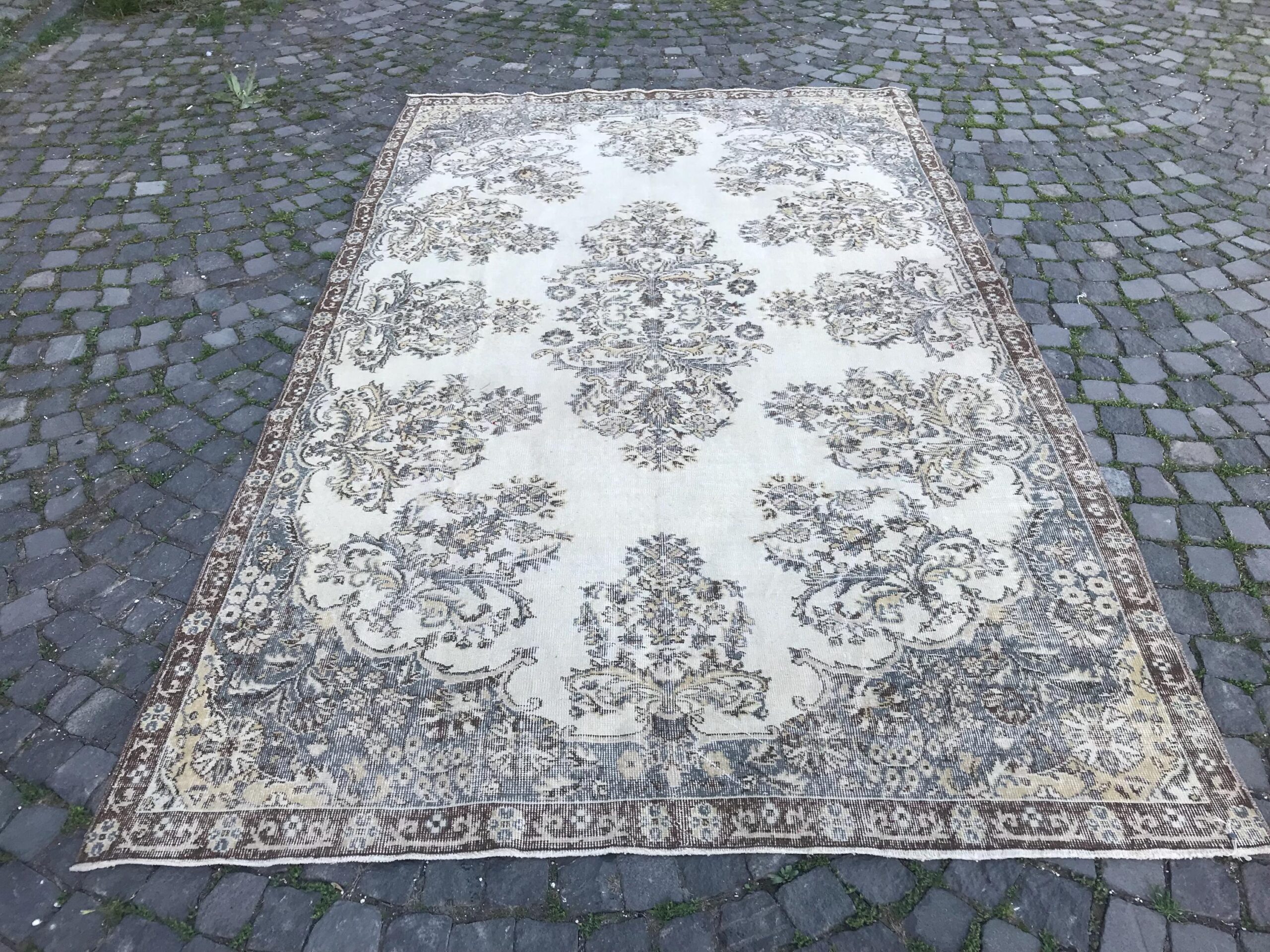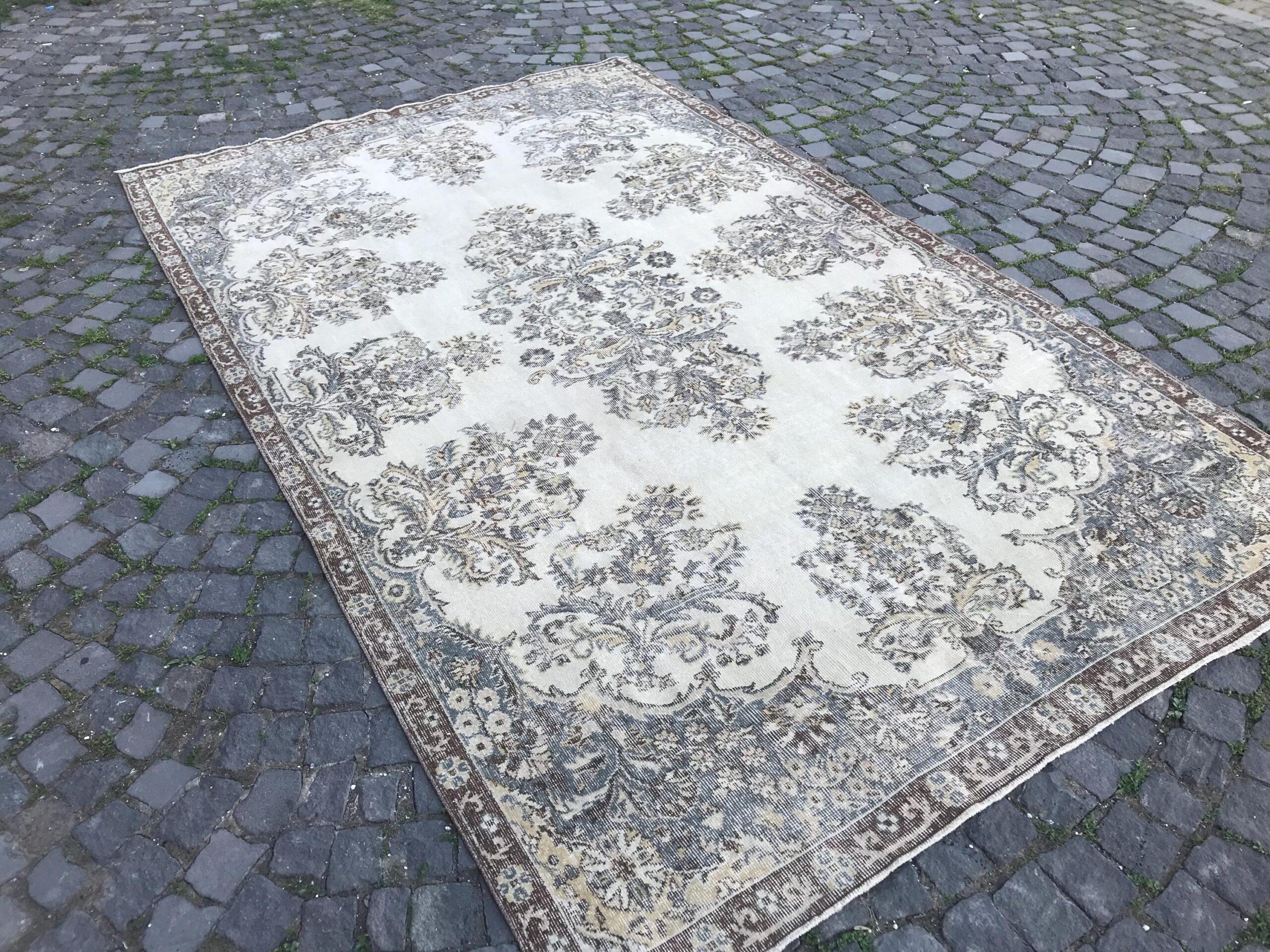 This is a vintage Turkish rug hand-knotted in a small village in Turkey by skilled Anatolian women during around the 1980s. It is made from natural wool (sheep) and dyed using all-natural (vegetable) dyes. Natural materials are more durable than synthetic materials guaranteeing a rug that can last for years while natural dyes provide colors that gets more beautiful as years pass by especially when in direct sunlight.