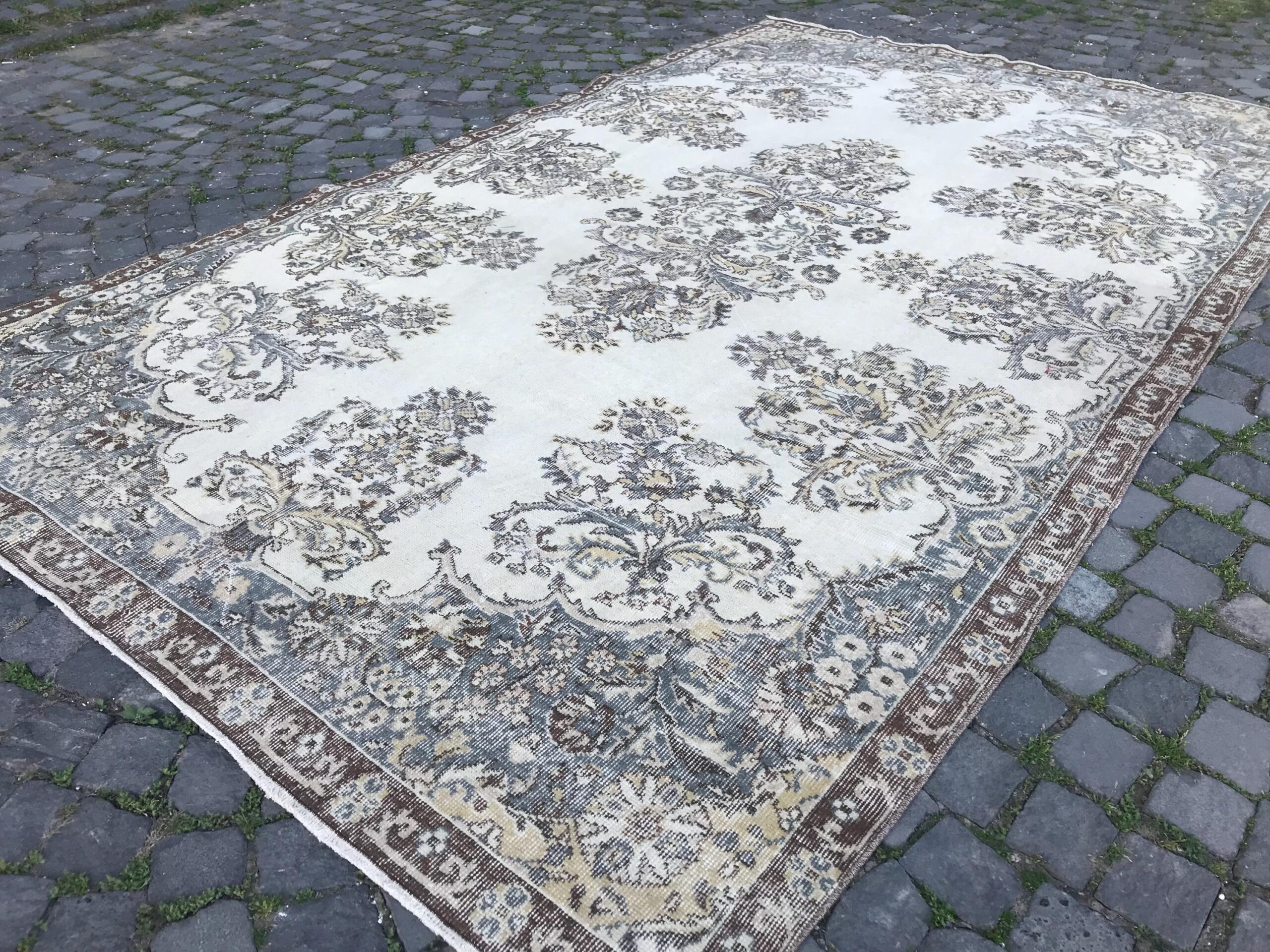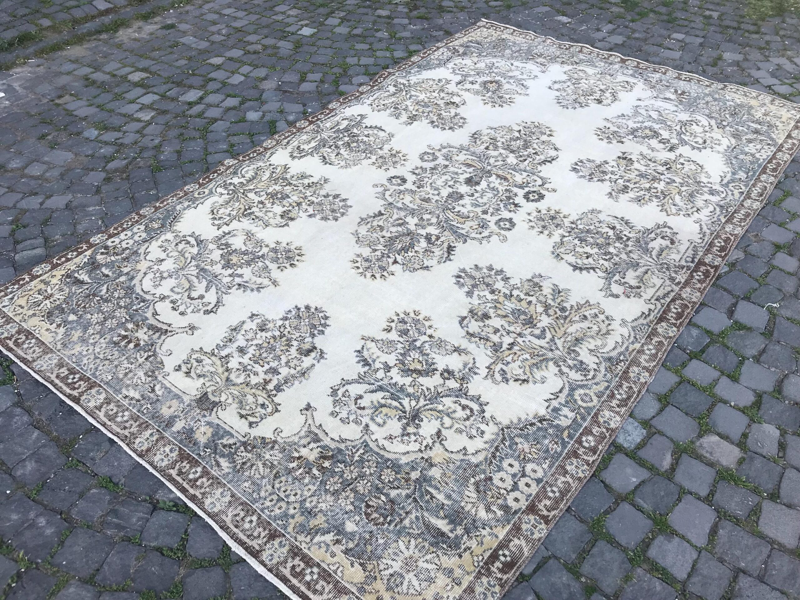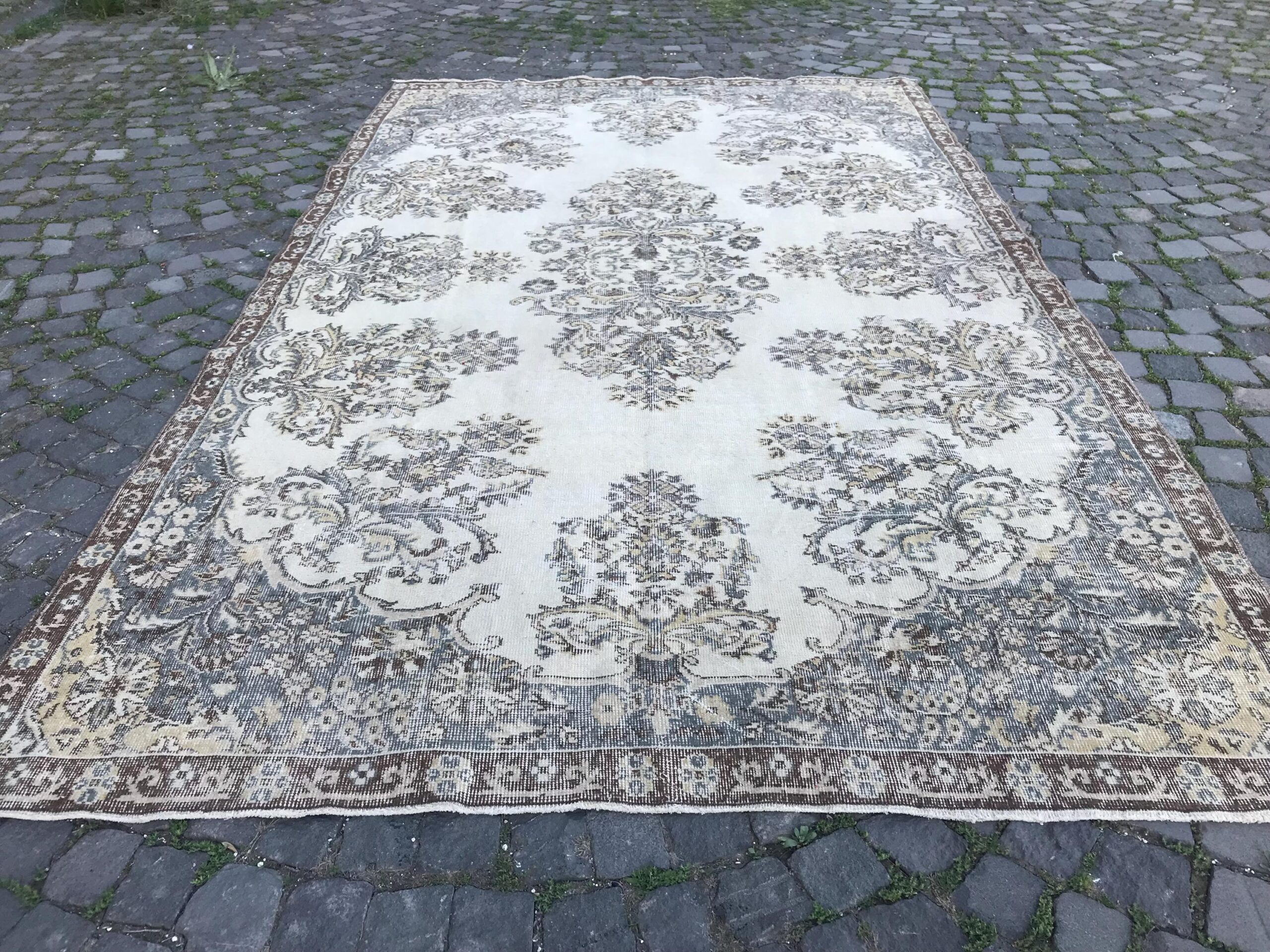 This is a vintage Turkish rug hand-knotted in a small village in Turkey by skilled Anatolian women during around the 1980s. It is made from natural wool (sheep) and dyed using all-natural (vegetable) dyes. Natural materials are more durable than synthetic materials guaranteeing a rug that can last for years while natural dyes provide colors that gets more beautiful as years pass by especially when in direct sunlight.