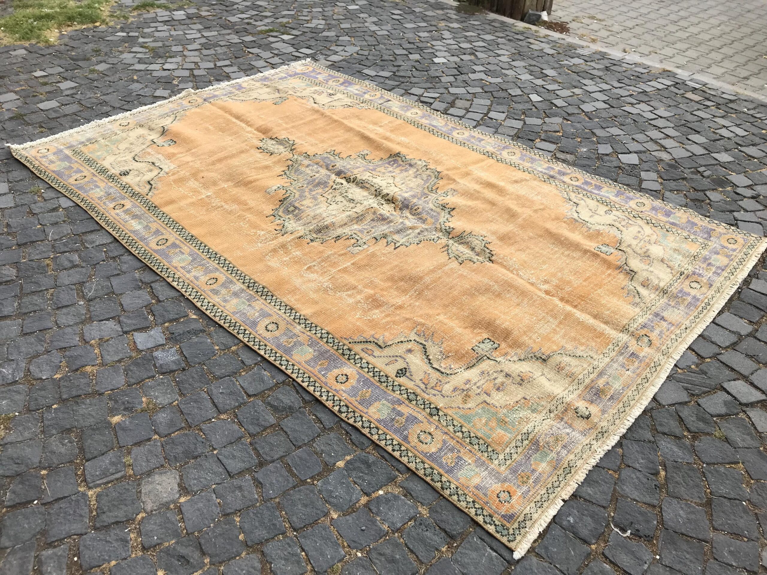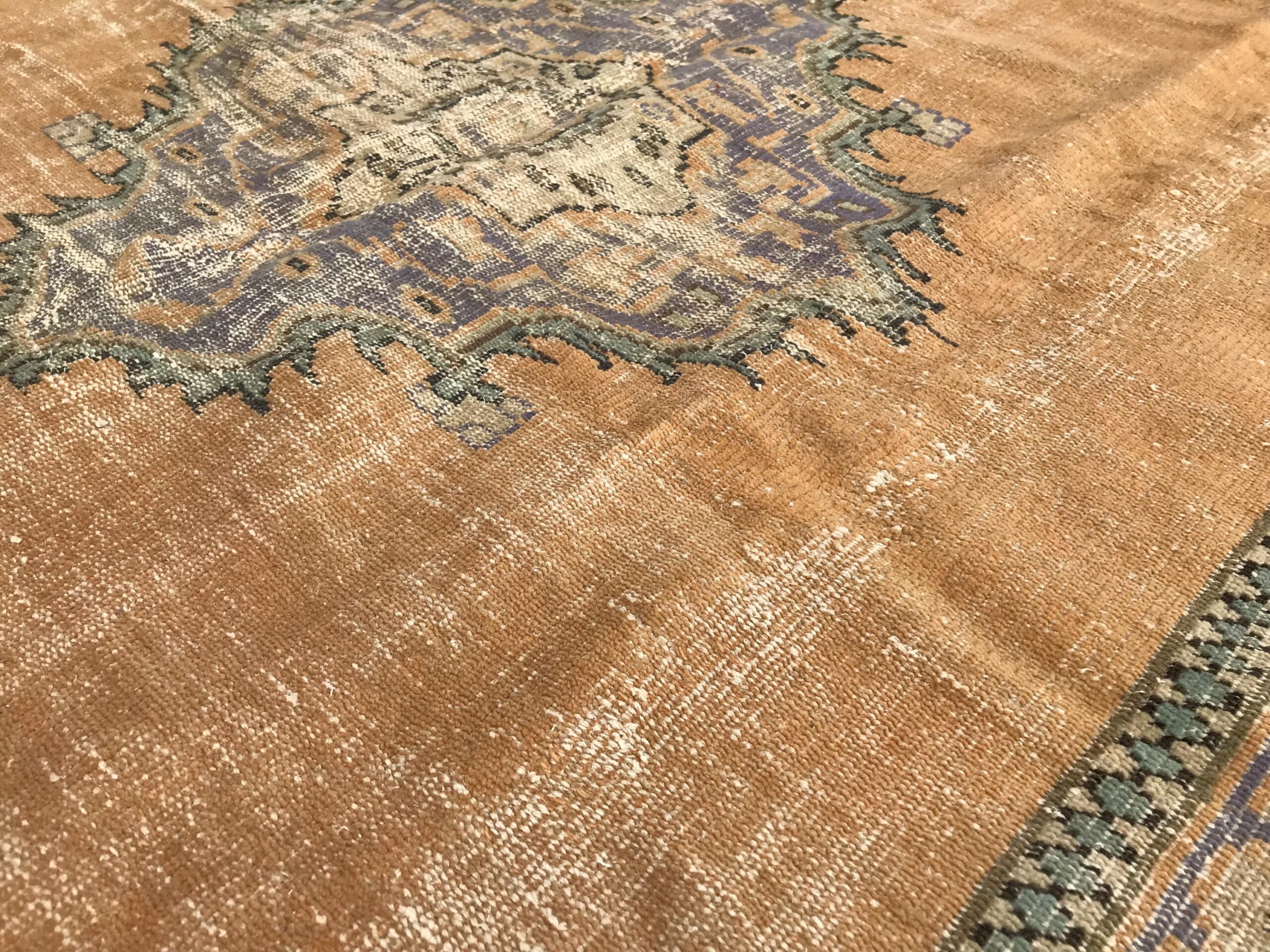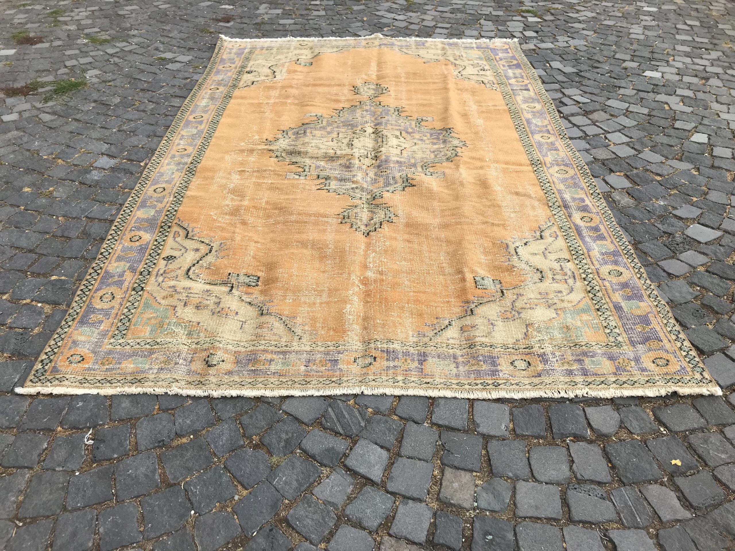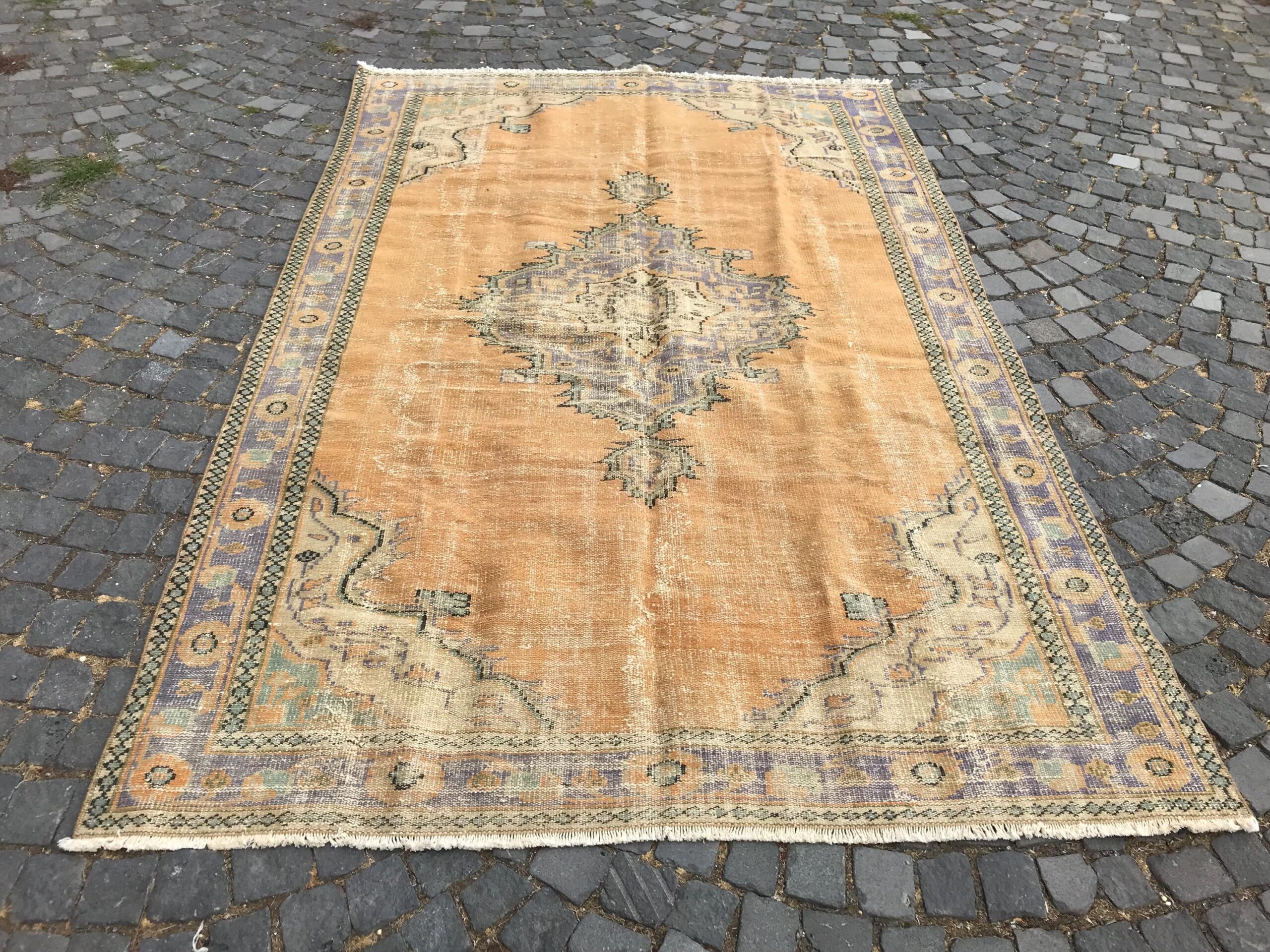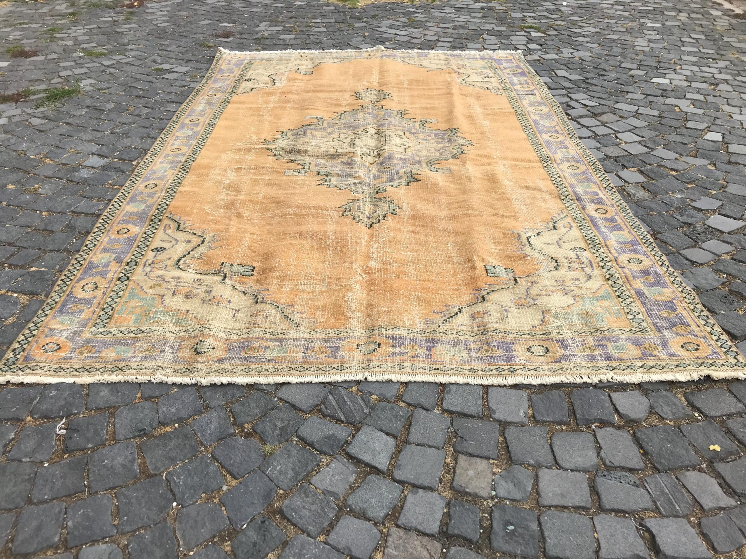 This is a vintage Turkish rug hand-knotted in a small village in Turkey by skilled Anatolian women during around the 1980s. It is made from natural wool (sheep) and dyed using all-natural (vegetable) dyes. Natural materials are more durable than synthetic materials guaranteeing a rug that can last for years while natural dyes provide colors that gets more beautiful as years pass by especially when in direct sunlight.