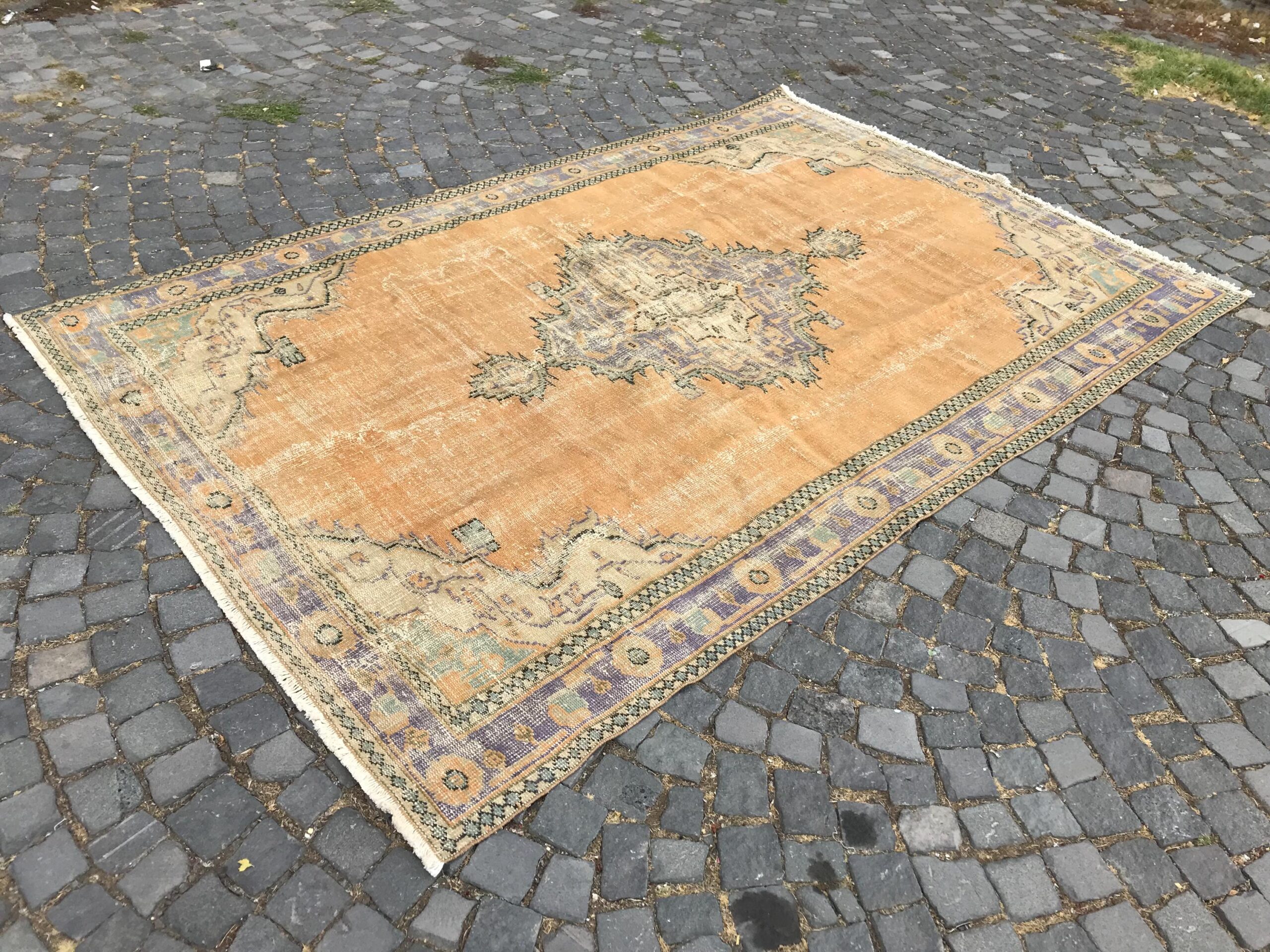 Lovely and unique 6.6 ft. x 9.7 ft. (200 cm x 295 cm) vintage Turkish rug hand-knotted in Turkey from organic wool. This is an authentic vintage Turkish rug from the 1980s that has worn beautifully to perfection.