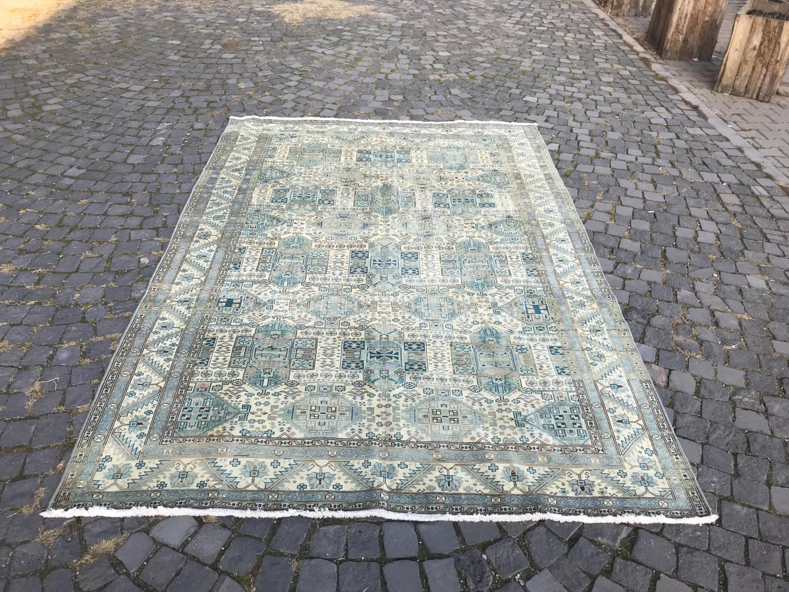 Lovely and unique 6.7 ft. x 9.7 ft. (203 cm x 295 cm) vintage Turkish rug hand-knotted in Turkey from organic wool. This is an authentic vintage Turkish rug from the 1980s that has worn beautifully to perfection.
