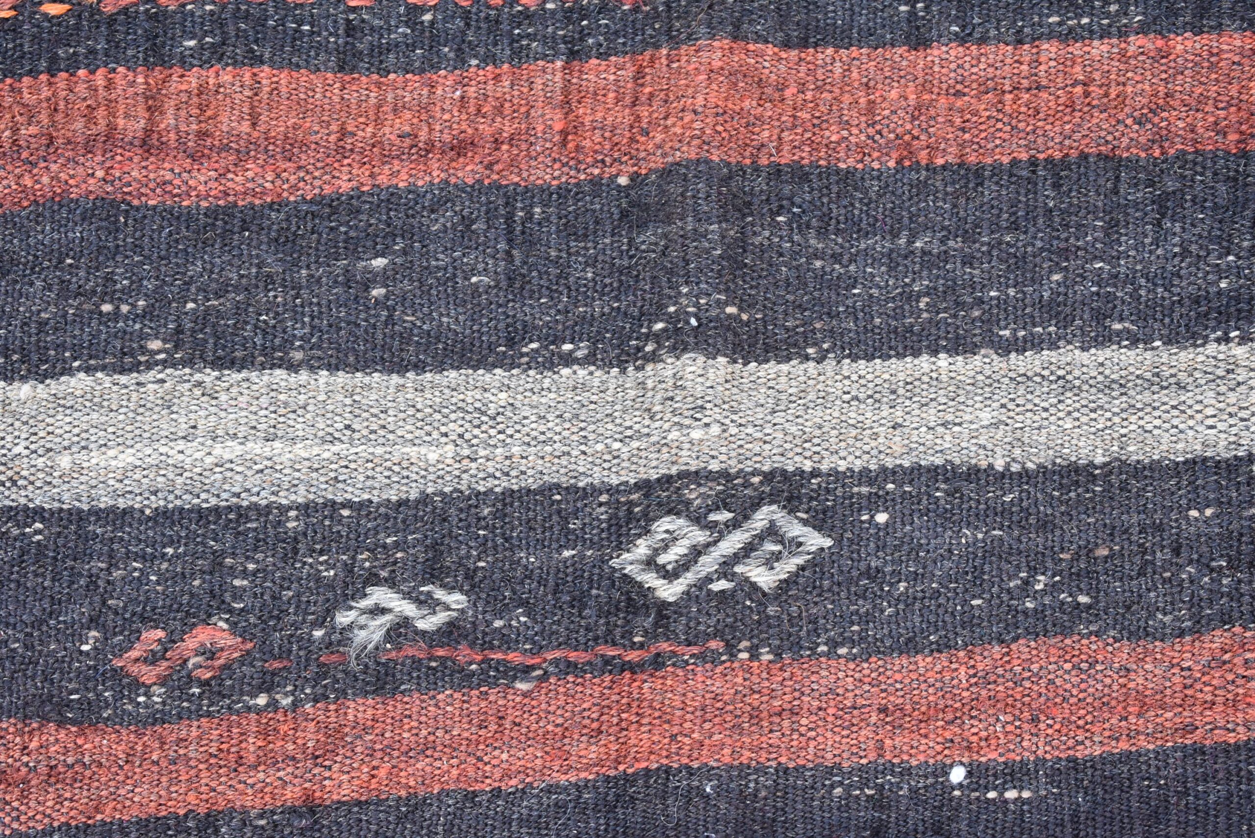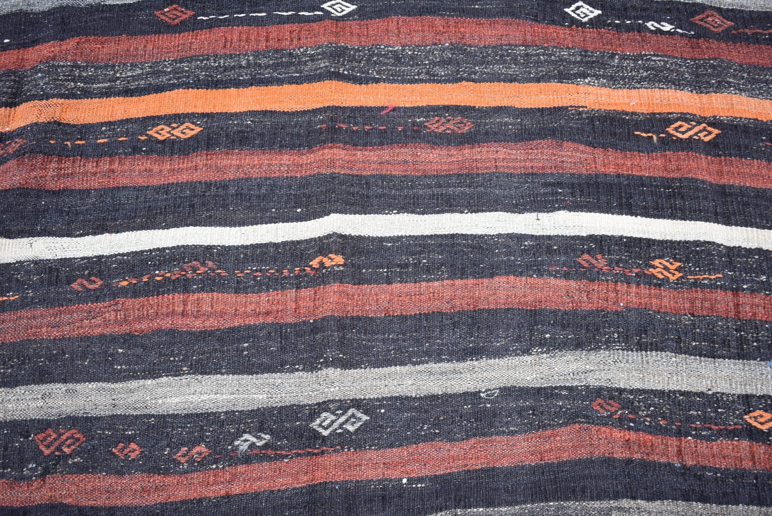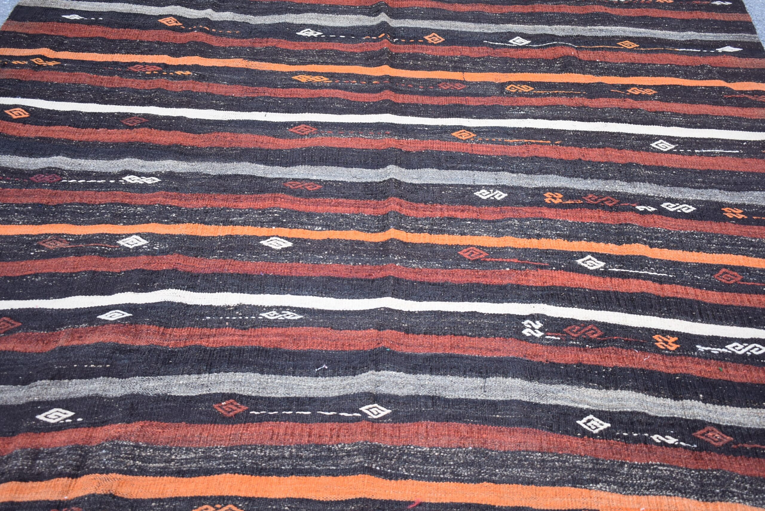 This is a vintage kilim rug hand-woven in a small village in Turkey by skilled Anatolian women during around the 1970s. It is made from natural wool (sheep) and dyed using all-natural (vegetable) dyes. Natural materials are more durable than synthetic materials guaranteeing a rug that can last for years while natural dyes provide colors that gets more beautiful as years pass by especially when in direct sunlight.