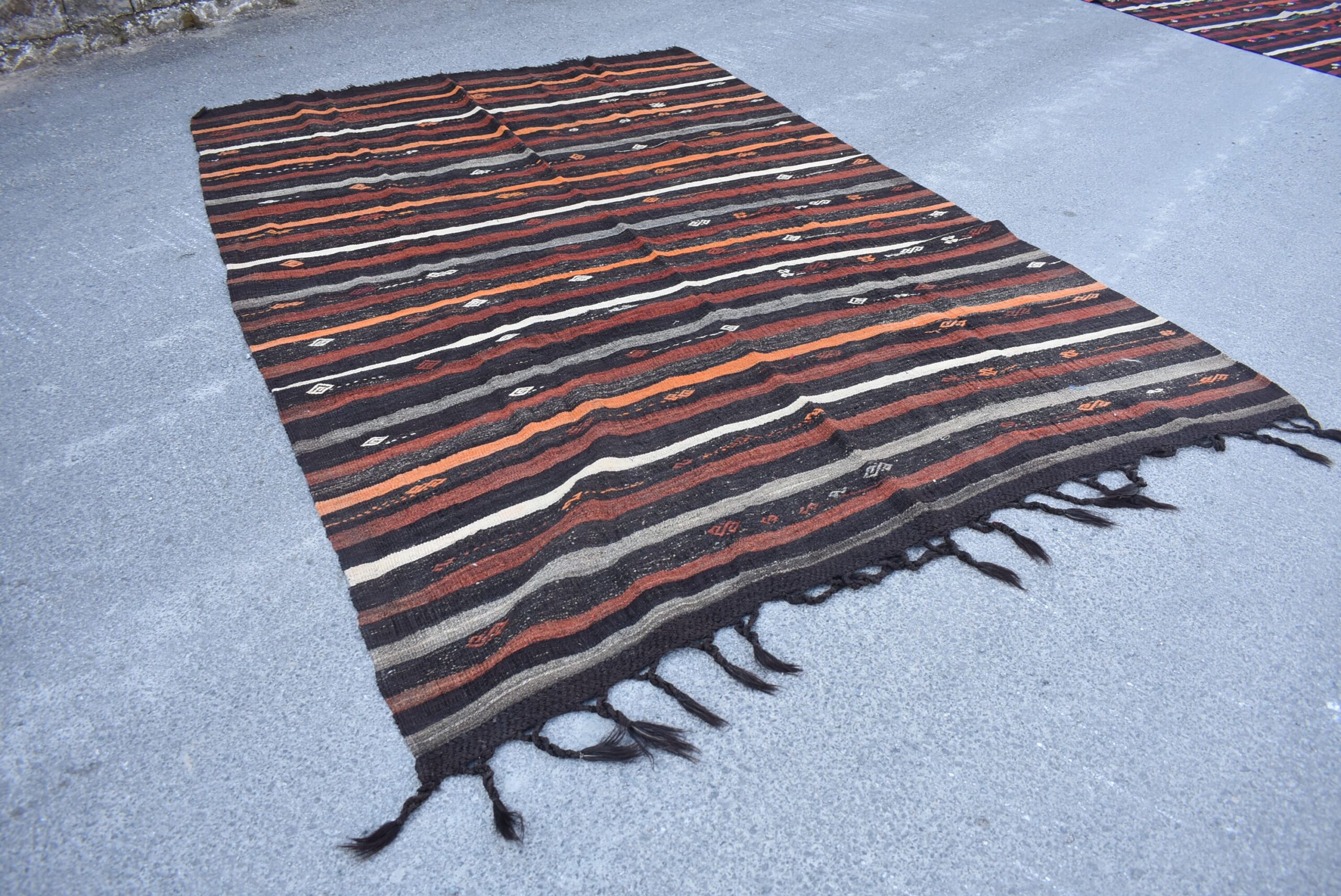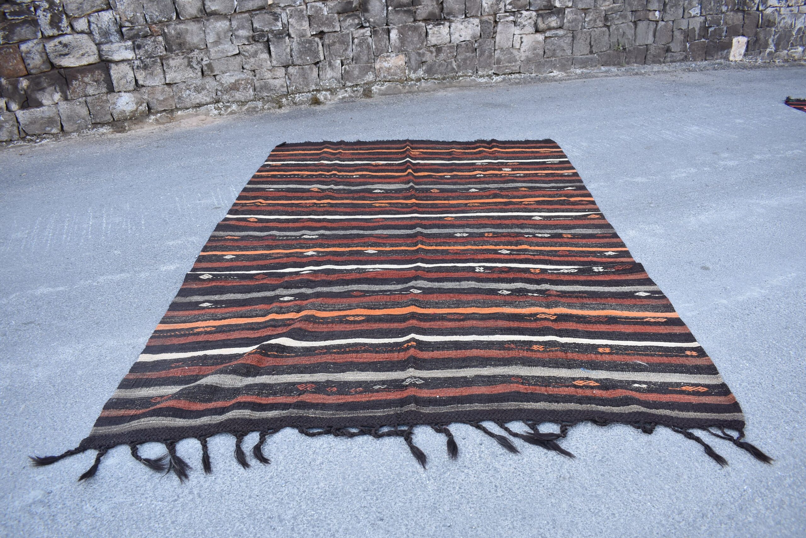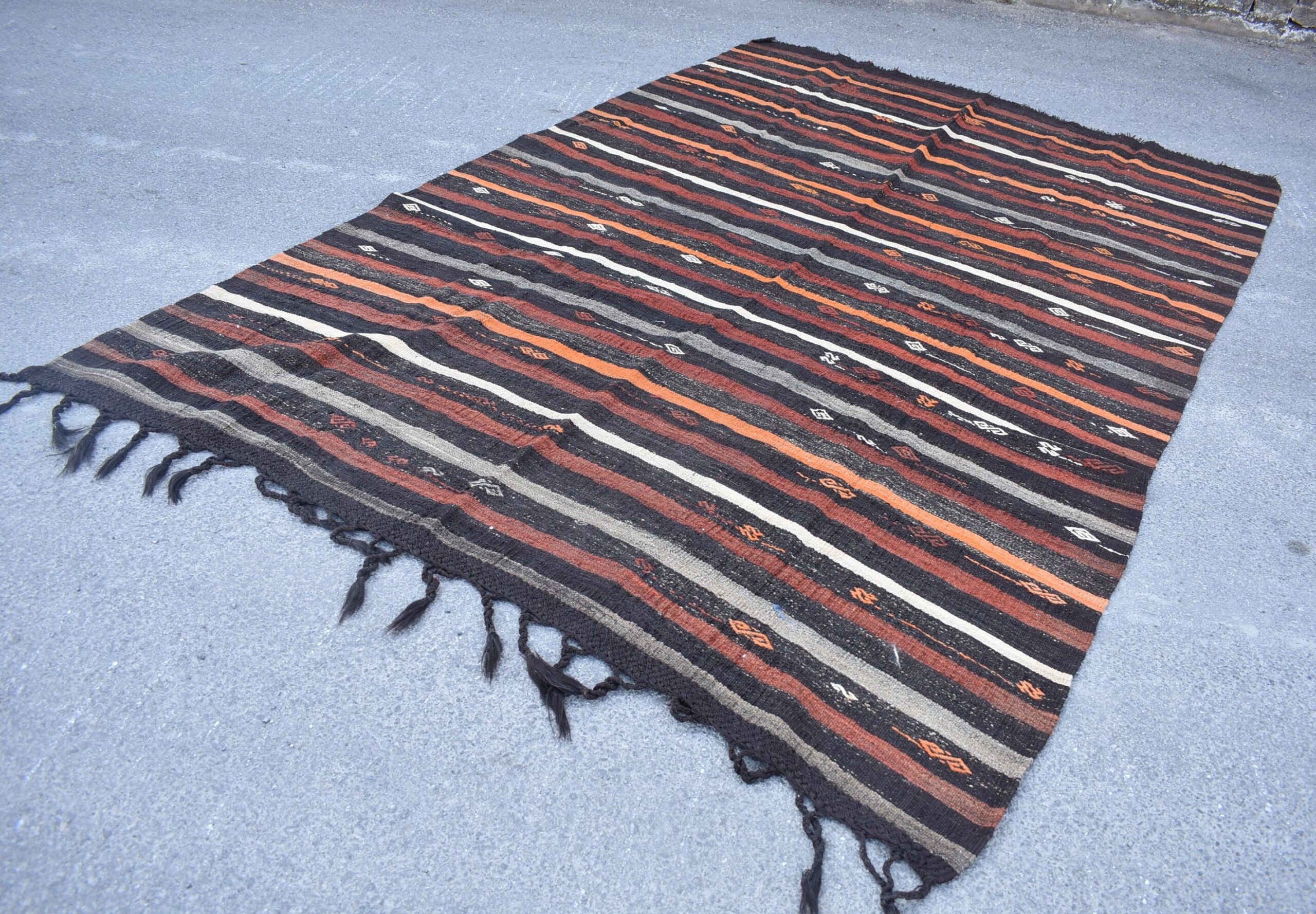 This is a vintage kilim rug hand-woven in a small village in Turkey by skilled Anatolian women during around the 1970s. It is made from natural wool (sheep) and dyed using all-natural (vegetable) dyes. Natural materials are more durable than synthetic materials guaranteeing a rug that can last for years while natural dyes provide colors that gets more beautiful as years pass by especially when in direct sunlight.