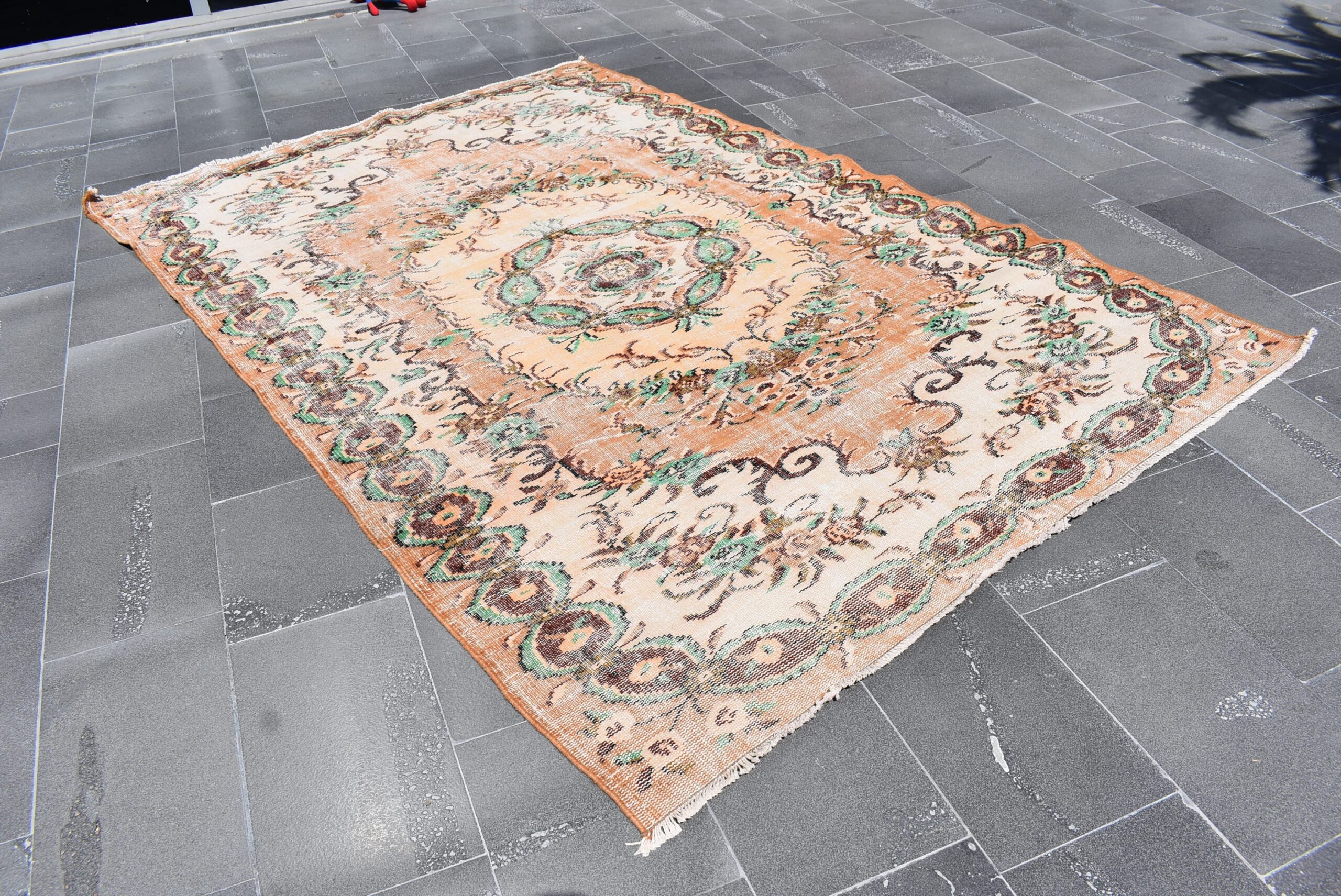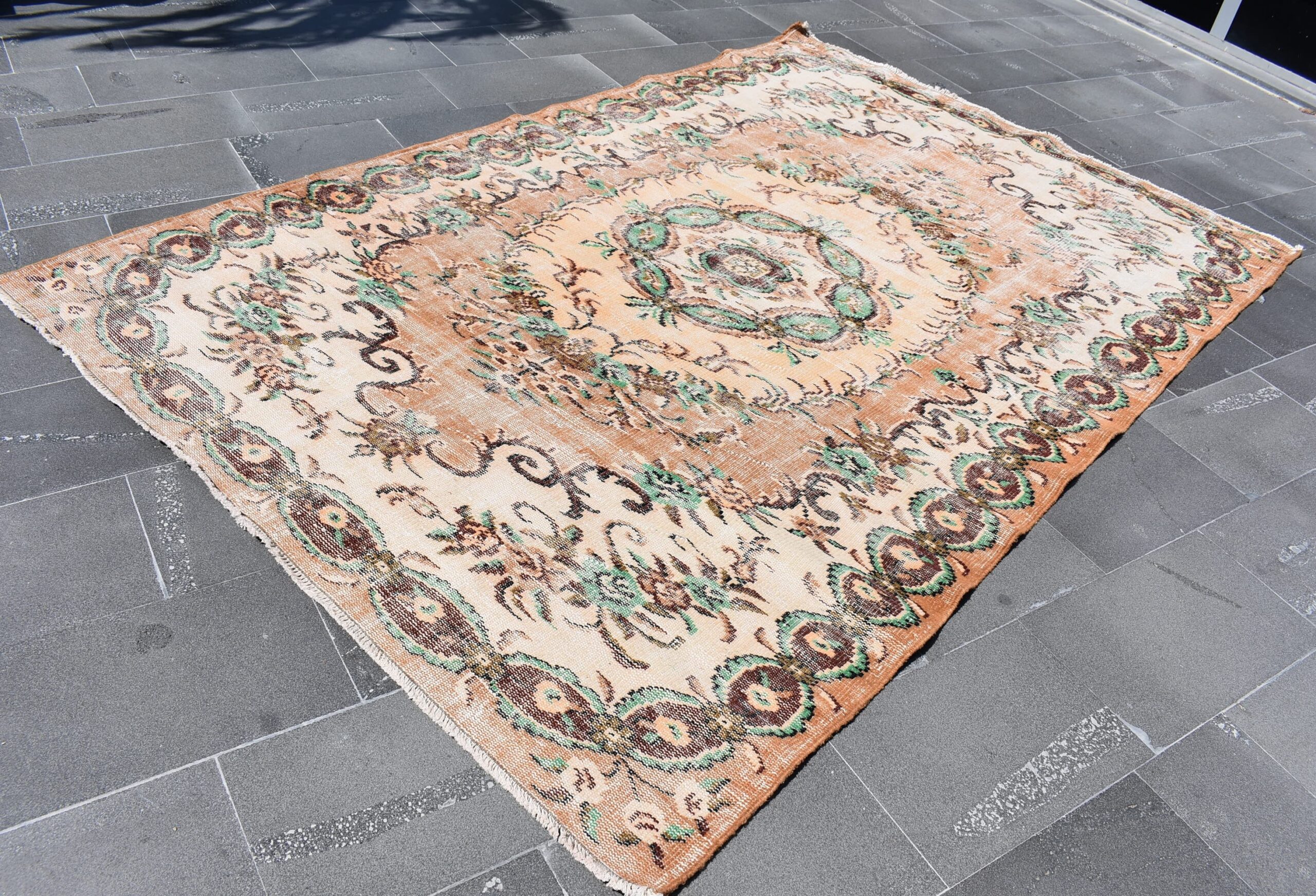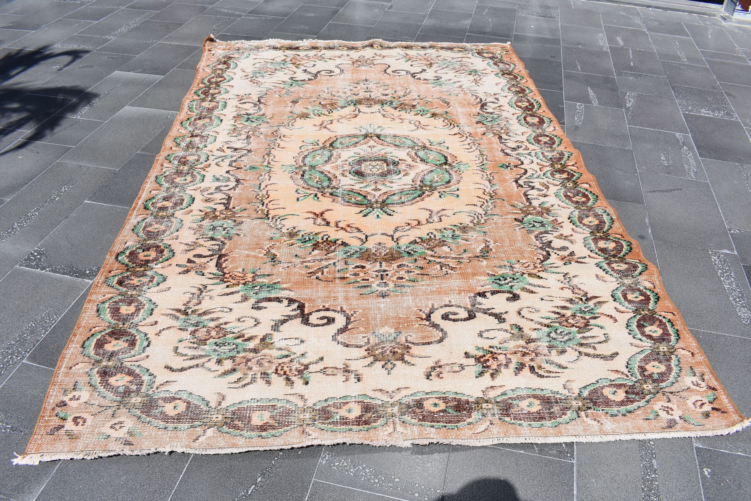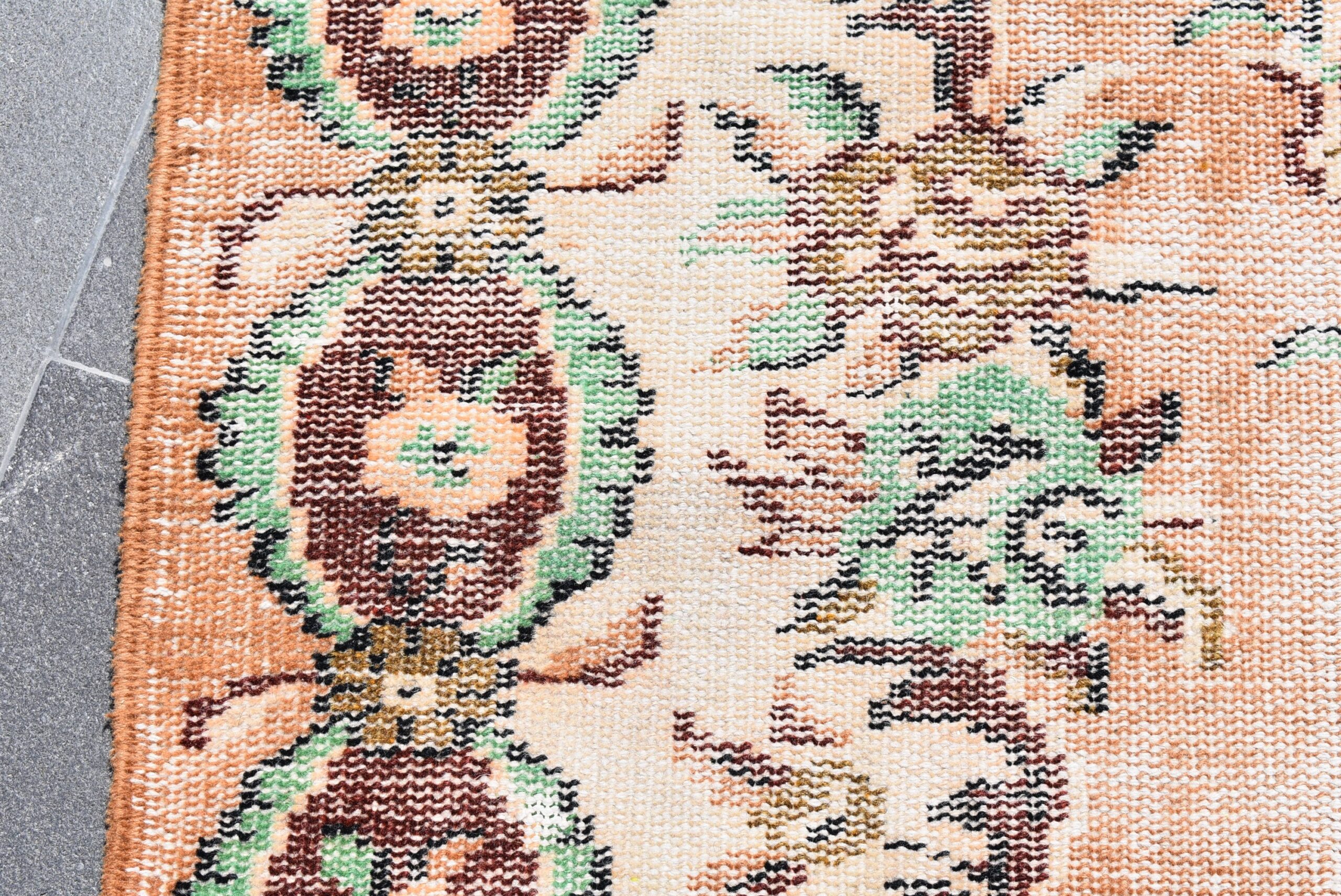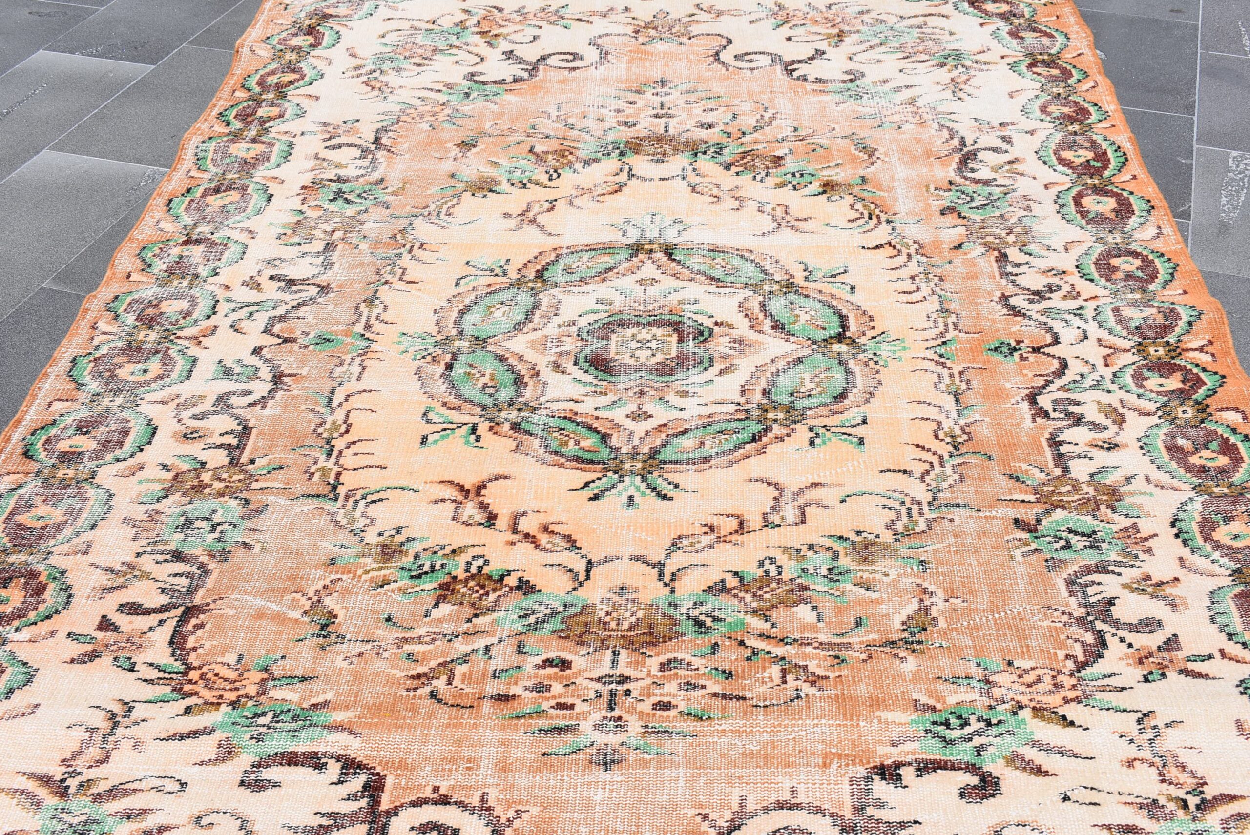 This is a vintage Turkish rug hand-knotted in a small village in Turkey by skilled Anatolian women during around the 1980s. It is made from natural wool (sheep) and dyed using all-natural (vegetable) dyes. Natural materials are more durable than synthetic materials guaranteeing a rug that can last for years while natural dyes provide colors that gets more beautiful as years pass by especially when in direct sunlight.