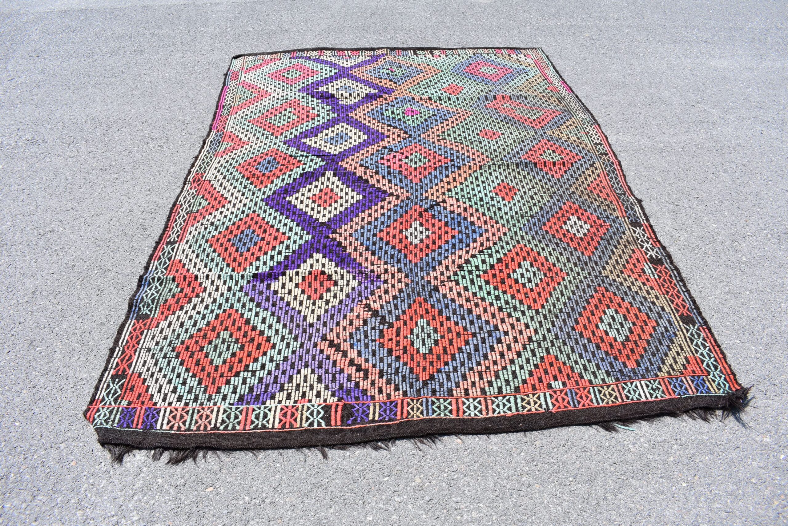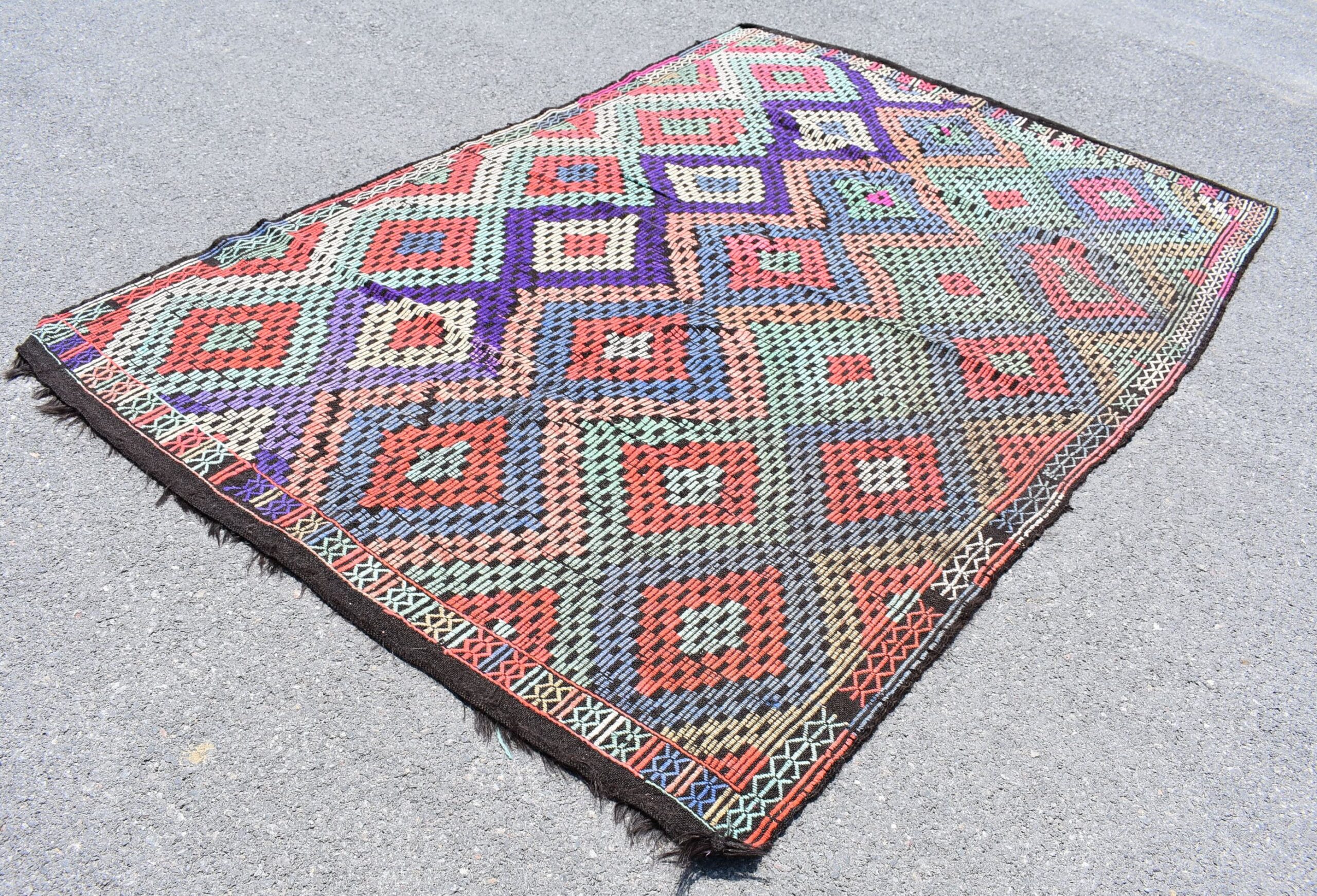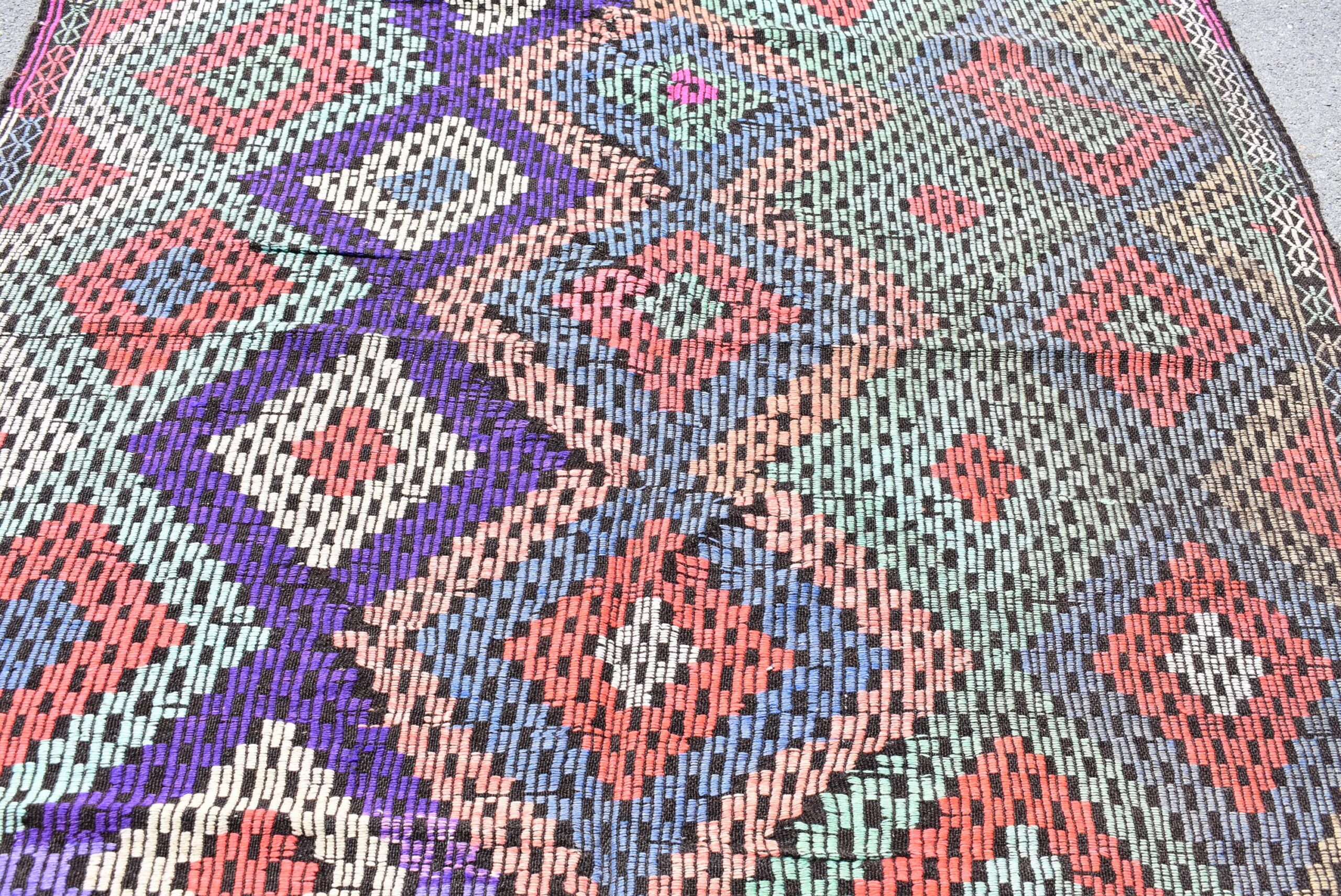 This is a vintage kilim rug hand-woven in a small village in Turkey by skilled Anatolian women during around the 1970s. It is made from natural wool (sheep) and dyed using all-natural (vegetable) dyes. Natural materials are more durable than synthetic materials guaranteeing a rug that can last for years while natural dyes provide colors that gets more beautiful as years pass by especially when in direct sunlight.