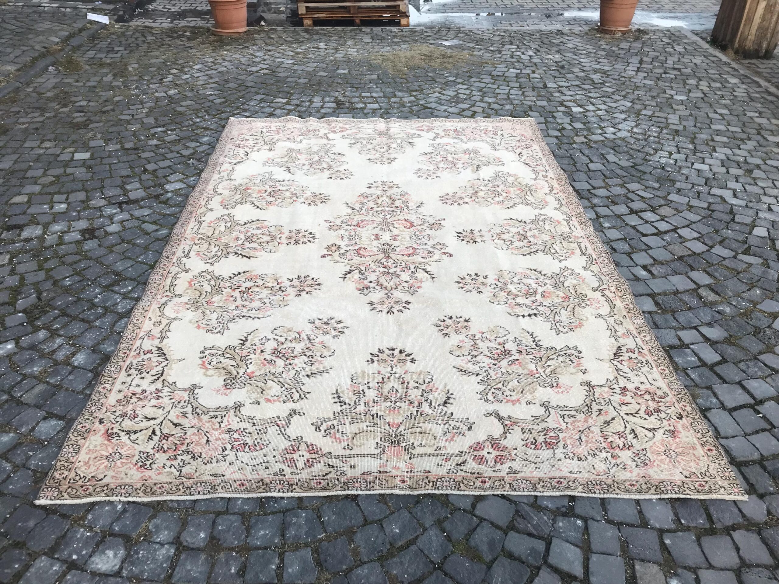 This is a vintage Turkish rug hand-knotted in a small village in Turkey by skilled Anatolian women during around the 1980s. It is made from natural wool (sheep) and dyed using all-natural (vegetable) dyes. Natural materials are more durable than synthetic materials guaranteeing a rug that can last for years while natural dyes provide colors that gets more beautiful as years pass by especially when in direct sunlight.