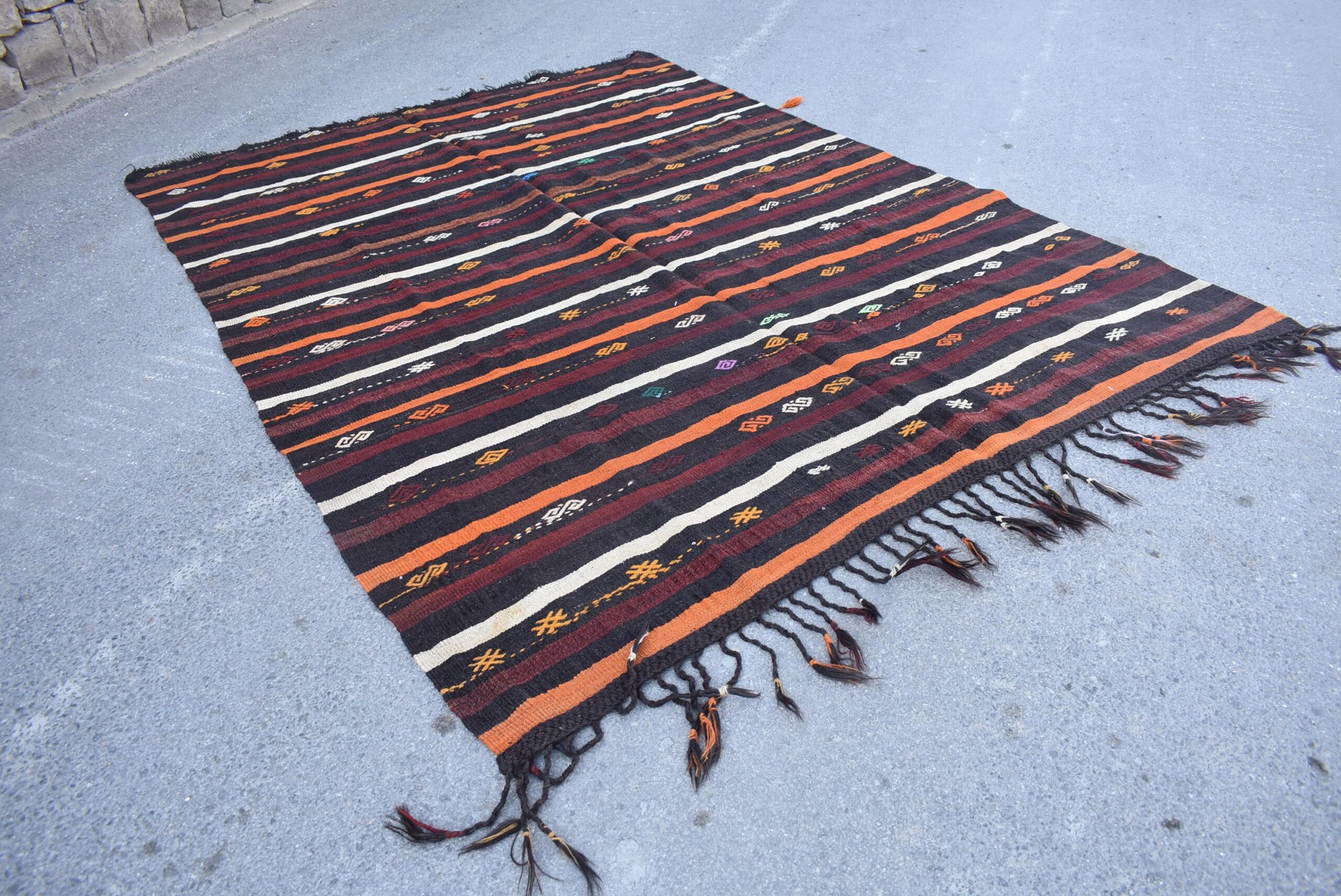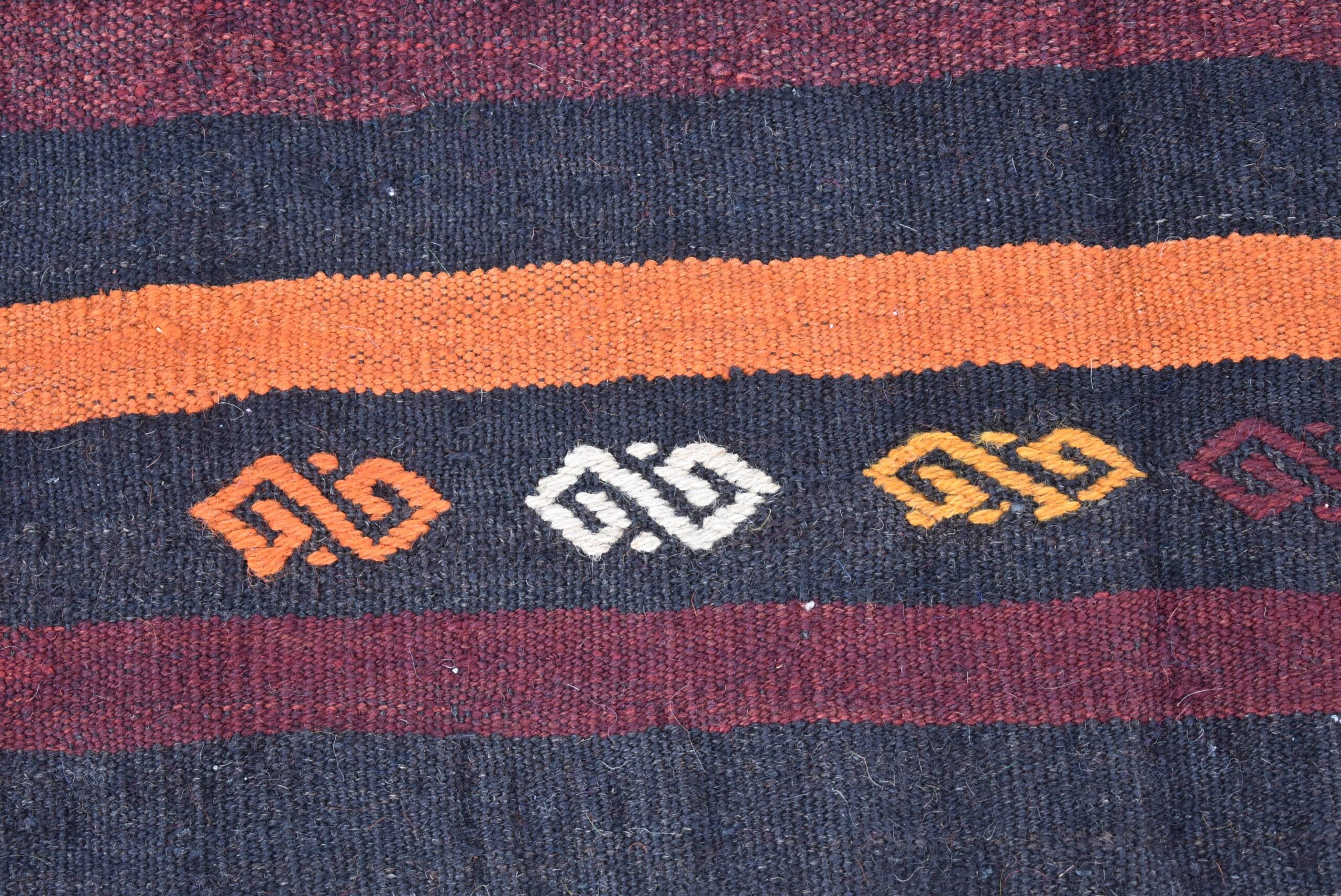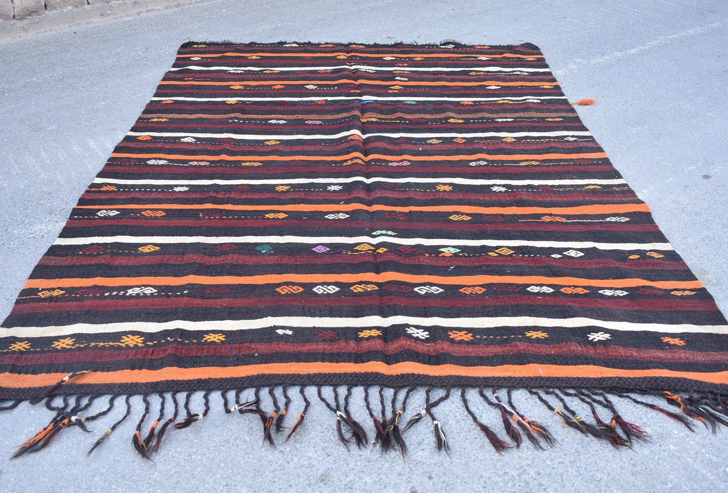 This is a vintage kilim rug hand-woven in a small village in Turkey by skilled Anatolian women during around the 1970s. It is made from natural wool (sheep) and dyed using all-natural (vegetable) dyes. Natural materials are more durable than synthetic materials guaranteeing a rug that can last for years while natural dyes provide colors that gets more beautiful as years pass by especially when in direct sunlight.