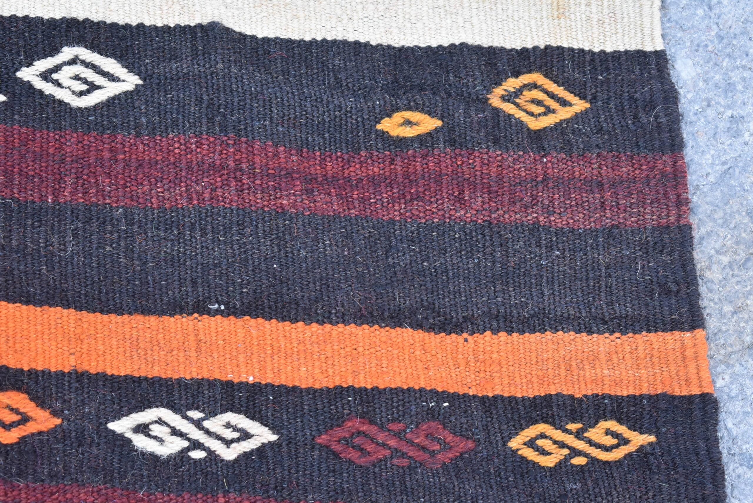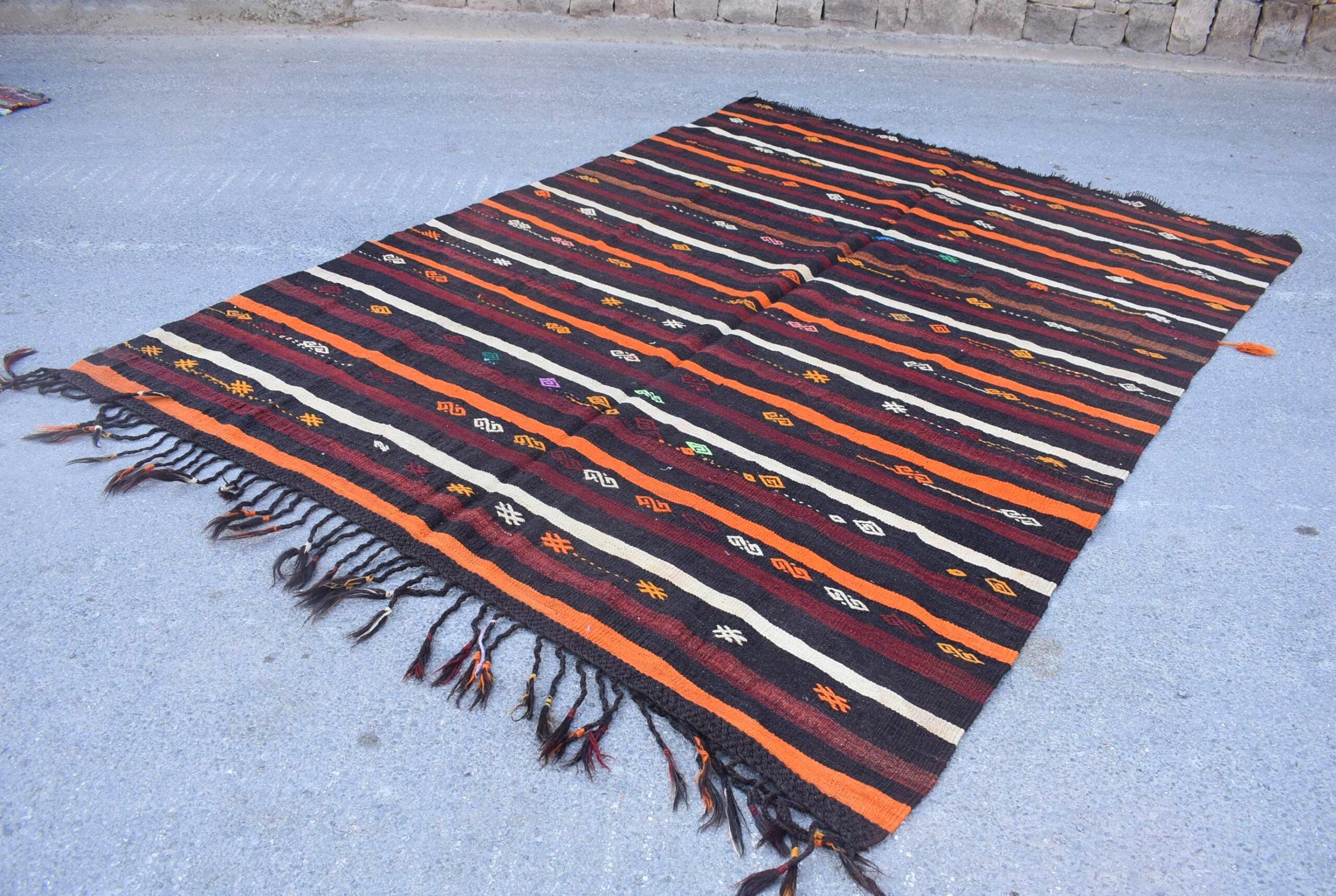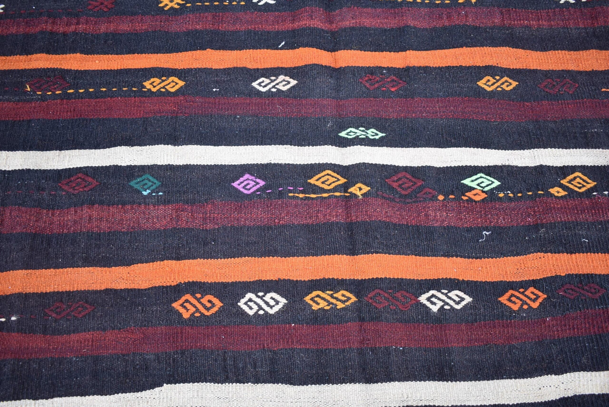 This is a vintage kilim rug hand-woven in a small village in Turkey by skilled Anatolian women during around the 1970s. It is made from natural wool (sheep) and dyed using all-natural (vegetable) dyes. Natural materials are more durable than synthetic materials guaranteeing a rug that can last for years while natural dyes provide colors that gets more beautiful as years pass by especially when in direct sunlight.