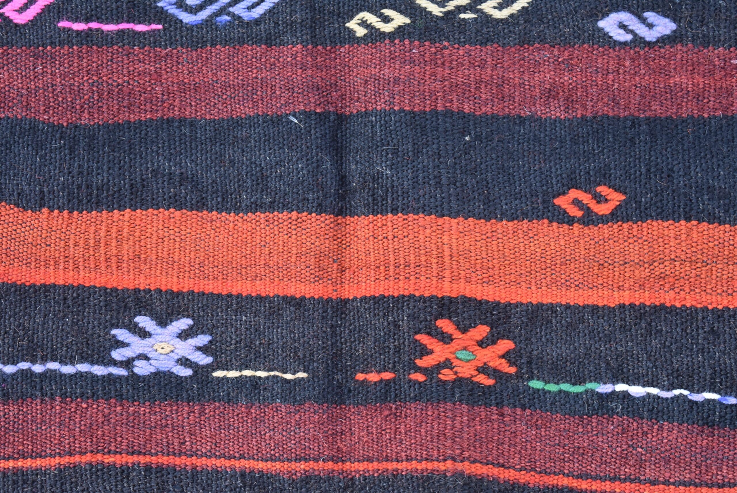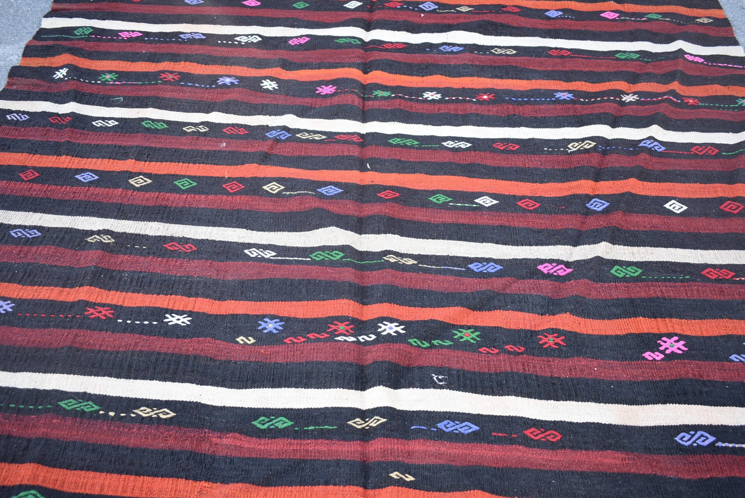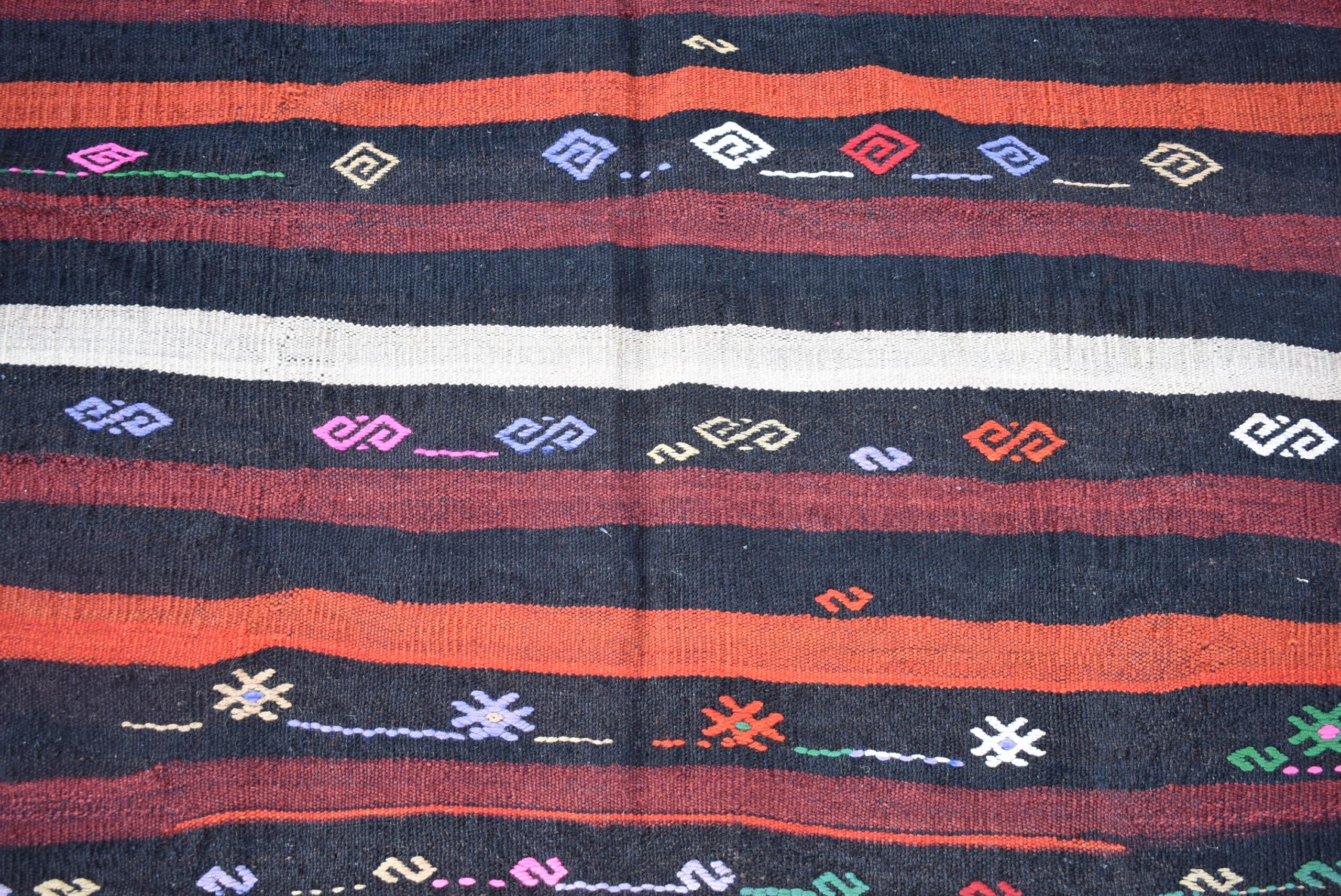 This is a vintage kilim rug hand-woven in a small village in Turkey by skilled Anatolian women during around the 1970s. It is made from natural wool (sheep) and dyed using all-natural (vegetable) dyes. Natural materials are more durable than synthetic materials guaranteeing a rug that can last for years while natural dyes provide colors that gets more beautiful as years pass by especially when in direct sunlight.
