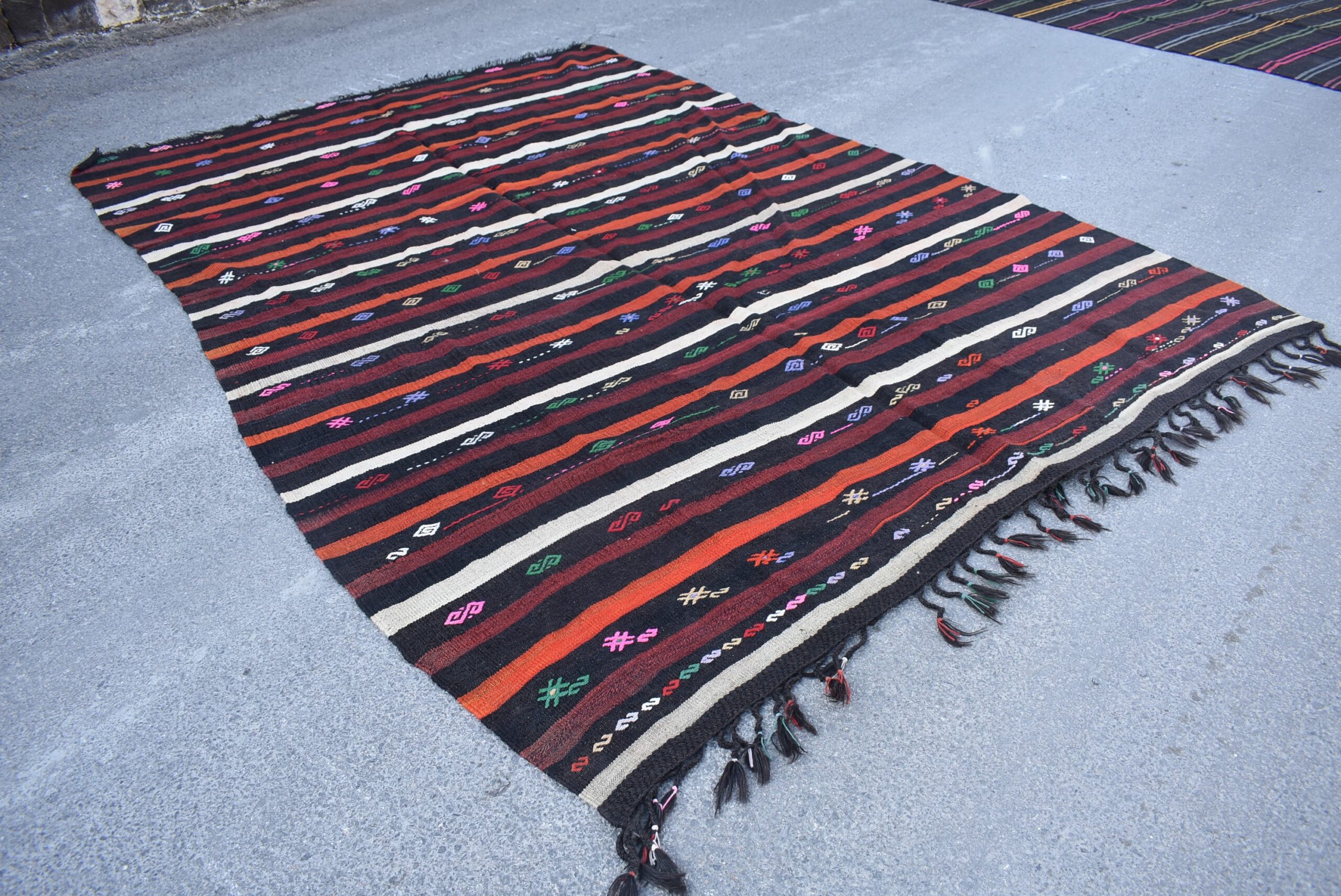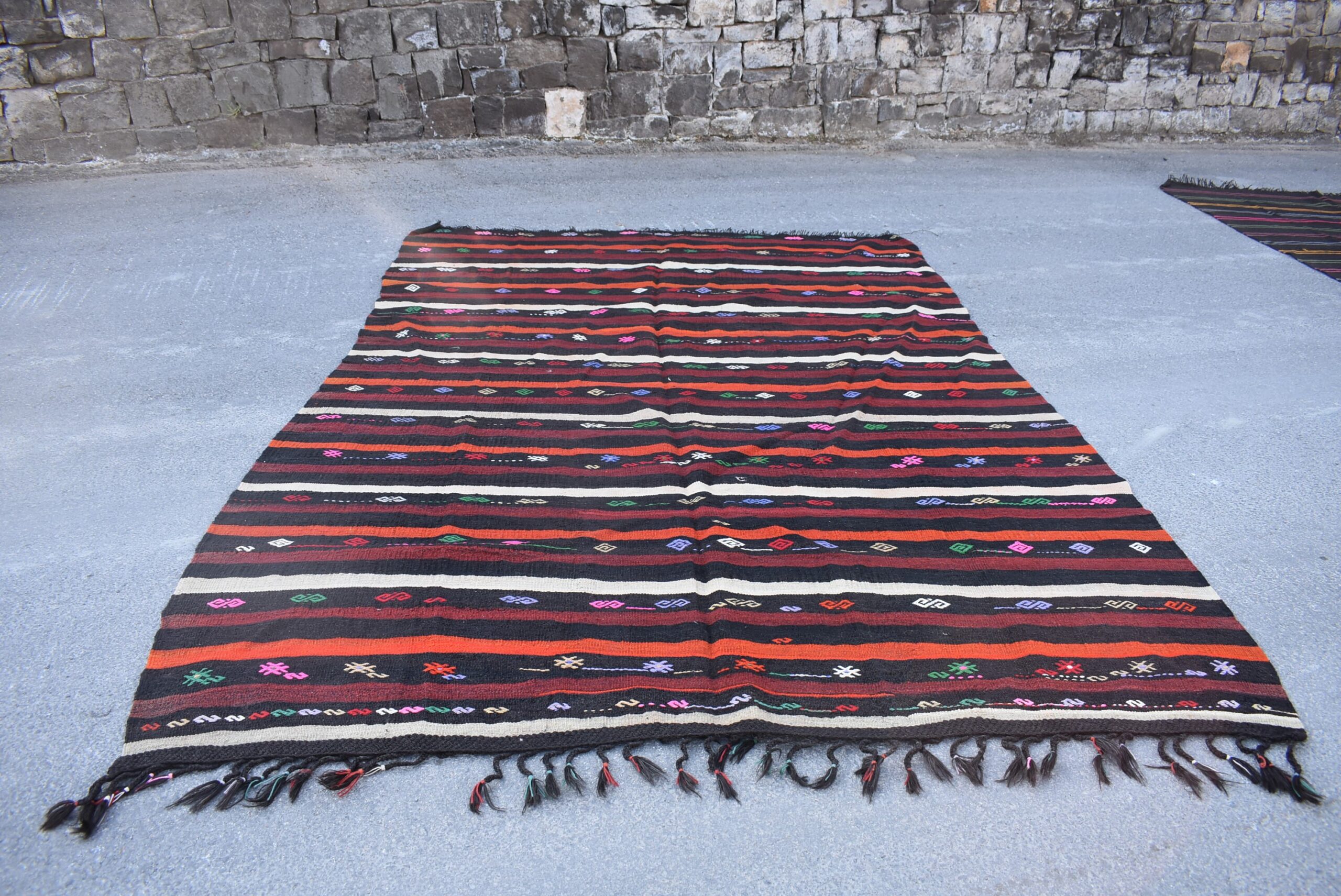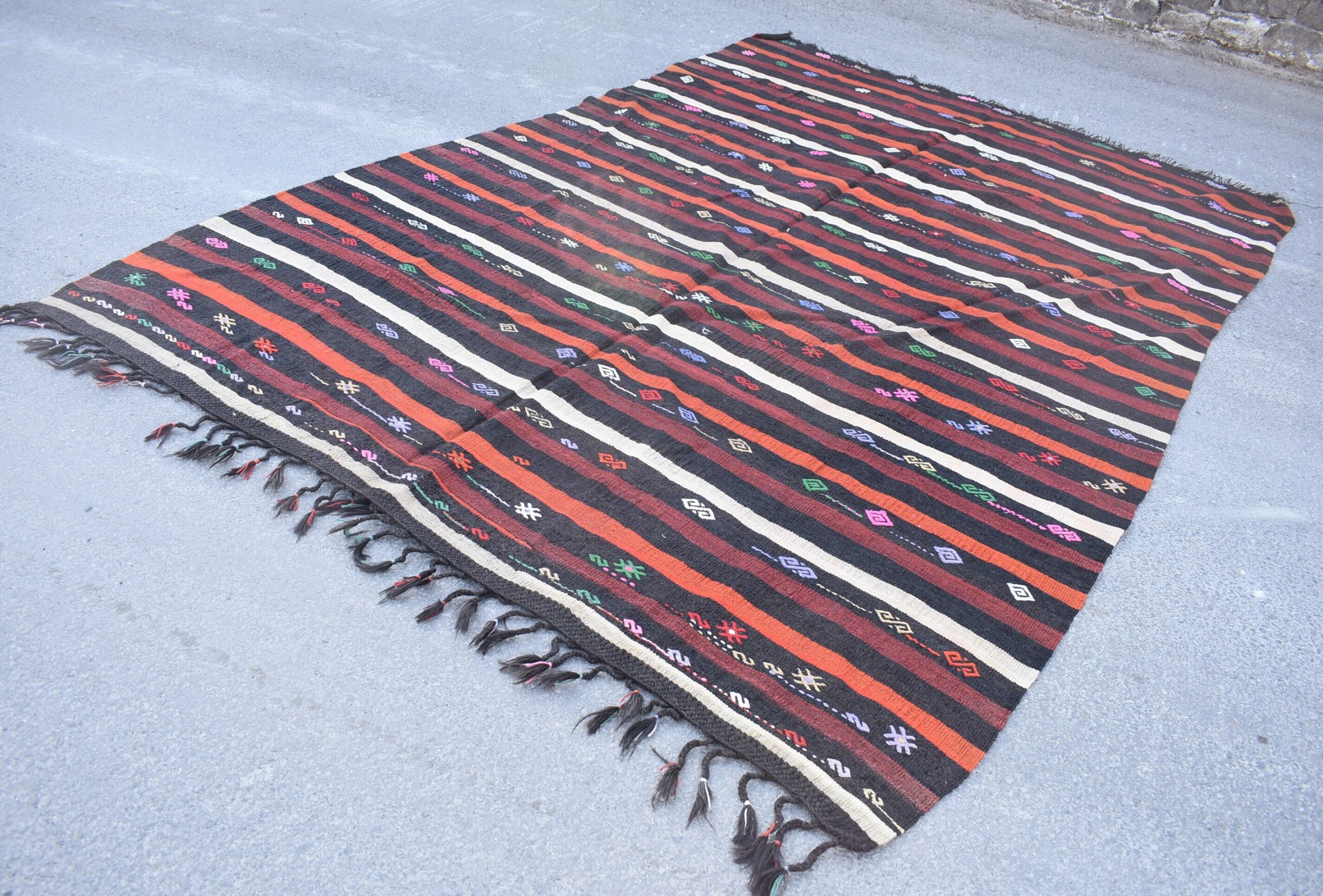 This is a vintage kilim rug hand-woven in a small village in Turkey by skilled Anatolian women during around the 1970s. It is made from natural wool (sheep) and dyed using all-natural (vegetable) dyes. Natural materials are more durable than synthetic materials guaranteeing a rug that can last for years while natural dyes provide colors that gets more beautiful as years pass by especially when in direct sunlight.